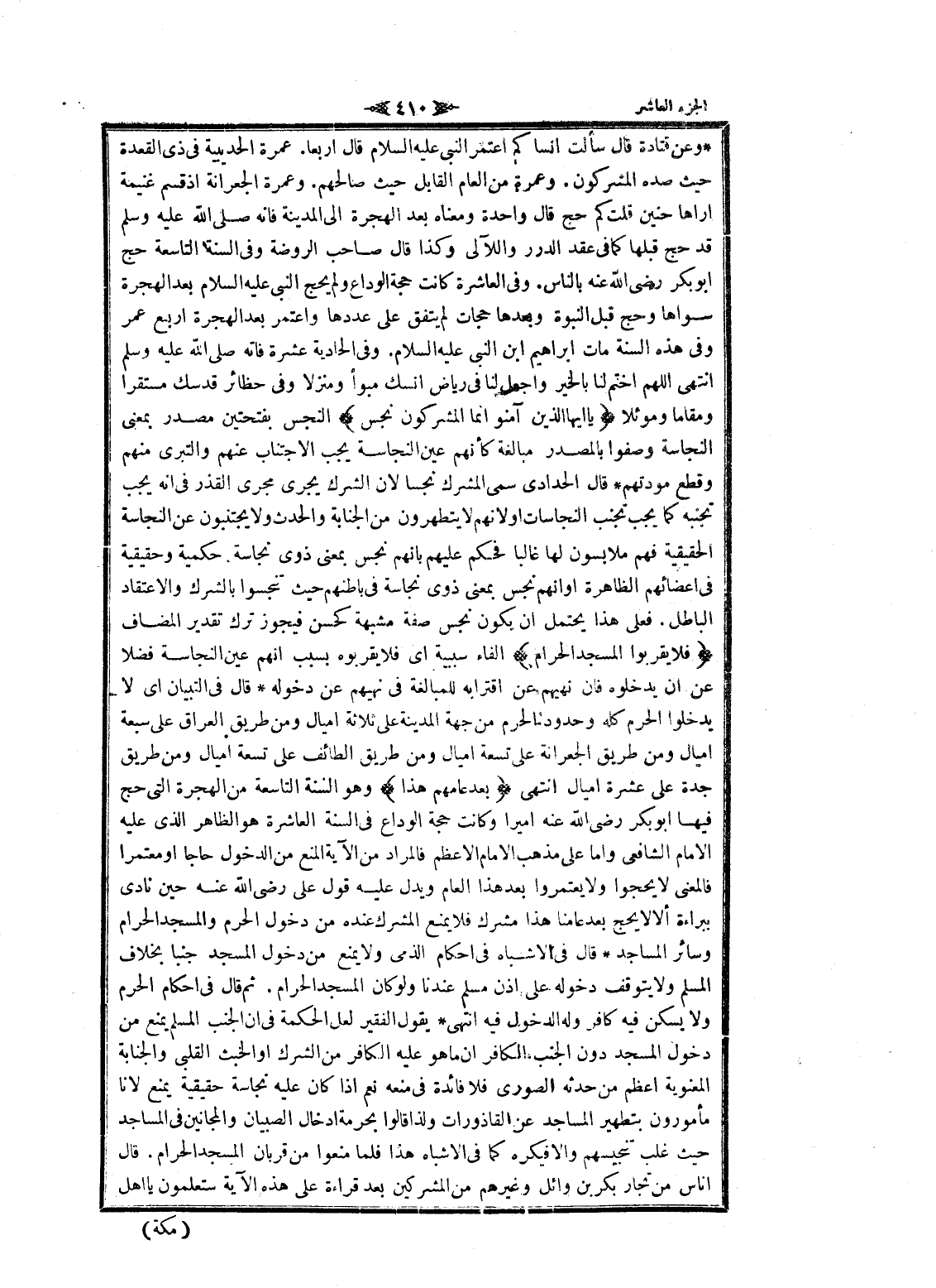وعن قتادة قال سألت انساكم اعتمر النبي عليه السلام قال أربعا. عمرة الحديبية فى ذى القعدة حيث صده المشركون. وعمرة من العام القابل حيث صالحهم. وعمرة الجعرانة إذ قسم غنيمة أراها حنين قلت كم حج قال واحدة ومعناه بعد الهجرة الى المدينة فانه صلى الله عليه وسلم قد حج قبلها كما فى عقد الدرر واللآلى وكذا قال صاحب الروضة وفى السنة التاسعة حج أبو بكر رضى الله عنه بالناس. وفى العاشرة كانت حجة الوداع ولم يحج النبي عليه السلام بعد الهجرة سواها وحج قبل النبوة وبعدها حجات لم يتفق على عددها واعتمر بعد الهجرة اربع عمر وفى هذه السنة مات ابراهيم ابن النبي عليه السلام. وفى الحادية عشرة فاته صلى الله عليه وسلم انتهى اللهم اختم لنا بالخير واجعل لنا فى رياض انسك مبوأ ومنزلا وفى حظائر قدسك مستقرا ومقاما وموئلا يا أَيُّهَا الَّذِينَ آمَنُوا إِنَّمَا الْمُشْرِكُونَ نَجَسٌ النجس بفتحتين مصدر بمعنى النجاسة وصفوا بالمصدر مبالغة كأنهم عين النجاسة يجب الاجتناب عنهم والتبري منهم وقطع مودتهم قال الحدادي سمى المشرك نجسا لان الشرك يجرى مجرى القذر فى انه يجب تجنبه كما يجب تجنب النجاسات او لانهم لا يتطهرون من الجنابة والحدث ولا يجتنبون عن النجاسة الحقيقية فهم ملابسون لها غالبا فحكم عليهم بانهم نجس بمعنى ذوى نجاسة. حكمية وحقيقية فى أعضائهم الظاهرة او انهم نجس بمعنى ذوى نجاسة فى باطنهم حيث تنجسوا بالشرك والاعتقاد الباطل. فعلى هذا يحتمل ان يكون نجس صفة مشبهة كحسن فيجوز ترك تقدير المضاف فَلا يَقْرَبُوا الْمَسْجِدَ الْحَرامَ الفاء سببية اى فلا يقربوه بسبب انهم عين النجاسة فضلا عن ان يدخلوه فان نهيهم عن اقترابه للمبالغة فى نهيهم عن دخوله قال فى التبيان اى لا يدخلوا الحرم كله وحدود الحرم من جهة المدينة على ثلاثة أميال ومن طريق العراق على سبعة أميال ومن طريق الجعرانة على تسعة أميال ومن طريق الطائف على تسعة أميال ومن طريق جدة على عشرة أميال انتهى بَعْدَ عامِهِمْ هذا وهو السنة التاسعة من الهجرة التي حج فيها أبو بكر رضى الله عنه أميرا وكانت حجة الوداع فى السنة العاشرة هو الظاهر الذي عليه الامام الشافعي واما على مذهب الامام الأعظم فالمراد من الآية المنع من الدخول حاجا او معتمرا فالمعنى لا يحجوا ولا يعتمروا بعد هذا العام ويدل عليه قول على رضى الله عنه حين نادى ببراءة ألا لا يحج بعد عامنا هذا مشرك فلا يمنع المشرك عنده من دخول الحرم والمسجد الحرام وساتر المساجد قال فى الأشباه فى احكام الذمي ولا يمنع من دخول المسجد جنبا بخلاف المسلم ولا يتوقف دخوله على اذن مسلم عندنا ولو كان المسجد الحرام. ثم قال فى احكام الحرم ولا يسكن فيه كافر وله الدخول فيه انتهى يقول الفقير لعل الحكمة فى ان الجنب المسلم يمنع من دخول المسجد دون الجنب الكافر ان ما هو عليه الكافر من الشرك او الخبث القلبي والجنابة المعنوية أعظم من حدثه الصوري فلا فائدة فى منعه نعم إذا كان عليه نجاسة حقيقية يمنع لانا مأمورون بتطهير المساجد عن القاذورات ولذا قالوا بحرمة إدخال الصبيان والمجانين فى المساجد حيث غلب تنجيسهم وإلا فيكره كما فى الأشباه هذا فلما منعوا من قربان المسجد الحرام. قال أناس من تجار بكر بن وائل وغيرهم من المشركين بعد قراءة على هذه الآية ستعلمون يا اهل