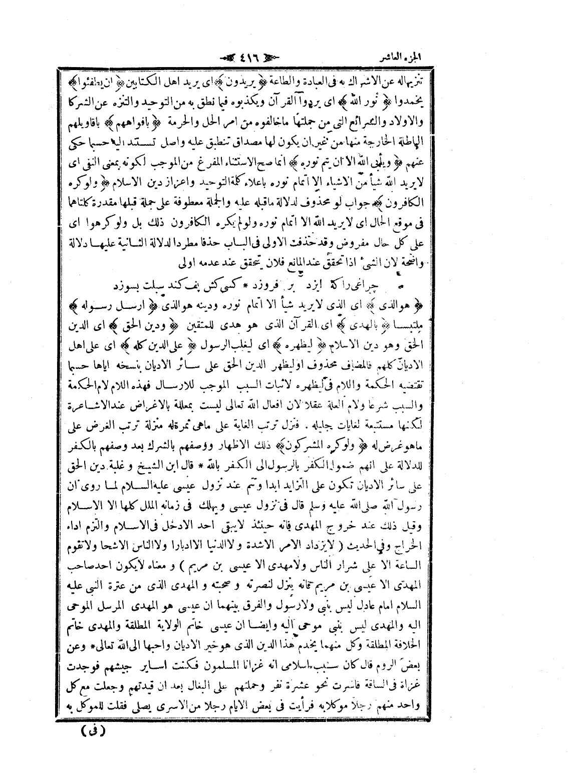 هُوَ الَّذِي اى الذي لا يريد شيأ الا إتمام نوره ودينه هو الذي أَرْسَلَ رَسُولَهُ ملتبسا بِالْهُدى اى القرآن الذي هو هدى للمتقين وَدِينِ الْحَقِّ اى الدين الحق وهو دين الإسلام لِيُظْهِرَهُ اى ليغلب الرسول عَلَى الدِّينِ كُلِّهِ اى على اهل الأديان كلهم فالمضاف محذوف او ليظهر الدين الحق على سائر الأديان بنسخه إياها حسبما تقتضيه الحكمة واللام فى ليظهره لاثبات السبب الموجب للارسال فهذه اللام لام الحكمة والسبب شرعا ولام العلة عقلا لان افعال الله تعالى ليست بمعللة بالأغراض عند الاشاعرة لكنها مستتبعة لغايات جليله. فنزل ترتب الغاية على ما هى ثمرة له منزلة ترتب الغرض على ما هو غرض له وَلَوْ كَرِهَ الْمُشْرِكُونَ ذلك الإظهار ووصفهم بالشرك بعد وصفهم بالكفر للدلالة على انهم ضموا الكفر بالرسول الى الكفر بالله قال ابن الشيخ وغلبة دين الحق على سائر الأديان تكون على التزايد ابدا وتتم عند نزول عيسى عليه السلام لما روى ان رسول الله صلى الله عليه وسلم قال فى نزول عيسى ويهلك فى زمانه الملل كلها الا الإسلام وقيل ذلك عند خروج المهدى فانه حينئذ لا يبقى أحد إلا دخل فى الإسلام والتزم أداء الخراج وفى الحديث (لا يزداد الأمر إلا شدة ولا الدنيا الا إدبارا ولا الناس الا شحا ولا تقوم الساعة الا على شرار الناس ولا مهدى الا عيسى بن مريم) ومعناه لا يكون أحد صاحب المهدى الا عيسى بن مريم فانه ينزل لنصرته وصحبته والمهدى الذي من عترة النبي عليه السلام امام عادل ليس بنبي ولا رسول والفرق بينهما ان عيسى هو المهدى المرسل الموحى اليه والمهدى ليس بنبي موحى اليه وايضا ان عيسى خاتم الولاية المطلقة والمهدى خاتم الخلافة المطلقة وكل منهما يخدم هذا الدين الذي هو خير الأديان وأحبها الى الله تعالى وعن بعض الروم قال كان سبب إسلامي انه غزانا المسلمون فكنت أساير جيشهم فوجدت غزاة فى الساقة فاسرت نحو عشرة نفر وحملتهم على البغال بعد ان قيدتهم وجعلت مع كل واحد منهم رجلا موكلابه فرأيت فى بعض الأيام رجلا من الأسرى يصلى فقلت للموكل به