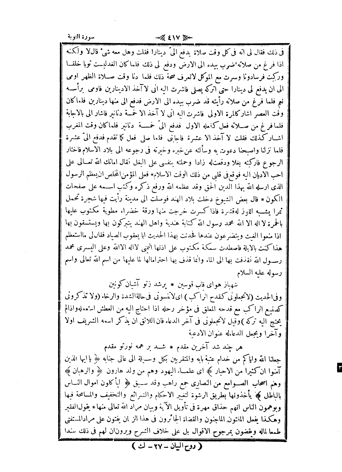 فى ذلك فقال لى انه فى كل وقت صلاة يدفع الىّ دينارا فقلت وهل معه شىء قال لا ولكنه إذا فرغ من صلاته ضرب بيده الى الأرض ودفع لى ذلك فلما كان الغد لبست ثوبا خلقا وركبت فرسادونا وسرت مع الموكل لا تعرف صحة ذلك فلما دنا وقت صلاة الظهر أومى الى ان يدفع لى دينارا حتى اتركه يصلى فاشرت اليه انى لا آخذ إلا دينارين فاومى برأسه نعم فلما فرغ من صلاته رأيته قد ضرب بيده الى الأرض فدفع الى منها دينارين فلما كان وقت العصر أشار كالمرة الاولى فاشرت اليه انى لا آخذ الا خمسة دنانير فاشار الى بالاجابة فلما فرغ من صلاته فعل كفعله الاول فدفع الىّ خمسة دنانير فلما كان وقت المغرب أشار كذلك فقلت لا آخذ الا عشرة فاجابنى فلما صلى فعل كما تقدم فدفع الىّ عشرة فلما نزلنا وأصبحنا دعوت به وسألته عن خبره وخيرته فى رجوعه الى بلاد الإسلام فاختار الرجوع فاركبته بغلا ودفعت له زادا وحملته بنفسي على البغل فقال أماتك الله تعالى على أحب الأديان اليه فوقع فى قلبى من ذلك الوقت الإسلام فعلى المؤمن المخلص ان يعظم الرسول الذي أرسله الله بهذا الدين الحق وقد عظمه الله ورفع ذكره وكتب اسمه على صفحات الكون قال بعض الشيوخ دخلت بلاد الهند فوصلت الى مدينة رأيت فيها شجرة تحمل ثمرا يشبه اللوز له قشرة فاذا كسرت خرجت منها ورقة خضراء مطوية مكتوب عليها بالحمرة لا اله الا الله محمد رسول الله كتابة هندية واهل الهند يتبركون بها ويستسقون بها إذا منعوا الغيث ويتضرعون عندها فحدثت بهذا الحديث أبا يعقوب الصياد فقال لى ما استعظم هذا كنت بالأيلة فاصطدت سمكة مكتوب على اذنها اليمنى لا اله الا الله وعلى اليسرى محمد رسول الله فقذفت بها الى الماء وانما قذف بها احتراما لها لما عليها من اسم الله تعالى واسم رسوله عليه السلام