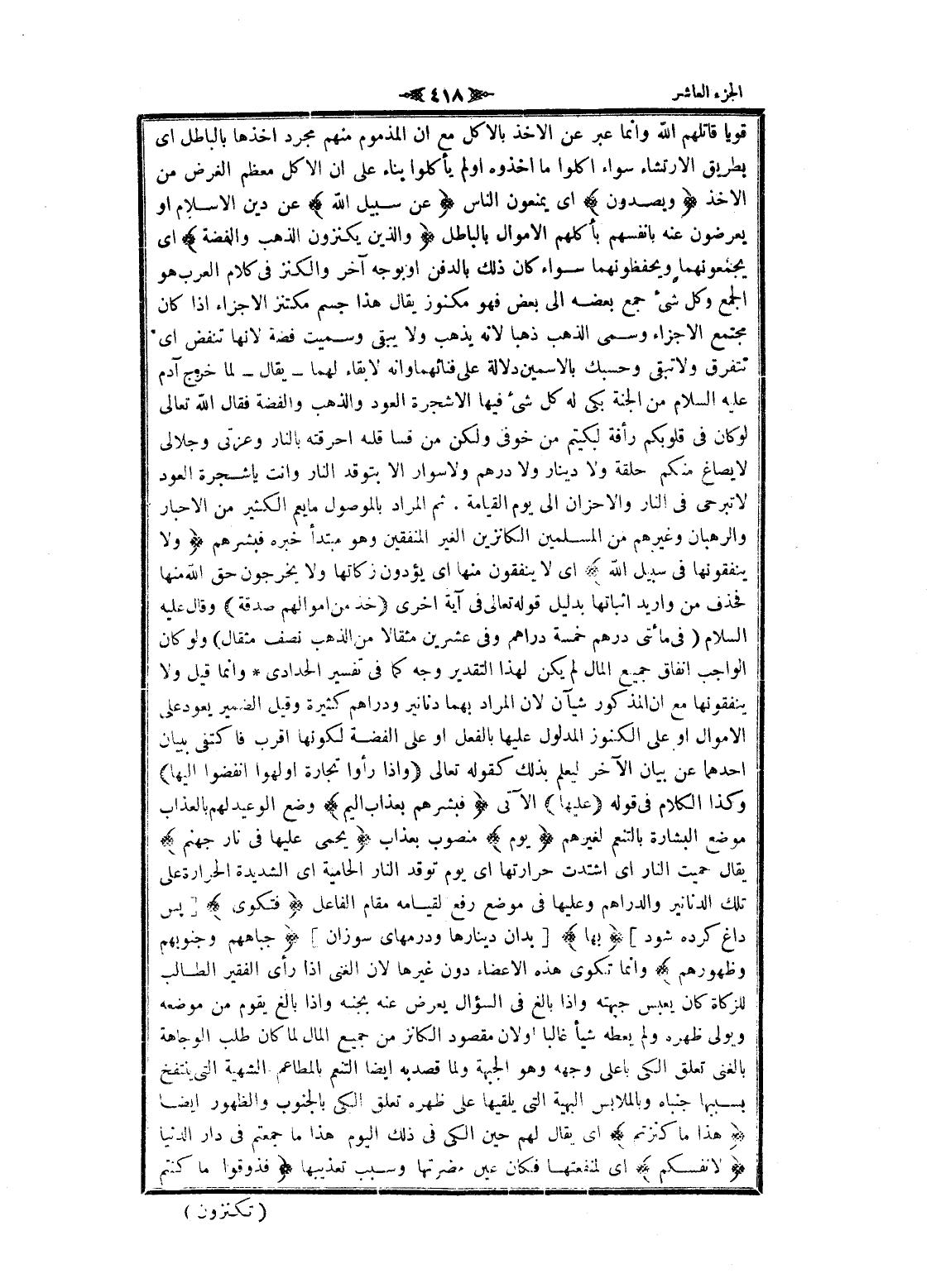 قويا قاتلهم الله وانما عبر عن الاخذ بالأكل مع ان المذموم منهم مجرد أخذها بالباطل اى بطريق الارتشاء سواء أكلوا ما أخذوه أو لم يأكلوا بناء على ان الاكل معظم الغرض من الاخذ وَيَصُدُّونَ اى يمنعون الناس عَنْ سَبِيلِ اللَّهِ عن دين الإسلام او يعرضون عنه بانفسهم بأكلهم الأموال بالباطل وَالَّذِينَ يَكْنِزُونَ الذَّهَبَ وَالْفِضَّةَ اى يجمعونهما ويحفظونهما سواء كان ذلك بالدفن او بوجه آخر والكنز فى كلام العرب هو الجمع وكل شىء جمع بعضه الى بعض فهو مكنوز يقال هذا جسم مكتنز الاجزاء إذا كان مجتمع الاجزاء وسمى الذهب ذهبا لانه يذهب ولا يبقى وسميت فضة لانها تنفض اى تنفرق ولا تبقى وحسبك بالاسمين دلالة على فنائهما وانه لا بقاء لهما- يقال- لما خرج آدم عليه السلام من الجنة بكى له كل شىء فيها إلا شجرة العود والذهب والفضة فقال الله تعالى لو كان فى قلوبكم رأفة لبكيتم من خوفى ولكن من قسا قلبه أحرقته بالنار وعزتى وجلالى لا يصاغ منكم حلقة ولا دينار ولا درهم ولا سوار الا بتوقد النار وأنت يا شجرة العود لا تبرحي فى النار والأحزان الى يوم القيامة. ثم المراد بالموصول ما يعم الكثير من الأحبار والرهبان وغيرهم من المسلمين الكانزين الغير المنفقين وهو مبتدأ خبره فبشرهم وَلا يُنْفِقُونَها فِي سَبِيلِ اللَّهِ اى لا ينفقون منها اى يؤدون زكاتها ولا يخرجون حق الله منها فحذف من وأريد إثباتها بدليل قوله تعالى فى آية اخرى خُذْ مِنْ أَمْوالِهِمْ صَدَقَةً وقال عليه السلام (فى مائتى درهم خمسة دراهم وفى عشرين مثقالا من الذهب نصف مثقال) ولو كان الواجب انفاق جميع المال لم يكن لهذا التقدير وجه كما فى تفسير الحدادي وانما قيل ولا ينفقونها مع ان المذكور شيآن لان المراد بهما دنانير ودراهم كثيرة وقيل الضمير يعود على الأموال او على الكنوز المدلول عليها بالفعل او على الفضة لكونها اقرب فاكتفى ببيان أحدهما عن بيان الآخر ليعلم بذلك كقوله تعالى وَإِذا رَأَوْا تِجارَةً أَوْ لَهْواً انْفَضُّوا إِلَيْها وكذا الكلام فى قوله عَلَيْها الآتي فَبَشِّرْهُمْ بِعَذابٍ أَلِيمٍ وضع الوعيد لهم بالعذاب موضع البشارة بالتنعم لغيرهم يَوْمَ منصوب بعذاب يُحْمى عَلَيْها فِي نارِ جَهَنَّمَ يقال حميت النار اى اشتدت حرارتها اى يوم توقد النار الحامية اى الشديدة الحرارة على تلك الدنانير والدراهم وعليها فى موضع رفع لقيامه مقام الفاعل فَتُكْوى [پس داغ كرده شود] بِها [بدان دينارها ودرمهاى سوزان] جِباهُهُمْ وَجُنُوبُهُمْ وَظُهُورُهُمْ وانما تكوى هذه الأعضاء دون غيرها لان الغنى إذا رأى الفقير الطالب للزكاة كان يعبس جبهته وإذا بالغ فى السؤال يعرض عنه بجنبه وإذا بالغ يقوم من موضعه ويولى ظهره ولم يعطه شيأ غالبا أو لأن مقصود الكانز من جميع المال لما كان طلب الوجاهة بالغنى تعلق الكي بأعلى وجهه وهو الجبهة ولما قصد به ايضا التنعم بالمطاعم الشهية التي ينتفخ بسببها جنباه وبالملابس البهية التي يلقيها على ظهره تعلق الكي بالجنوب والظهور ايضا هذا ما كَنَزْتُمْ اى يقال لهم حين الكي فى ذلك اليوم هذا ما جمعتم فى دار الدنيا لِأَنْفُسِكُمْ اى لمنفعتها فكان عين مضرتها وسبب تعذيبها فَذُوقُوا ما كُنْتُمْ
