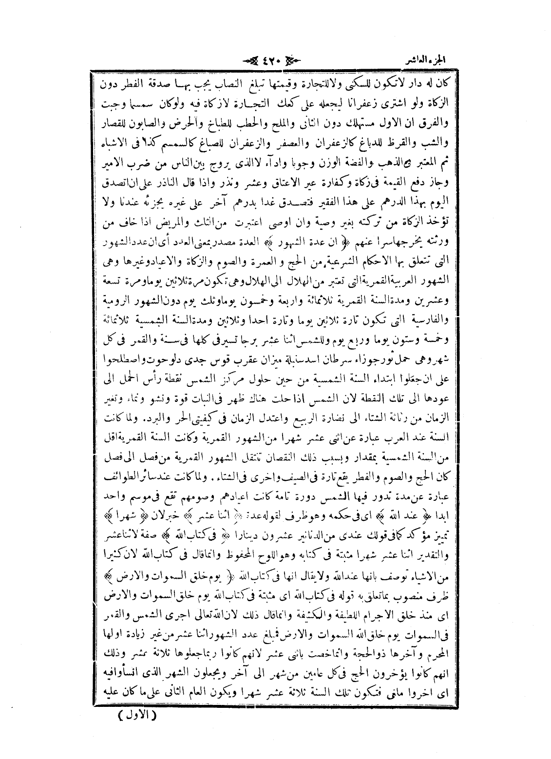 كان له دار لا تكون للسكنى ولا للتجارة وقيمتها تبلغ النصاب يجب بها صدقة الفطر دون الزكاة ولو اشترى زعفرانا ليجعله على كعك التجارة لا زكاة فيه ولو كان سمسما وجبت والفرق ان الاول مستهلك دون الثاني والملح والحطب للطباخ والحرض والصابون للقصار والشب والقرظ للدباغ كالزعفران والعصفر والزعفران للصباغ كالسمسم كذا فى الأشباه ثم المعتبر فى الذهب والفضة الوزن وجوبا وأداء لا الذي يروج بين الناس من ضرب الأمير وجاز دفع القيمة فى زكاة وكفارة غير الاعتاق وعشر ونذر وإذا قال الناذر على ان أتصدق اليوم بهذا الدرهم على هذا الفقير فتصدق غدا بدرهم آخر على غيره يجزئه عندنا ولا تؤخذ الزكاة من تركته بغير وصية وان اوصى اعتبرت من الثلث والمريض إذا خاف من ورثته يخرجها سرا عنهم إِنَّ عِدَّةَ الشُّهُورِ العدة مصدر بمعنى العدد أي ان عدد الشهور التي تتعلق بها الاحكام الشرعية من الحج والعمرة والصوم والزكاة والأعياد وغيرها وهى الشهور العربية القمرية التي تعتبر من الهلال الى الهلال وهى تكون مرة ثلاثين يوما ومرة تسعة وعشرين ومدة السنة القمرية ثلاثمائة واربعة وخمسون يوما وثلث يوم دون الشهور الرومية والفارسية التي تكون تارة ثلاثين يوما وتارة أحدا وثلاثين ومدة السنة الشمسية ثلاثمائة وخمسة وستون يوما وربع يوم وللشمس اثنا عشر برجا تسير فى كلها فى سنة والقمر فى كل شهر وهى حمل ثور جوزاء سرطان اسد سنبلة ميزان عقرب قوس جدى دلو حوت واصطلحوا على ان جعلوا ابتداء السنة الشمسية من حين حلول مركز الشمس نقطة رأس الحمل الى عودها الى تلك النقطة لان الشمس إذا حلت هناك ظهر فى النبات قوة ونشو ونماء وتغير الزمان من رثاثة الشتاء الى نضارة الربيع واعتدل الزمان فى كيفيتى الحر والبرد. ولما كانت السنة عند العرب عبارة عن اثنى عشر شهرا من الشهور القمرية وكانت السنة القمرية اقل من السنة الشمسية بمقدار وبسبب ذلك النقصان تنتقل الشهور القمرية من فصل الى فصل كان الحج والصوم والفطر يقع تارة فى الصيف واخرى فى الشتاء. ولما كانت عند سائر الطوائف عبارة عن مدة تدور فيها الشمس دورة تامة كانت أعيادهم وصومهم تقع فى موسم واحد ابدا عِنْدَ اللَّهِ اى فى حكمه وهو ظرف لقوله عدة اثْنا عَشَرَ خبر لان شَهْراً تمييز مؤكد كما فى قولك عندى من الدنانير عشرون دينارا فِي كِتابِ اللَّهِ صفة لاثنا عشر والتقدير اثنا عشر شهرا مثبتة فى كتابه وهو اللوح المحفوظ وانما قال فى كتاب الله لان كثيرا من الأشياء توصف بانها عند الله ولا يقال انها فى كتاب الله يَوْمَ خَلَقَ السَّماواتِ وَالْأَرْضَ ظرف منصوب بما تعلق به قوله فى كتاب الله اى مثبتة فى كتاب الله يوم خلق السموات والأرض اى منذ خلق الاجرام اللطيفة والكثيفة وانما قال ذلك لان الله تعالى اجرى الشمس والقمر فى السموات يوم خلق الله السموات والأرض فمبلغ عدد الشهور اثنا عشر من غير زيادة أولها المحرم وآخرها ذو الحجة وانما خصت باثنى عشر لانهم كانوا ربما جعلوها ثلاثة عشر وذلك انهم كانوا يؤخرون الحج فى كل عامين من شهر الى آخر ويجعلون الشهر الذي انسأوا فيه اى أخروا ملغى فتكون تلك السنة ثلاثة عشر شهرا ويكون العام الثاني على ما كان عليه