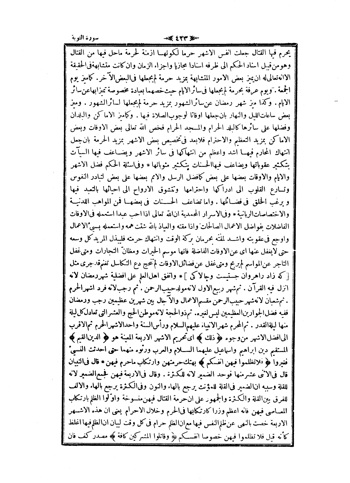 يحرم فيها القتال جعلت انفس الأشهر حرما لكونها ازمنة لحرمة ما حل فيها من القتال وهو من قبيل اسناد الحكم الى ظرفه اسنادا مجازيا واجزاء الزمان وان كانت متشابهة فى الحقيقة الا انه تعالى له ان يميز بعض الأمور المتشابهة بمزيد حرمة لم يجعلها فى البعض الآخر. كما ميز يوم الجمعة. ويوم عرفة بحرمة لم يجعلها فى سائر الأيام حيث خصهما بعبادة مخصوصة تميزا بها عن سائر الأيام. وكذا ميز شهر رمضان عن سائر الشهور بمزيد حرمة لم يجعلها لسائر الشهور. وميز بعض ساعات الليل والنهار بان جعلها اوقاتا لوجوب الصلاة فيها. وكما ميز الأماكن والبلدان وفضلها على سائرها كالبلد الحرام والمسجد الحرام فخص الله تعالى بعض الأوقات وبعض الأماكن بمزيد التعظيم والاحترام فلا بعد فى تخصيص بعض الأشهر بمزيد الحرمة بان جعل انتهاك المحارم فيها أشد وأعظم من انتهاكها فى سائر الأشهر ويضاعف فيها السيئات بتكثير عقوباتها ويضاعف فيها الحسنات بتكثير مثوباتها وفى اسئلة الحكم فضل الأشهر والأيام والأوقات بعضها على بعض كما فضل الرسل والأمم بعضها على بعض لتبادر النفوس وتسارع القلوب الى إدراكها واحترامها وتتشوق الأرواح الى إحيائها بالتعبد فيها ويرغب الخلق فى فضائلها. واما تضاعف الحسنات فى بعضها فمن المواهب اللدنية والاختصاصات الربانية وفى الاسرار المحمدية ان الله تعالى إذا أحب عبدا استعمله فى الأوقات الفاضلات بفواضل الأعمال الصالحات وإذا مقته والعياذ بالله شتت همه واستعمله بسيىء الأعمال وأوجع فى عقوبته وأشد لمقته بحرمان بركة الوقت وانتهاك حرمته فليبذل المريد كل وسعه حتى لا يغفل عنها اى عن الأوقات الفاضلة فانها موسم الخيرات ومظانّ التجارات ومتى غفل التاجر عن المواسم لم يربح ومتى غفل عن فضائل الأوقات لم تنحج دع التكاسل تغنم قد جرى مثل [كه زاد راهروان جستيست و چالاكى] واتفق اهل العلم على افضلية شهر رمضان لانه انزل فيه القرآن. ثم شهر ربيع الاول لانه مولد حبيب الرحمن. ثم رجب لانه فرد لانه فرد أشهر الحرم. ثم شعبان لانه شهر حبيب الرحمن مقسم الأعمال والآجال بين شهرين عظيمين رجب ورمضان ففيه فضل الجوارين العظيمين ليس لغيره. ثم ذو الحجة لانه موطن الحج والعشر التي تعادل كل ليلة منها ليلة القدر. ثم المحرم شهر الأنبياء عليهم السلام ورأس السنة واحد الأشهر الحرم ثم الأقرب الى أفضل الأشهر من وجوه ذلِكَ اى تحريم الأشهر الاربعة المعينة هو الدِّينُ الْقَيِّمُ المستقيم دين ابراهيم وإسماعيل عليهما السلام والعرب ورثوه منهما حتى أحدثت النسيء فغيروا فَلا تَظْلِمُوا فِيهِنَّ أَنْفُسَكُمْ بهتك