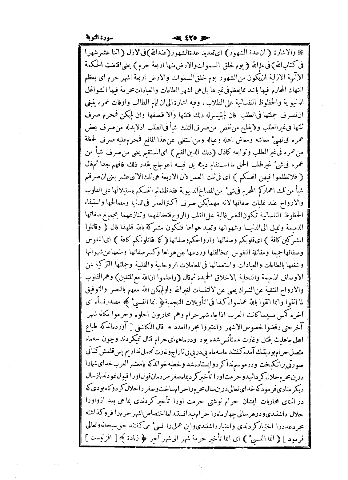 والاشارة إِنَّ عِدَّةَ الشُّهُورِ اى تعديد عدة الشهور عِنْدَ اللَّهِ فى الأزل اثْنا عَشَرَ شَهْراً فِي كِتابِ اللَّهِ فى علم الله يَوْمَ خَلَقَ السَّماواتِ وَالْأَرْضَ مِنْها أَرْبَعَةٌ حُرُمٌ يعنى اقتضت الحكمة الإلهية الازلية ان يكون من الشهور يوم خلق السموات والأرض اربعة أشهر حرم اى يعظم انتهاك المحارم فيها باشد مما يعظم فى غيرها بل هى أشهر الطاعات والعبادات محرمة فيها الشواغل الدنيوية والحظوظ النفسانية على الطلاب. وفيه اشارة الى ان ايام الطالب واوقات عمره ينبغى ان تصرف جملتها فى الطلب فان لم يتيسر له ذلك فثلثها والا فنصفها وان لم يكن فمحرم صرف ثلثها فى غير الطلب ولا يفلح من نقص من صرف الثلث شيأ فى الطلب إذ لا بد له من صرف بعض عمره فى تهيىء معاشه ومعاش اهله وعياله ومن استغنى عن هذا المانع فمحرم عليه صرف لحظة من عمره فى غير الطلب وتوابعه كما قال ذلِكَ الدِّينُ الْقَيِّمُ اى المستقيم يعنى من صرف شيأ من عمره فى شىء غير طلب الحق ما استقام دينه بل فيه اعوجاج بقدر ذلك فافهم جدا ثم قال فَلا تَظْلِمُوا فِيهِنَّ أَنْفُسَكُمْ اى فى ثلث العمر لان الاربعة هى ثلث الاثني عشر يعنى ان صرفتم شيأ من ثلث اعماركم المحرم فى شىء من المصالح الدنيوية فقد ظلمتم أنفسكم باستيلائها على القلوب والأرواح عند غلبات صفاتها لانه مهما يكن صرف اكثر العمر فى الدنيا ومصالحها واستيفاء الحظوظ النفسانية تكون النفس غالبة على القلب والروح فتخالفهما وتنازعهما بجميع صفاتها الذميمة وتميل الى الدنيا وشهواتها وتعبد هواها فتكون مشركة بالله فلهذا قال وَقاتِلُوا الْمُشْرِكِينَ كَافَّةً اى قلوبكم وصفاتها وأرواحكم وصفاتها كَما يُقاتِلُونَكُمْ كَافَّةً اى النفوس وصفاتها جميعا ومقاتلة النفوس بمخالفتها وردعها عن هواها وكسر صفاتها ومنعها عن شهواتها وشغلها بالطاعات والعبادات واستعمالها فى المعاملات الروحانية والقلبية وجملتها التزكية عن الأوصاف الذميمة والتحلية بالأخلاق الحميدة ثم قال وَاعْلَمُوا أَنَّ اللَّهَ مَعَ الْمُتَّقِينَ وهم القلوب والأرواح المتقية عن الشرك يعنى عن الالتفات لغير الله ولو لم يكن الله معهم بالنصر والتوفيق لما اتقوا وانما اتقوا بالله عما سواه كذا فى التأويلات النجمية إِنَّمَا النَّسِيءُ مصدر نسأه اى أخره كمس مسيسا كانت العرب إذا جاء شهر حرام وهم محاربون احلوه وحرموا مكانه شهرا آخر حتى رفضوا خصوص الأشهر واعتبروا مجرد العدد قال الكاشفى [آورده اند كه طباع اهل جاهليت بقتل وغارت مستأنس شده بود ودر ماههاى حرام قتال نميكردند و چون سه ماه متصل حرام بود بتنك آمده گفتند ما سه ماه پى در پى بى تاراج وغارت تحمل نداريم پس قلمش كنانى صورتى بر انگيخت ودر موسم ندا كرد وايستاده شد وخطبه خواند كه يا معشر العرب خداى شما را درين محرم حلال كردانيد وحرمت او را تأخير كرد بماه صفر مردمان قول او را قبول نمودند باز سال ديگر منادى فرمود كه خداى تعالى درين سال محرم را حرام ساخت وصفر را حلال كرد وكاه بودى كه در اثناى محاربات ايشان حرام نوشتى حرمت او را تأخير كردندى بما هى بعد ازو او را حلال داشتندى ودر هر سالى چهار ماه را حرام ميدانستند اما اختصاص أشهر حرم را فرو گذاشته مجرد عدد را اختيار كردندى واعتبار داشتندى واين عمل را نسىء مى گفتند حق سبحانه وتعالى فرمود] إِنَّمَا النَّسِيءُ اى انما تأخير حرمة شهر الى شهر آخر زِيادَةٌ [افزونيست]