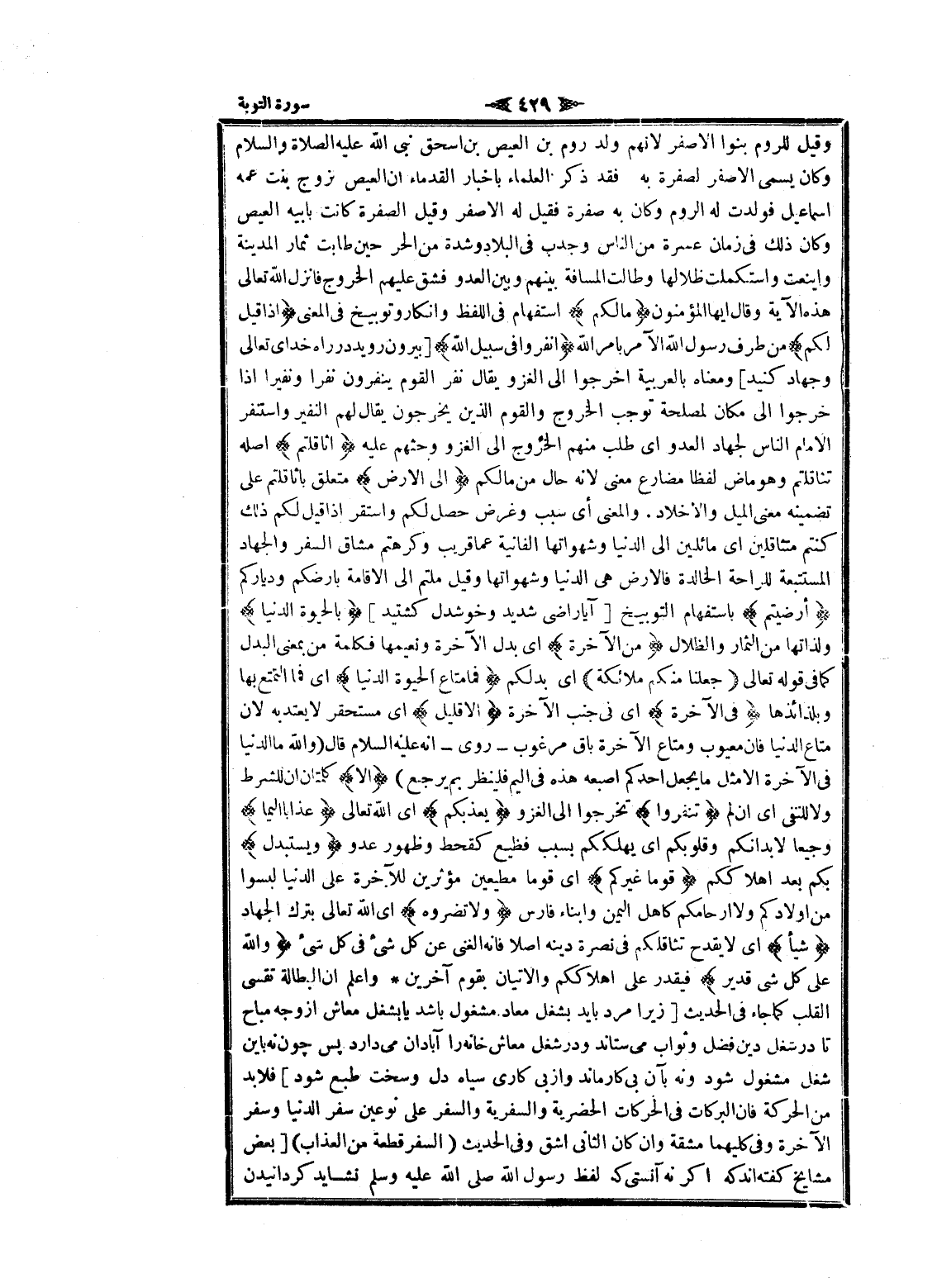 وقيل للروم بنوا الأصفر لانهم ولد روم بن العيص بن اسحق نبى الله عليه الصلاة والسلام وكان يسمى الأصفر لصفرة به. فقد ذكر العلماء بأخبار القدماء ان العيص تزوج بنت عمه إسماعيل فولدت له الروم وكان به صفرة فقيل له الأصفر وقيل الصفرة كانت بابيه العيص وكان ذلك فى زمان عسرة من الناس وجدب فى البلاد وشدة من الحر حين طابت ثمار المدينة وأينعت واستكملت ظلالها وطالت المسافة بينهم وبين العدو فشق عليهم الخروج فانزل الله تعالى هذه الآية وقال ايها المؤمنون ما لَكُمْ استفهام فى اللفظ وانكار وتوبيخ فى المعنى إِذا قِيلَ لَكُمُ من طرف رسول الله الآمر بامر الله انْفِرُوا فِي سَبِيلِ اللَّهِ [بيرون رويد در راه خداى تعالى وجهاد كنيد] ومعناه بالعربية اخرجوا الى الغزو يقال نفر القوم ينفرون نفرا ونفيرا إذا خرجوا الى مكان لمصلحة توجب الخروج والقوم الذين يخرجون يقال لهم النفير واستنفر الامام الناس لجهاد العدو اى طلب منهم الخروج الى الغزو وحثهم عليه اثَّاقَلْتُمْ أصله تثاقلتم وهو ماض لفظا مضارع معنى لانه حال من مالكم إِلَى الْأَرْضِ متعلق باثاقلتم على تضمينه معنى الميل والإخلاد. والمعنى أي سبب وغرض حصل لكم واستقر إذا قيل لكم ذلك كنتم متثاقلين اى مائلين الى الدنيا وشهواتها الفانية عما قريب وكرهتم مشاق السفر والجهاد المستتبعة للراحة الخالدة فالارض هى الدنيا وشهواتها وقيل ملتم الى الاقامة بأرضكم ودياركم أَرَضِيتُمْ باستفهام التوبيخ [آيا راضى شديد وخوشدل گشتيد] بِالْحَياةِ الدُّنْيا ولذاتها من الثمار والظلال مِنَ الْآخِرَةِ اى بدل الآخرة ونعيمها فكلمة من بمعنى البدل كما فى قوله تعالى لَجَعَلْنا مِنْكُمْ مَلائِكَةً اى بدلكم فَما مَتاعُ الْحَياةِ الدُّنْيا اى فما التمتع بها وبلذائذها فِي الْآخِرَةِ اى فى جنب الآخرة إِلَّا قَلِيلٌ اى مستحقر لا يعتدبه لان متاع الدنيا فان معيوب ومتاع الآخرة باق مرغوب- روى- انه عليه السلام قال (والله ما الدنيا فى الآخرة الأمثل ما يجعل أحدكم إصبعه هذه فى اليم فلينظر بم يرجع) إِلَّا كلمتان ان للشرط ولا للننفى اى ان لم تَنْفِرُوا تخرجوا الى الغزو يُعَذِّبْكُمْ اى الله تعالى عَذاباً أَلِيماً وجيعا لابدانكم وقلوبكم اى يهلككم بسبب فظيع كقحط وظهور عدو وَيَسْتَبْدِلْ بكم بعد إهلاككم قَوْماً غَيْرَكُمْ اى قوما مطيعين مؤثرين للآخرة على الدنيا ليسوا من أولادكم ولا أرحامكم كاهل اليمن وأبناء فارس وَلا تَضُرُّوهُ اى الله تعالى بترك الجهاد شَيْئاً اى لا يقدح تثاقلكم فى نصرة دينه أصلا فانه الغنى عن كل شىء فى كل شىء وَاللَّهُ عَلى كُلِّ شَيْءٍ قَدِيرٌ فيقدر على إهلاككم والإتيان بقوم آخرين واعلم ان البطالة تقسى القلب كما جاء فى الحديث [زيرا مرد بايد بشغل معاد مشغول باشد يا بشغل معاش از وجه مباح تا در شغل دين فضل وثواب مى ستاند ودر شغل معاش خانه را آبادان مى دارد پس چون نه باين شغل مشغول شود ونه بآن بي كار ماند واز بى كارى سياه دل وسخت طبع شود] فلا بد من الحركة فان البركات فى الحركات الحضرية والسفرية والسفر على نوعين سفر الدنيا وسفر الآخرة وفى كليهما مشقة وان كان الثاني أشق وفى الحديث (السفر قطعة من العذاب) [بعض مشايخ گفته اند كه اگر نه آنستى كه لفظ رسول الله صلى الله عليه وسلم نشايد گردانيدن