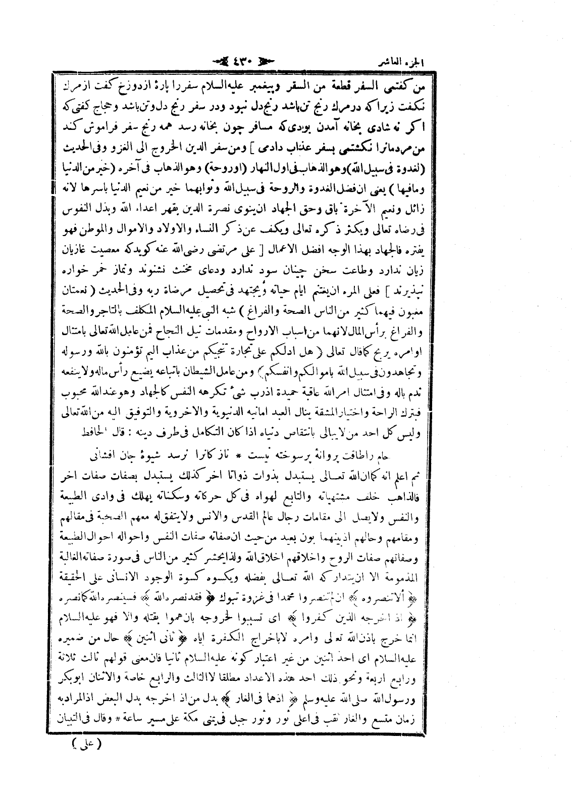 من گفتمى السفر قطعة من السقر و پيغمبر عليه السلام سفر را پاره از دوزخ گفت از مرگ نگفت زيرا كه در مرگ رنج تن باشد رنج دل نبود ودر سفر رنج دل وتن باشد وحجاج گفتى كه اگر نه شادى بخانه آمدن بودى كه مسافر چون بخانه رسد همه رنج سفر فراموش كند من مردمانرا نكشتمى بسفر عذاب دادمى] ومن سفر الدين الخروج الى الغزو وفى الحديث (لغدوة فى سبيل الله) وهو الذهاب فى أول النهار (او روحة) وهو الذهاب فى آخره (خير من الدنيا وما فيها) يعنى ان فضل الغدوة والروحة فى سبيل الله وثوابهما خير من نعيم الدنيا بأسرها لانه زائل ونعيم الآخرة باق وحق الجهاد ان ينوى نصرة الدين بقهر اعداء الله وبذل النفوس فى رضاه تعالى ويكثر ذكره تعالى ويكف عن ذكر النساء والأولاد والأموال والموطن فهو يفتره فالجهاد بهذا الوجه أفضل الأعمال [على مرتضى رضى الله عنه كويد كه معصيت غازيان زيان ندارد وطاعت سخن چينان سود ندارد ودعاى مخنث نشنوند ونماز خمر خواره نپذيرند] فعلى المرء ان يغتنم ايام حياته ويجتهد فى تحصيل مرضاة ربه وفى الحديث (نعمتان مغبون فيهما كثير من الناس الصحة والفراغ) شبه النبي عليه السلام المكلف بالتاجر والصحة والفراغ برأس المال لانهما من اسباب الأرواح ومقدمات نيل النجاح فمن عامل الله تعالى بامتثال أوامره يربح كما قال تعالى هَلْ أَدُلُّكُمْ عَلى تِجارَةٍ تُنْجِيكُمْ مِنْ عَذابٍ أَلِيمٍ تُؤْمِنُونَ بِاللَّهِ وَرَسُولِهِ وَتُجاهِدُونَ فِي سَبِيلِ اللَّهِ بِأَمْوالِكُمْ وَأَنْفُسِكُمْ ومن عامل الشيطان باتباعه يضيع رأس ماله ولا ينفعه ندم باله وفى امتثال امر الله عاقبة حميدة إذ رب شىء تكرهه النفس كالجهاد وهو عند الله محبوب فبترك الراحة واختيار المشقة ينال العبد أمانيه الدنيوية والاخروية والتوفيق اليه من الله تعالى وليس كل أحد من لا يبالى بانتقاص دنياه إذا كان التكامل فى طرف دينه: قال الحافظ