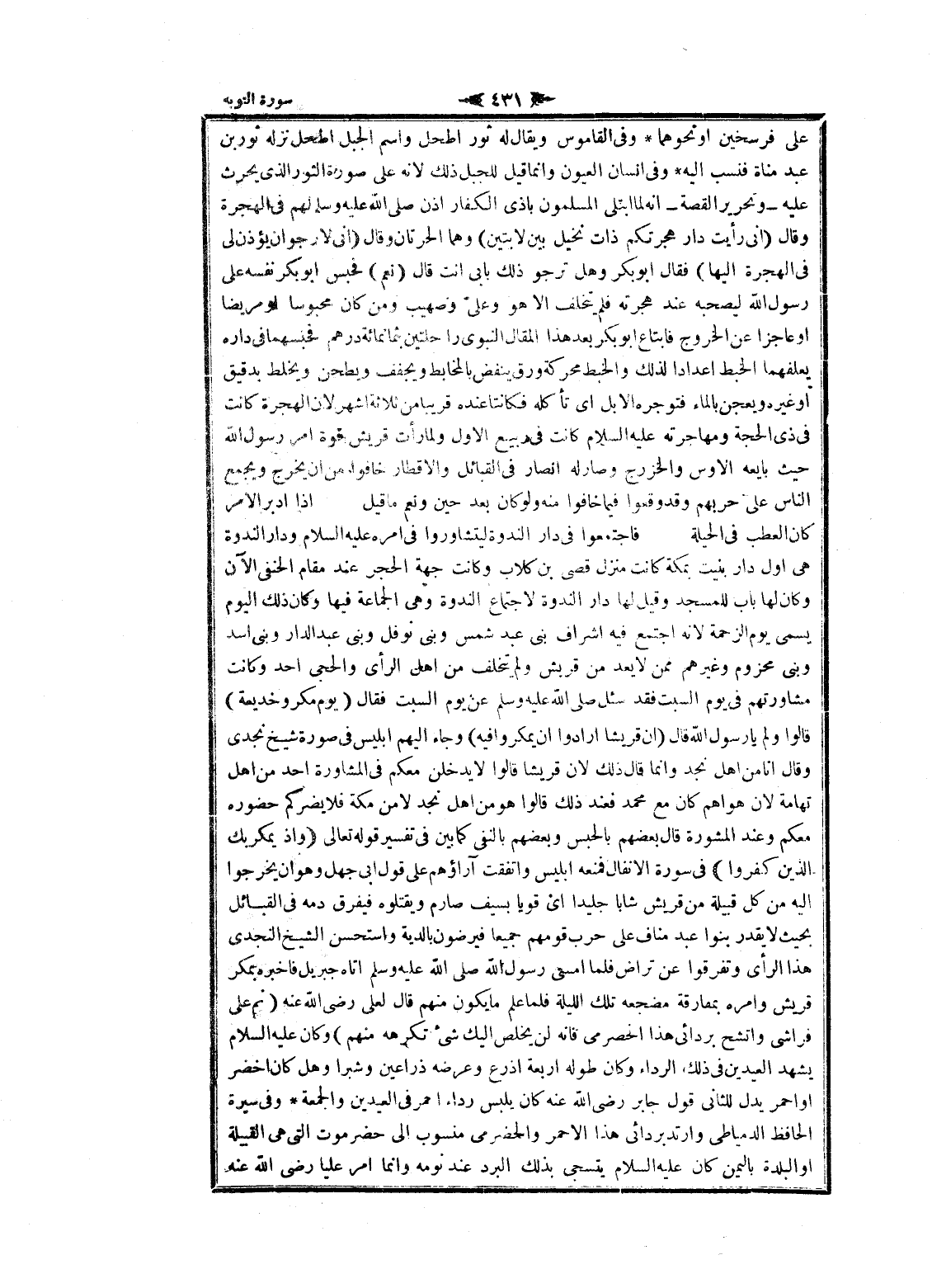 ينفض بالمخابط ويجفف ويطحن ويخلط بدقيق او غيره ويعجن بالماء فتوجره الإبل اى تأكله فكانتا عنده قريبا من ثلاثة أشهر لان الهجرة كانت فى ذى الحجة ومهاجرته عليه السلام كانت فى ربيع الاول ولما رأت قريش قوة امر رسول الله حيث بايعه الأوس والخزرج وصار له أنصار فى القبائل والأقطار خافوا من ان يخرج ويجمع الناس على حربهم وقد وقعوا فيما خافوا منه ولو كان بعد حين ونعم ما قيل إذا أدبر الأمر كان العطب فى الحيلة فاجتمعوا فى دار الندوة ليتشاوروا فى امره عليه السلام ودار الندوة هى أول دار بنيت بمكة كانت منزل قصى بن كلاب وكانت جهة الحجر عند مقام الحنفي الآن وكان لها باب للمسجد وقيل لها دار الندوة لاجتماع الندوة وهى الجماعة فيها وكان ذلك اليوم يسمى يوم الزحمة لانه اجتمع فيه اشراف بنى عبد شمس وبنى نوفل وبنى عبد الدار وبنى اسد وبنى محزوم وغيرهم ممن لا يعد من قريش ولم يتخلف من اهل الرأى والحجى أحد وكانت مشاورتهم فى يوم السبت فقد سئل صلى الله عليه وسلم عن يوم السبت فقال (يوم مكرو خديعة) قالوا ولم يا رسول الله قال (ان قريشا أرادوا ان يمكروا فيه) وجاء إليهم إبليس فى صورة شيخ نجدى وقال انا من اهل نجد وانما قال ذلك لان قريشا قالوا لا يدخلن معكم فى المشاورة أحد من اهل تهامة لان هواهم كان مع محمد فعند ذلك قالوا هو من اهل نجد لامن مكة فلا يضركم حضوره معكم وعند المشورة قال بعضهم بالحبس وبعضهم بالنفي كما بين فى تفسير قوله تعالى وَإِذْ يَمْكُرُ بِكَ الَّذِينَ كَفَرُوا فى سورة الأنفال فمنعه إبليس واتفقت آراؤهم على قول ابى جهل وهو ان يخرجوا اليه من كل قبيلة من قريش شابا جليدا اى قويا بسيف صارم ويقتلوه فيفرق دمه فى القبائل بحيث لا يقدر بنوا عبد مناف على حرب قومهم جميعا فيرضون بالدية واستحسن الشيخ النجدي هذا الرأى وتفرقوا عن تراض فلما امسى رسول الله صلى الله عليه وسلم أتاه جبريل فاخبره بمكر قريش وامره بمفارقة مضجعه تلك الليلة فلما علم ما يكون منهم قال لعلى رضى الله عنه (نم على فراشى واتشح بردائي هذا الحضرمي فانه لن يخلص إليك شىء تكرهه منهم) وكان عليه السلام يشهد العيدين فى ذلك الرداء وكان طوله اربعة اذرع وعرضه ذراعين وشبرا وهل كان اخضر او احمر يدل للثانى قول جابر رضى الله عنه كان يلبس رداء احمر فى العيدين والجمعة وفى سيرة الحافظ الدمياطي وارتد بردائي هذا الأحمر والحضرمي منسوب الى حضر موت التي هى القبيلة او البلدة باليمن كان عليه السلام يتسجى بذلك البرد عند نومه وانما امر عليا رضى الله عنه