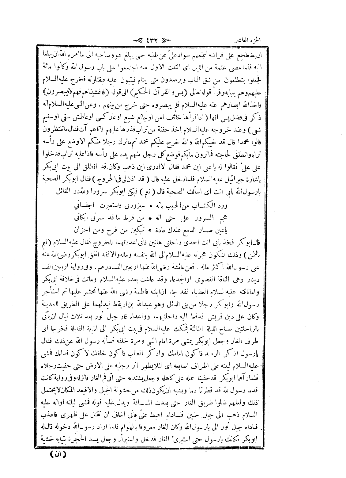 عين صار الدمع عندك عادة تبكين من فرح ومن احزان قال ابو بكر فخذ بابى أنت احدى راحلتى هاتين فانى اعددتهما للخروج فقال عليه السلام (نعم بالثمن) وذلك لتكون هجرته عليه السلام الى الله بنفسه وماله وإلا فقد أنفق أبو بكر رضى الله عنه على رسول الله اكثر ماله. فعن عائشة رضى الله عنها أربعين الف درهم. وفى رواية أربعين الف دينار وهى الناقة القصوى او الجدعاء وقد عاشت بعده عليه السلام وماتت فى خلافة ابى بكر واما ناقته عليه السلام العضباء فقد جاء ان ابنته فاطمة رضى الله عنها تحشر عليها ثم استأجر رسول الله وابو بكر رجلا من بنى الدئل وهو عبد الله بن أريقط ليدلهما على الطريق للمدينة وكان على دين قريش فدفعا اليه راحلتيهما وواعداه غار جبل ثور بعد ثلاث ليال ان يأتى بالراحلتين صباح الليلة الثالثة فمكث عليه السلام فى بيت ابى بكر الى الليلة القابلة فخرجا الى طرف الغار وجعل ابو بكر يمشى مرة امام النبي ومرة خلفه فسأله رسول الله عن ذلك فقال يا رسول اذكر الرصد فاكون امامك واذكر الطلب فاكون خلفك لا كون فداءك فمشى عليه السلام ليلته على أطراف أصابعه اى لئلا يظهر اثر رجليه على الأرض حتى حفيت رجلاه فلما رآهما ابو بكر قد حفيتا حمله على كاهله وجعل يشتد به حتى اتى فم الغار فانزله وفى رواية كانت قدما رسول الله قد قطرتا دما ويشبه ان يكون ذلك من خشونة الجبل والا فبعد المكان لا يحتمل ذلك ولعلهم ضلوا طريق الغار حتى بعدت المسافة ويدل عليه قوله فمشى ليلته او انه عليه السلام ذهب الى جبل حنين فناداه اهبط عنى فانى أخاف ان تقتل على ظهرى فاعذب فناداه جبل ثور الى يا رسول الله وكان الغار معروفا بالهوام فلما أراد رسول الله دخوله قال له أبو بكر مكانك يا رسول حتى أستبرئ الغار فدخل واستبرأه وجعل يسد الحجرة بثيابه خشية