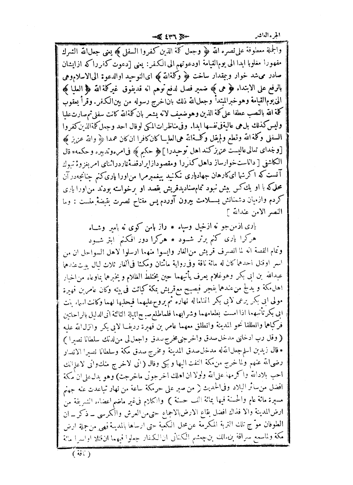وتمام القصة انه لما انصرف قريش من الغار وايسوا منهما أرسلوا لاهل السواحل ان من اسر او قتل أحدهما كان له مائة ناقة وفى رواية مائتان ومكثا فى الغار ثلاث ليال يبيت عندهما عبد الله بن ابى بكر وهو غلام يعرف يأتيهما حين يختلط الظلام ويخبرهما بما وعاه من اخبار اهل مكة ويدلج من عندهما بفجر فيصبح مع قريش بمكة كبائت فى بيته وكان عامر بن فهيرة مولى ابى بكر يرعى لابى بكر اغناما له نهاره ثم يروح عليهما فيحلبها لهما وكانت اسماء بنت ابى بكر تأتيهما إذا امست بطعامهما وشرابهما فلما طلع صبح الليلة الثالثة اتى الدليل بالراحلتين فركباهما وانطلقا نحو المدينة وانطلق معهما عامر بن فهيرة رديفا لابى بكر وانزل الله عليه وَقُلْ رَبِّ أَدْخِلْنِي مُدْخَلَ صِدْقٍ وَأَخْرِجْنِي مُخْرَجَ صِدْقٍ وَاجْعَلْ لِي مِنْ لَدُنْكَ سُلْطاناً نَصِيراً قال زيد بن اسلم جعل الله له مدخل صدق المدينة ومخرج صدق مكة وسلطانا نصيرا الأنصار رضى الله عنهم ولما خرج من مكة التفت إليها وبكى وقال (انى لا خرج منك وانى لاعلم انك أحب بلاد الله وأكرمها على الله ولولا ان أهلك أخرجوني ما خرجت) وهو يدل على ان مكة أفضل من سائر البلاد وفى الحديث (من صبر على حرمكة ساعة من نهار تباعدت عنه جهنم مسيرة مائة عام والحسنة فيها بمائة الف حسنة) والكلام فى غير ما ضم أعضاءه الشريفة من ارض المدينة والا فذاك أفضل بقاع الأرض بالإجماع حتى من العرش والكرسي- ذكر- ان الطوفان موّج تلك التربة المكرمة عن محل الكعبة حتى أرساها بالمدينة فهى من جملة ارض مكة ولما سمع سراقة بن مالك بن جعشم الكناني ان الكفار جعلوا فيهما ان قتلا او اسرا مائة