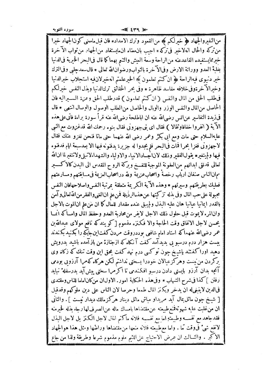 من النفير والجهاد خَيْرٌ لَكُمْ من القعود وترك الامداد فان قيل ما معنى كون الجهاد خيرا من تركه والحال انه لا خير فى تركه أجيب بان معناه ان ما يستفاد من الجهاد من ثواب الآخرة خير مما يستفيده القاعد عنه من الراحة وسعة العيش والتنعم بهما كما قال فى البحر الخيرية فى الدنيا بغلبة العدو ووراثة الأرض وفى الآخرة بالثواب ورضوان الله تعالى قال سعد چلبى وفى الترك خير دنيوى فيه الراحة إِنْ كُنْتُمْ تَعْلَمُونَ الخير علمتم انه خير لان فيه استجلاب خير الدنيا وخير الآخرة وفى خلافه مفاسد ظاهرة وفى بحر الحقائق ترك الدنيا وبذل النفس خير لكم فى طلب الحق من المال والنفس إِنْ كُنْتُمْ تَعْلَمُونَ قدر طلب الحق وعزة السير اليه فان الحاصل من المال والنفس الوزر والوبال والحاصل من الطلب الوصول والوصال انتهى قال فى زبدة التفاسير عن انس رضى الله عنه ان أبا طلحة رضى الله عنه قرأ سورة براءة فاتى على هذه الآية انْفِرُوا خِفافاً وَثِقالًا فقال اى بنى جهزونى فقال بنوه رحمك الله قد غزوت مع النبي عليه السلام حتى مات ومع ابى بكر وعمر رضى الله عنهما حتى ماتا فنحن نغزو عنك فقال لا جهزونى فغزا بحرا فمات فى البحر فلم يجدوا له جزيرة يدفنونه فيها الا بعد سبعة ايام فدفنوه فيها ولم يتغير يقول الفقير وذلك لان أجساد الأنبياء والأولياء والشهداء لا تبلى ولا تتغير لما ان الله تعالى قد نقى أبدانهم من العفونة الموجبة للتفسخ وبركة الروح المقدس الى البدن كالا كسير ثم ان الناس صنفان ارباب رخصة واصحاب عزيمة ولله در اصحاب العزيمة فى مسابقتهم ومسارعتهم فعليك بطريقتهم وسيرتهم وهذه الآية الكريمة متعلقة بمرتبة النفس وإصلاحها فان النفس مجبولة على حب المال وفى بذله تزكيتها عن هذه الرذيلة فمن علم ان الغنى والفقر من الله تعالى وآمن بالقدر ايمانيا عيانيا هان عليه البذل ولم يبق عنده مقدار للمال كما ان من علم ان الموت بالأجل وان المرء لا يموت قبل حلول ذلك الاجل لا يفر من محاربة العدو وحفظ المال وإمساكه انما يحسن لاجل الانفاق وقت الحاجة والا فكنزه مذموم [گويند كه نافع مولاى عبد الله بن عمر رضى الله عنهما كه استاد امام شافعى بود در وقت