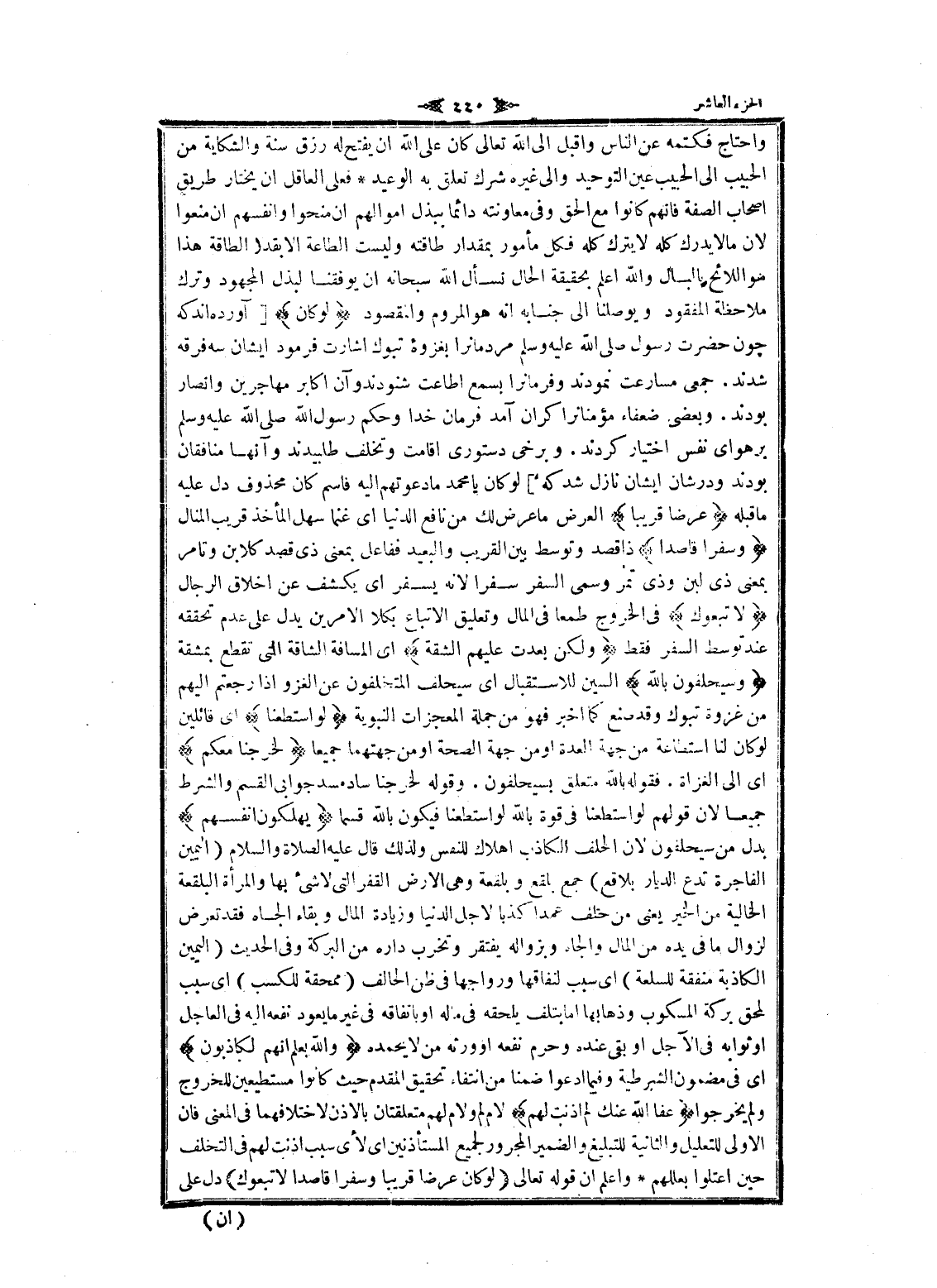 واحتاج فكتمه عن الناس واقبل الى الله تعالى كان على الله ان يفتح له رزق سنة والشكاية من الحبيب الى الحبيب عين التوحيد والى غيره شرك تعلق به الوعيد فعلى العاقل ان يختار طريق اصحاب الصفة فانهم كانوا مع الحق وفى معاونته دائما ببذل أموالهم ان منحوا وأنفسهم ان منعوا لان ما لا يدرك كله لا يترك كله فكل مأمور بمقدار طاقته الا بقدر الطاقة هذا هو اللائح بالبال والله اعلم بحقيقة الحال نسأل الله سبحانه ان يوفقنا لبذل المجهود وترك ملاحظة المفقود ويوصلنا الى جنابه انه هو المروم والمقصود لَوْ كانَ [آورده اند كه چون حضرت رسول صلى الله عليه وسلم مردمانرا بغزوه تبوك اشارت فرمود ايشان سه فرقه شدند. جمعى مسارعت نمودند وفرمانرا بسمع اطاعت شنودند وآن أكابر مهاجرين وأنصار بودند. وبعضى ضعفاء مؤمنانرا كران آمد فرمان خدا وحكم رسول الله صلى الله عليه وسلم بر هواى نفس اختيار كردند. وبرخى دستورى اقامت وتخلف طلبيدند وآنها منافقان بودند ودرشان ايشان نازل شد كه] لو كان يا محمد ما دعوتهم اليه فاسم كان محذوف دل عليه ما قبله عَرَضاً قَرِيباً العرض ما عرض لك من نافع الدنيا اى غنما سهل المأخذ قريب المنال وَسَفَراً قاصِداً ذا قصد وتوسط بين القريب والبعيد ففاعل بمعنى ذى قصد كلابن وتامر بمعنى ذى لبن وذى تمر وسمى السفر سفرا لانه يسفر اى يكشف عن اخلاق الرجال لَاتَّبَعُوكَ فى الخروج طمعا فى المال وتعليق الاتباع بكلا الامرين يدل على عدم تحققه عند توسط السفر فقط وَلكِنْ بَعُدَتْ عَلَيْهِمُ الشُّقَّةُ اى المسافة الشاقة التي تقطع بمشقة وَسَيَحْلِفُونَ بِاللَّهِ السين للاستقبال اى سيحلف المتخلفون عن الغزو إذا رجعتم إليهم من غزوة تبوك وقد صنع كما اخبر فهو من جملة المعجزات النبوية لَوِ اسْتَطَعْنا اى قائلين لو كان لنا استطاعة من جهة العدة او من جهة الصحة او من جهتهما جميعا لَخَرَجْنا مَعَكُمْ اى الى الغزاة. فقوله بالله متعلق بسيحلفون. وقوله لخرجنا ساد مسد جوابى القسم والشرط جميعا لان قولهم لو استطعنا فى قوة بالله لو استطعنا فيكون بالله قسما يُهْلِكُونَ أَنْفُسَهُمْ بدل من سيحلفون لان الحلف الكاذب إهلاك للنفس ولذلك قال عليه الصلاة والسلام (اليمين الفاجرة تدع الديار بلاقع) جمع بلقع وبلقعة وهى الأرض القفر التي لا شىء بها والمرأة البلقعة الخالية من الخير يعنى من حلف عمدا كذبا لاجل الدنيا وزيادة المال وبقاء الجاه فقد تعرض لزوال ما فى يده من المال والجاه وبزواله يفتقر وتخرب داره من البركة وفى الحديث (اليمين الكاذبة منفقة للسلعة) اى سبب لنفاقها ورواجها فى ظن الحالف (ممحقة للكسب) اى سبب لمحق بركة المسكوب وذهابها اما بتلف يلحقه فى ماله او بانفاقه فى غير ما يعود نفعه اليه فى العاجل او ثوابه فى الآجل او بقي عنده وحرم نفعه او ورثه من لا يحمده وَاللَّهُ يَعْلَمُ إِنَّهُمْ لَكاذِبُونَ اى فى مضمون الشرطية وفيما ادعوا ضمنا من انتفاء تحقيق المقدم حيث كانوا مستطيعين للخروج ولم يخرجوا عَفَا اللَّهُ عَنْكَ لِمَ أَذِنْتَ لَهُمْ لام لم ولام لهم متعلقتان بالاذن لاختلافهما فى المعنى فان الاولى للتعليل والثانية للتبليغ والضمير المجرور لجميع المستأذنين اى لأى سبب أذنت لهم فى التخلف حين اعتلوا بعللهم واعلم ان قوله تعالى لَوْ كانَ عَرَضاً قَرِيباً وَسَفَراً قاصِداً لَاتَّبَعُوكَ دل على