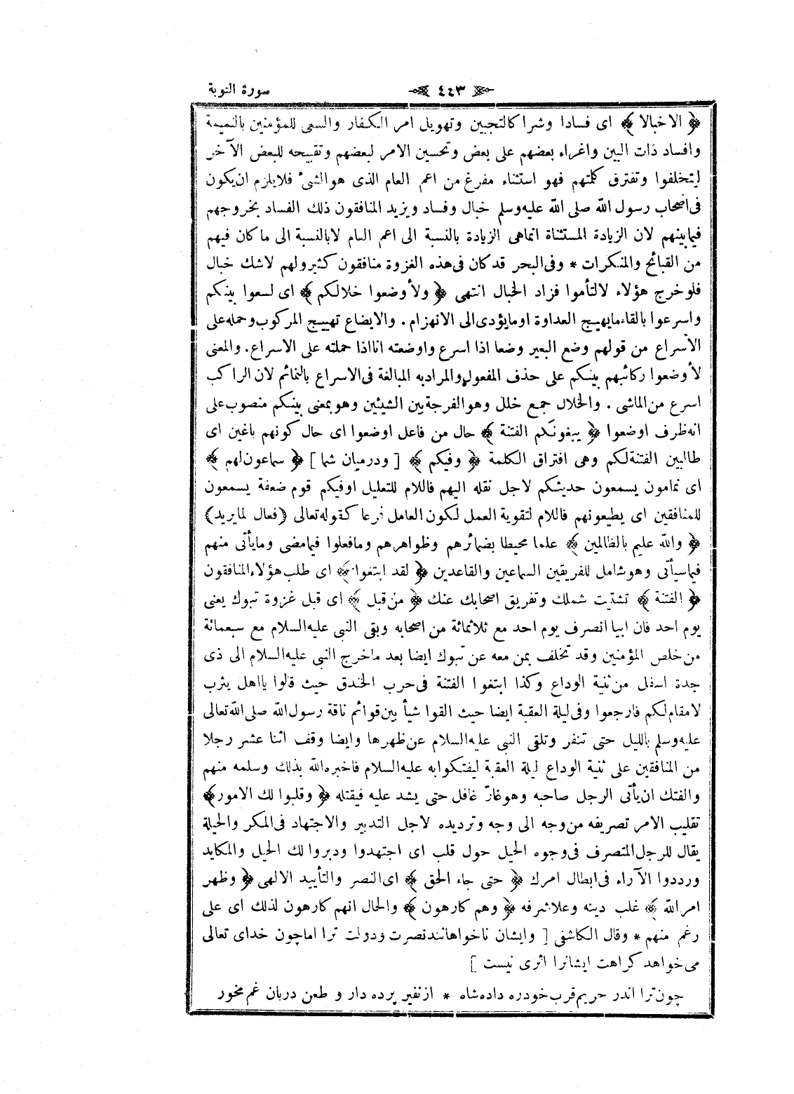 إِلَّا خَبالًا اى فسادا وشرا كالتجبين وتهويل امر الكفار والسعى للمؤمنين بالنميمة وإفساد ذات البين وإغراء بعضهم على بعض وتحسين الأمر لبعضهم وتقبيحه للبعض الآخر ليتخلفوا وتفترق كلمتهم فهو استثناء مفرغ من أعم العام الذي هو الشيء فلا يلزم ان يكون فى اصحاب رسول الله صلى الله عليه وسلم خبال وفساد ويزيد المنافقون ذلك الفساد بخروجهم فيما بينهم لان الزيادة المستثناة انما هى الزيادة بالنسبة الى أعم العام لا بالنسبة الى ما كان فيهم من القبائح والمنكرات وفى البحر قد كان فى هذه الغزوة منافقون كثير ولهم لا شك خبال فلو خرج هؤلاء لا لتأموا فزاد الخبال انتهى وَلَأَوْضَعُوا خِلالَكُمْ اى لسعوا بينكم واسرعوا بإلقاء ما يهيج العداوة او ما يؤدى الى الانهزام. والإيضاع تهيج المركوب وحمله على الاسراع من قولهم وضع البعير وضعا إذا اسرع واوضعته انا إذا حملته على الاسراع. والمعنى لأوضعوا ركائبهم بينكم على حذف المفعول والمراد به المبالغة فى الاسراع بالنمائم لان الراكب اسرع من الماشي. والخلال جمع خلل وهو الفرجة بين الشيئين وهو بمعنى بينكم منصوب على انه ظرف اوضعوا يَبْغُونَكُمُ الْفِتْنَةَ حال من فاعل اوضعوا اى حال كونهم باغين اى طالبين الفتنة لكم وهى افتراق الكلمة وَفِيكُمْ [ودر ميان شما] سَمَّاعُونَ لَهُمْ اى نمامون يسمعون حديثكم لاجل نقله إليهم فاللام للتعليل أو فيكم قوم ضعفة يسمعون للمنافقين اى يطيعونهم فاللام لتقوية العمل لكون العامل فرعا كقوله تعالى فَعَّالٌ لِما يُرِيدُ وَاللَّهُ عَلِيمٌ بِالظَّالِمِينَ علما محيطا بضمائرهم وظواهرهم وما فعلوا فيما مضى وما يأتى منهم فيما سيأتى وهو شامل للفريقين السماعين والقاعدين لَقَدِ ابْتَغَوُا اى طلب هؤلاء المنافقون الْفِتْنَةَ تشتيت شملك وتفريق أصحابك عنك مِنْ قَبْلُ اى قبل غزوة تبوك يعنى يوم أحد فان أبيا انصرف يوم أحد مع ثلاثمائة من أصحابه وبقي النبي عليه السلام مع سبعمائة من خلص المؤمنين وقد تخلف بمن معه عن تبوك ايضا بعد ما خرج النبي عليه السلام الى ذى جدة أسفل من ثنية الوداع وكذا ابتغوا الفتنة فى حرب الخندق حيث قالوا يا اهل يثرب لا مقام لكم فارجعوا وفى ليلة العقبة ايضا حيث القوا شيأ بين قوائم ناقة رسول الله صلى الله تعالى عليه وسلم بالليل حتى تنفر وتلقى النبي عليه السلام عن ظهرها وايضا وقف اثنا عشر رجلا من المنافقين على ثنية الوداع ليلة العقبة ليفتكوا به عليه السلام فاخبره الله بذلك وسلمه منهم والفتك ان يأتى الرجل صاحبه وهو غارّ غافل حتى يشد عليه فيقتله وَقَلَّبُوا لَكَ الْأُمُورَ تقليب الأمر تصريفه من وجه الى وجه وترديده لاجل التدبير والاجتهاد فى المكر والحيلة يقال للرجل المتصرف فى وجوه الحيل حول قلب اى اجتهدوا ودبروا لك الحيل والمكايد ورددوا الآراء فى ابطال أمرك حَتَّى جاءَ الْحَقُّ اى النصر والتأييد الإلهي وَظَهَرَ أَمْرُ اللَّهِ غلب دينه وعلا شرفه وَهُمْ كارِهُونَ والحال انهم كارهون لذلك اى على رغم منهم وقال الكاشفى [وايشان ناخواهانند نصرت ودولت ترا اما چون خداى تعالى مى خواهد كراهت ايشانرا اثرى نيست]
