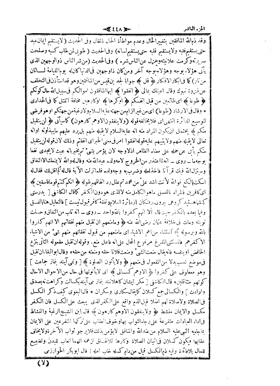 وقد ذم الله المنافقين بتغيير الحال وعدم مواطأة الحال بالمقال وفى الحديث (لا يستقيم ايمان عبد حتى يستقيم قلبه ولا يستقيم قلبه حتى يستقيم لسانه) وفى الحديث (طوبى لمن طاب كسبه وصلحت سريرته وكرمت علانيته وعزل عن الناس شره) وفى الحديث (من شر الناس ذو الوجهين الذي يأتى هؤلاء بوجه وهؤلاء بوجه آخر ومن كان ذا وجهين فى الدنيا كان له يوم القيامة لسانان من نار) كما فى أبكار الافكار قُلْ جوابا لجد بن قيس من المنافقين وهو قد استأذن فى التخلف عن غزوة تبوك وقال أعينك بمالى أَنْفِقُوا ايها المنافقون أموالكم فى سبيل الله حال كونكم طَوْعاً اى طائعين من قبل أنفسكم أَوْ كَرْهاً او كارهين مخافة القتل كما فى الحدادي وقال فى الإرشاد طَوْعاً اى من غير الزام من جهته عليه السلام ولا رغبة من جهتكم او هو فرضى لتوسيع الدائرة انتهى اى فلا يخالفه قوله وَلا يُنْفِقُونَ إِلَّا وَهُمْ كارِهُونَ كما سيأتى لَنْ يُتَقَبَّلَ مِنْكُمْ يحتمل ان يكون المراد منه انه عليه السلام لا يقبله منهم بل يرد عليهم ما يبذلونه او انه تعالى لا يقبله منهم ولا يثيبهم عليه قوله أنفقوا امر فى معنى الخبر اى أنفقتم وذلك لان قوله لن يتقبل منكم يأبى عن حمله على معناه الظاهر إذ لا وجه لان يؤمر بشىء ثم يخبر بانه عبث لا يجدى نفعا بوجه ما- روى- انه لما اعتذر من الخروج لامه ولده عبد الله عنه وقال له والله لا يمنعك الا النفاق وسينزل الله فيك قرآنا فاخذ نعله وضرب به وجه ولده فلما نزلت الآية قال له ألم اقل لك فقال له اسكت يا لكع فو الله لأنت أشد علىّ من محمد ثم علل رد انفاقهم بقوله إِنَّكُمْ كُنْتُمْ قَوْماً فاسِقِينَ اى كافرين فالمراد بالفسق ما هو الكامل منه لا الذي هو دون الكفر كما قال الكاشفى [بدرستى كه شما هستيد گروهى بيرون رفتگان از دائره اسلام ونفقه كافر قبول نيست] فالتعليل هنا بالفسق وفيما بعده بالكفر حيث قال ألا انهم كفروا بالله واحد- روى- انه تاب من النفاق وحسنت توبته ومات فى خلافة عثمان رضى الله عنه وَما مَنَعَهُمْ أَنْ تُقْبَلَ مِنْهُمْ نَفَقاتُهُمْ إِلَّا أَنَّهُمْ كَفَرُوا بِاللَّهِ وَبِرَسُولِهِ استثناء من أعم الأشياء اى ما منعهم من قبول نفقاتهم منهم شىء من الأشياء الا كفرهم فالمستثنى المفرغ مرفوع المحل على انه فاعل منع. وقوله ان تقبل مفعوله الثاني بنزع الخافض او بنفسه فانه يقال منعت الشيء ومنعت فلانا حقه ومنعته من حقه وقال ابو البقاء ان تقبل فى موضع نصب بدلا من المفعول فى منعهم وَلا يَأْتُونَ الصَّلاةَ [ونمى آيند بنماز جماعت] وهو معطوف على كفروا إِلَّا وَهُمْ كُسالى اى لا يأتونها فى حال من الأحوال الا حال كونهم متثاقلين قال الكاشفى [مگر ايشان كاهلانند بنماز مى آيند بكسالت وكراهت نه بصدق وأرادت] والكسالى جمع كسلان كما يقال سكارى وسكران قال البغوي كيف ذكر الكسل فى الصلاة ولا صلاة لهم أصلا قيل الذم واقع على الكفر الذي يبعث على الكسل فان الكفر مكسل والايمان منشط وَلا يُنْفِقُونَ إِلَّا وَهُمْ كارِهُونَ قال ابن الشيخ الرغبة والنشاط فى أداء العبادات متفرعة على رجاء الثواب بها وخوف العقاب على تركها المتفرعين على الايمان بما جاء به النبي عليه السلام من عند الله والمنافق لا يؤمن بذلك فلا يرجو ثواب الآخرة ولا يخاف عقابها فيكون كسلان فى إتيان الصلاة وكارها للانفاق لزعمه انهما اتعاب للبدن وتضييع للمال بلا فائدة وفيه ذم الكسل قيل من دام كسله خاب أمله: قال أبو بكر الخوارزمي