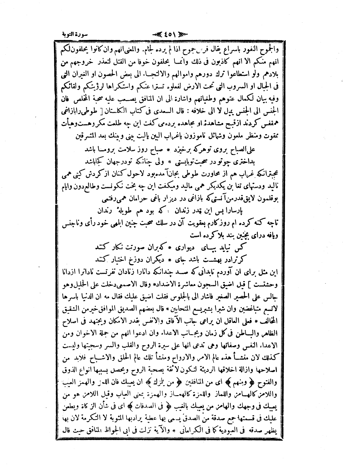 اين مثل براى ان آوردم تا بدانى كه صد چندانكه دانا را زنادان نفرتست نادانرا از دانا وحشتست] قيل أضيق السجون معاشرة الاضداد وقال الأصمعي دخلت على الخليل وهو جالس على الحصير الصغير فاشار الى بالجلوس فقلت أضيق عليك فقال مه ان الدنيا بأسرها لا تسع متباغضين وان شبرا بشبر يسع المتحابين قال بعضهم الصديق الموافق خير من الشقيق المخالف فعلى العاقل ان يراعى جانب الآفاق والأنفس بقدر الإمكان ويجتهد فى إصلاح الظاهر والباطن فى كل زمان ويجانب الأعداء وان ادعوا انهم من جملة الاخوان ومن الأعداء النفس وصفاتها وهى تدعى انها على سيرة الروح والقلب والسر وسجيتها وليست كذلك لان منشأ هذه عالم الأمر والأرواح ومنشأ تلك عالم الحلق والأشباح فلا بد من إصلاحها وازالة أخلاقها الرديئة لتكون لائقة بصحبة الروح ويحصل بسببها انواع الذوق والفتوح وَمِنْهُمْ اى من المنافقين مَنْ يَلْمِزُكَ ان يعيبك فان اللمز والهمز العيب واللامز كالهامز واللماز واللمزة كالهماز والهمزة بمعنى العياب وقيل اللامز هو من يعيبك فى وجهك والهامز من يعيبك بالغيب فِي الصَّدَقاتِ اى فى شأن الزكاة ويطعن عليك فى قسمتها جمع صدقة من الصدق يسمى بها عطية يراد بها المثوبة لا التكرمة لان بها يظهر صدقه فى العبودية كما فى الكرامانى والآية نزلت فى ابى الجواظ المنافق حيث قال