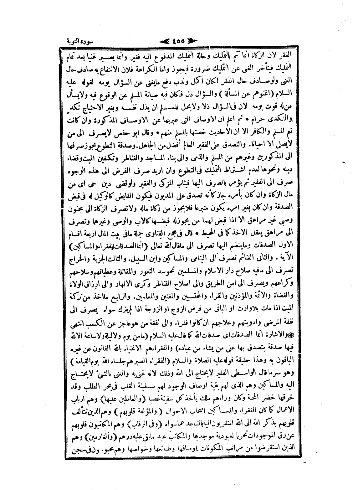 الفقر لان الزكاة انما تتم بالتمليك وحالة التمليك المدفوع اليه فقير وانما يصير غنيا بعد تمام التمليك فيتأخر الغنى عن التمليك ضرورة فيجوز واما الكراهة فلان الانتفاع به صادف حال الغنى ولو صادف حال الفقر لكان أكمل وندب دفع ما يغنى عن السؤال يومه لقوله عليه السلام (اغنوهم عن المسألة) والسؤال ذل فكان فيه صيانة المسلم عن الوقوع فيه ولا يسأل من له قوت يومه لان فى السؤال ذلا ولا يحل للمسلم ان يذل نفسه وبغير الاحتياج نكد والتكدي حرام ثم اعلم ان الأوصاف التي عبر بها عن الأوصاف المذكورة وان كانت تعم المسلم والكافر الا ان الأحاديث خصتها بالمسلم منهم وقال ابو حفص لا يصرف الى من لا يصلى الا أحيانا. والتصدق على الفقير العالم أفضل من الجاهل. وصدقة التطوع يجوز صرفها الى المذكورين وغيرهم من المسلم والذمي والى بناء المساجد والقناطر وتكفين الميت وقضاء دينه ونحوها لعدم اشتراط التمليك فى التطوع وان أريد صرف الفرض الى هذه الوجوه صرف الى الفقير ثم يؤمر بالصرف إليها فيثاب المزكى والفقير ولو قضى دين حى اى من مال الزكاة وان كان بأمره جاز كأنه تصدق على المديون فيكون القابض كالوكيل له فى قبض الصدقة وان كان بغير امره يكون متبرعا فلا يجوز من زكاة ماله ولا تصرف الزكاة الى مجنون وصبى غير مراهق الا إذا قبض لهما من يجوز له قبضها كالاب والوصي وغيرهما وتصرف الى مراهق يعقل الاخذ كما فى المحيط قال فى مجمع الفتاوى جملة ما فى بيت المال اربعة اقسام الاول الصدقات وما ينضم إليها تصرف الى ما قال الله تعالى إِنَّمَا الصَّدَقاتُ لِلْفُقَراءِ وَالْمَساكِينِ الآية. والثاني الغنائم تصرف الى اليتامى والمساكين وابن السبيل. والثالث الجزية والخراج تصرف الى ما فيه صلاح دار الإسلام والمسلمين نحو سد الثغور والمقاتلة وعطياتهم وسلاحهم وكراعهم