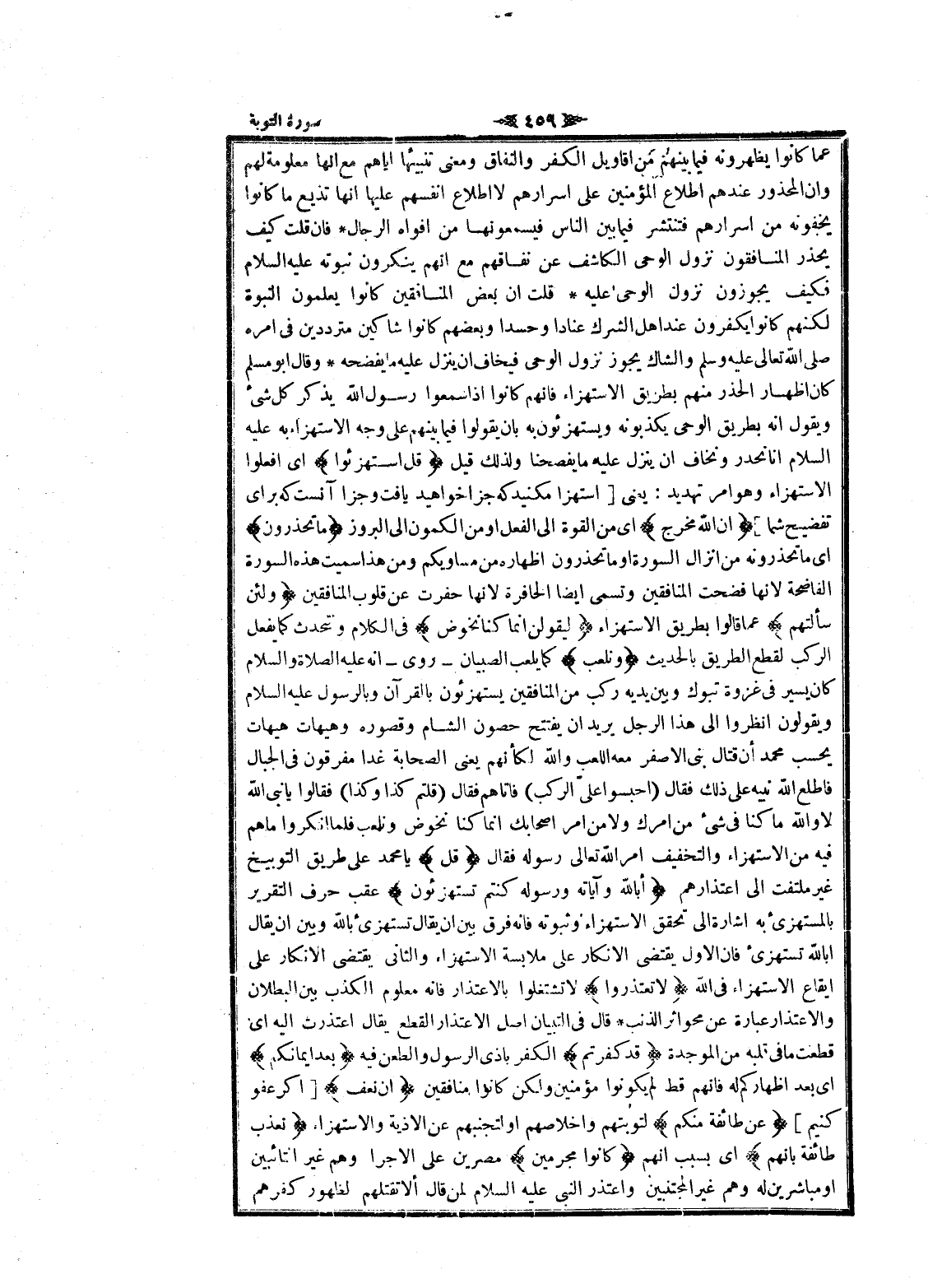عما كانوا يظهرونه فيما بينهم من أقاويل الكفر والنفاق ومعنى تنبيئها إياهم مع انها معلومة لهم وان المحذور عندهم اطلاع المؤمنين على أسرارهم لا اطلاع أنفسهم عليها انها تذيع ما كانوا يخفونه من أسرارهم فتنتشر فيما بين الناس فيسمعونها من أفواه الرجال فان قلت كيف يحذر المنافقون نزول الوحى الكاشف عن نفاقهم مع انهم ينكرون نبوته عليه السلام فكيف يجوزون نزول الوحى عيله قلت ان بعض المنافقين كانوا يعلمون النبوة لكنهم كانوا يكفرون عند اهل الشرك عنادا وحسدا وبعضهم كانوا شاكين مترددين فى امره صلى الله تعالى عليه وسلم والشاك يجوز نزول الوحى فيخاف ان ينزل عليه ما يفضحه وقال ابو مسلم كان اظهار الحذر منهم بطريق الاستهزاء فانهم كانوا إذا سمعوا رسول الله يذكر كل شىء ويقول انه بطريق الوحى يكذبونه ويستهزئون به بان يقولوا فيما بينهم على وجه الاستهزاء به عليه السلام انا نحدر ونخاف ان ينزل عليه ما يفصحنا ولذلك قيل قُلِ اسْتَهْزِؤُا اى افعلوا الاستهزاء وهو امر تهديد: يعنى [استهزا مكنيد كه جزا خواهيد يافت وجزا آنست كه براى تفضيح شما] إِنَّ اللَّهَ مُخْرِجٌ اى من القوة الى الفعل او من الكمون الى البروز ما تَحْذَرُونَ اى ما تحذرونه من إنزال السورة او ما تحذرون إظهاره من مساويكم ومن هذا سميت هذه السورة الفاضحة لانها فضحت المنافقين وتسمى ايضا الحافرة لانها حفرت عن قلوب المنافقين وَلَئِنْ سَأَلْتَهُمْ عما قالوا بطريق الاستهزاء لَيَقُولُنَّ إِنَّما كُنَّا نَخُوضُ فى الكلام ونتحدث كما يفعل الركب لقطع الطريق بالحديث وَنَلْعَبُ كما يلعب الصبيان- روى- انه عليه الصلاة والسلام كان يسير فى غزوة تبوك وبين يديه ركب من المنافقين يستهزئون بالقرآن وبالرسول عليه السلام ويقولون انظروا الى هذا الرجل يريد ان يفتتح حصون الشام وقصوره وهيهات هيهات يحسب محمد أن قتال بنى الأصفر معه اللعب والله لكأنهم يعنى الصحابة غدا مفرقون فى الجبال فاطلع الله نبيه على ذلك فقال (احبسوا علىّ الركب) فاتاهم فقال (قلتم كذا وكذا) فقالوا يا نبى الله لا والله ما كنا فى شىء من أمرك ولا من امر أصحابك انما كنا نخوض ونلعب فلما أنكروا ما هم فيه من الاستهزاء والتخفيف امر الله تعالى رسوله فقال قُلْ يا محمد على طريق التوبيخ غير ملتفت الى اعتذارهم أَبِاللَّهِ وَآياتِهِ وَرَسُولِهِ كُنْتُمْ تَسْتَهْزِؤُنَ عقب حرف التقرير بالمستهزأ به اشارة الى تحقق الاستهزاء وثبوته فانه فرق بين ان يقال تستهزئ بالله وبين ان يقال أبا لله تستهزئ فان الاول يقتضى الإنكار على ملابسة الاستهزاء والثاني يقتضى الإنكار على إيقاع الاستهزاء فى الله لا تَعْتَذِرُوا لا تشتغلوا بالاعتذار فانه معلوم الكذب بين البطلان والاعتذار عبارة عن محواثر الذنب قال فى التبيان اصل الاعتذار القطع يقال اعتذرت اليه اى قطعت ما فى قلبه من الموجدة قَدْ كَفَرْتُمْ الكفر بأذى الرسول والطعن فيه بَعْدَ إِيمانِكُمْ اى بعد اظهاركم له فانهم قط لم يكونوا مؤمنين ولكن كانوا منافقين إِنْ نَعْفُ [اگر عفو كنيم] عَنْ طائِفَةٍ مِنْكُمْ لتوبتهم وإخلاصهم او لتجنبهم عن الاذية والاستهزاء نُعَذِّبْ طائِفَةً بِأَنَّهُمْ اى بسبب انهم كانُوا مُجْرِمِينَ مصرين على الاجرام وهم غير التائبين او مباشرين له وهم غير المجتنبين واعتذر النبي عليه السلام لمن قال ألا تقتلهم لظهور كفرهم