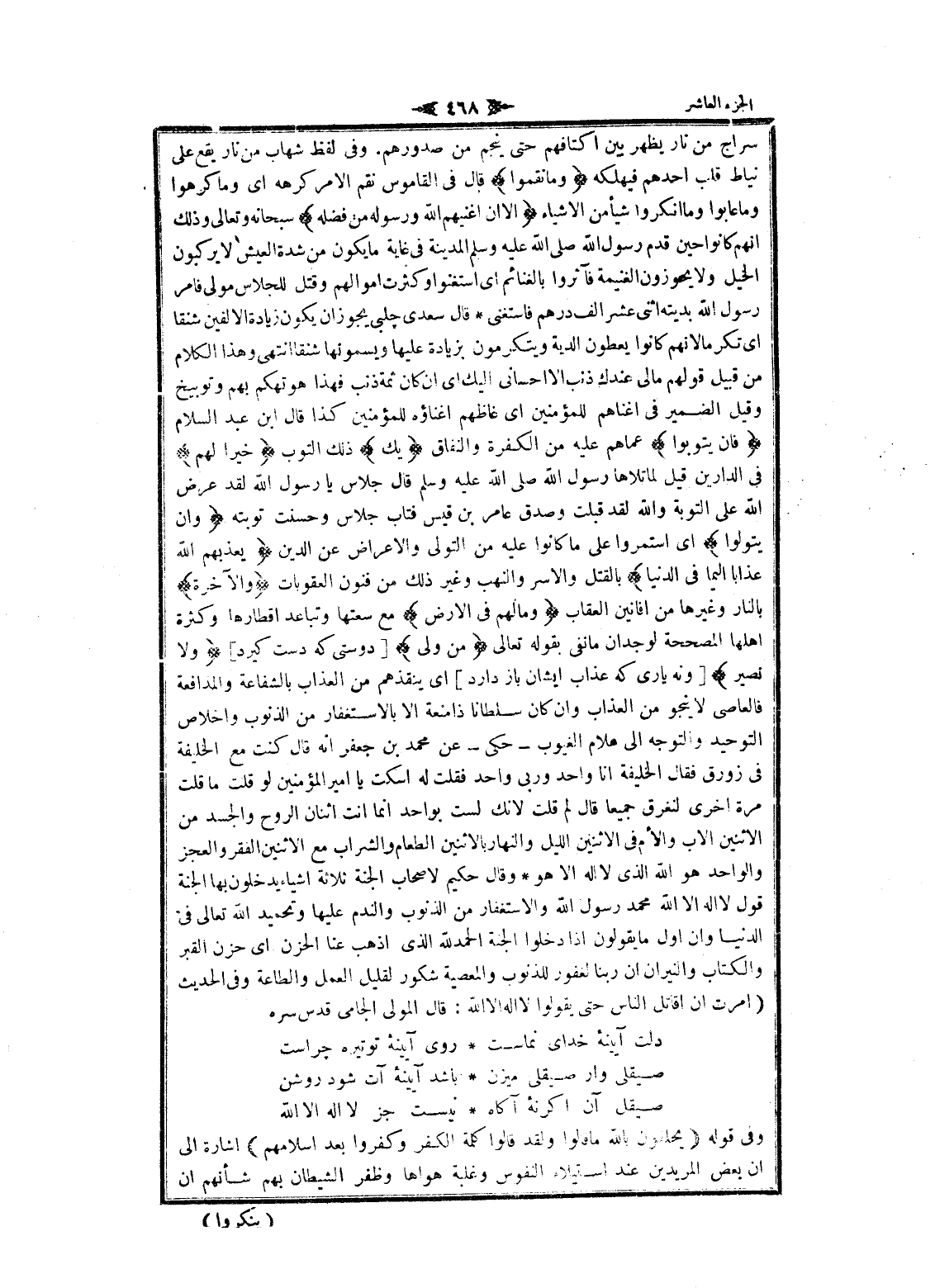 اى غاظهم اغناؤه للمؤمنين كذا قال ابن عبد السلام فَإِنْ يَتُوبُوا عماهم عليه من الكفرة والنفاق يَكُ ذلك التوب خَيْراً لَهُمْ فى الدارين قيل لما تلاها رسول الله صلى الله عليه وسلم قال جلاس يا رسول الله لقد عرض الله على التوبة والله لقد قبلت وصدق عامر بن قيس فتاب جلاس وحسنت توبته وَإِنْ يَتَوَلَّوْا اى استمروا على ما كانوا عليه من التولي والاعراض عن الدين يُعَذِّبْهُمُ اللَّهُ عَذاباً أَلِيماً فِي الدُّنْيا بالقتل والاسر والنهب وغير ذلك من فنون العقوبات وَالْآخِرَةِ بالنار وغيرها من أفانين العقاب وَما لَهُمْ فِي الْأَرْضِ مع سعتها وتباعد أقطارها وكثرة أهلها المصححة لوجدان ما نفى بقوله تعالى مِنْ وَلِيٍّ [دوستى كه دست گيرد] وَلا نَصِيرٍ [ونه يارى كه عذاب ايشان باز دارد] اى ينقذهم من العذاب بالشفاعة والمدافعة فالعاصى لا ينجو من العذاب وان كان سلطانا ذا منعة الا بالاستغفار من الذنوب واخلاص التوحيد والتوجه الى علام الغيوب- حكى- عن محمد بن جعفر انه قال كنت مع الخليفة فى زورق فقال الخليفة انا واحد وربى واحد فقلت له اسكت يا امير المؤمنين لو قلت ما قلت مرة اخرى لنغرق جميعا قال لم قلت لانك لست بواحد انما أنت اثنان الروح والجسد من الاثنين الأب والأم فى الاثنين الليل والنهار بالاثنين الطعام والشراب مع الاثنين الفقر والعجز والواحد هو الله الذي لا اله الا هو وقال حكيم لاصحاب الجنة ثلاثة أشياء يدخلون بها الجنة قول لا اله الا الله محمد رسول الله والاستغفار من الذنوب والندم عليها وتحميد الله تعالى فى الدنيا وان أول ما يقولون إذا دخلوا الجنة الحمد لله الذي اذهب عنا الحزن اى حزن القبر والكتاب والنيران ان ربنا لغفور للذنوب والمعصية شكور لقليل العمل والطاعة وفى الحديث (أمرت ان أقاتل الناس حتى يقولوا لا اله الا الله: قال المولى الجامى قدس سره
