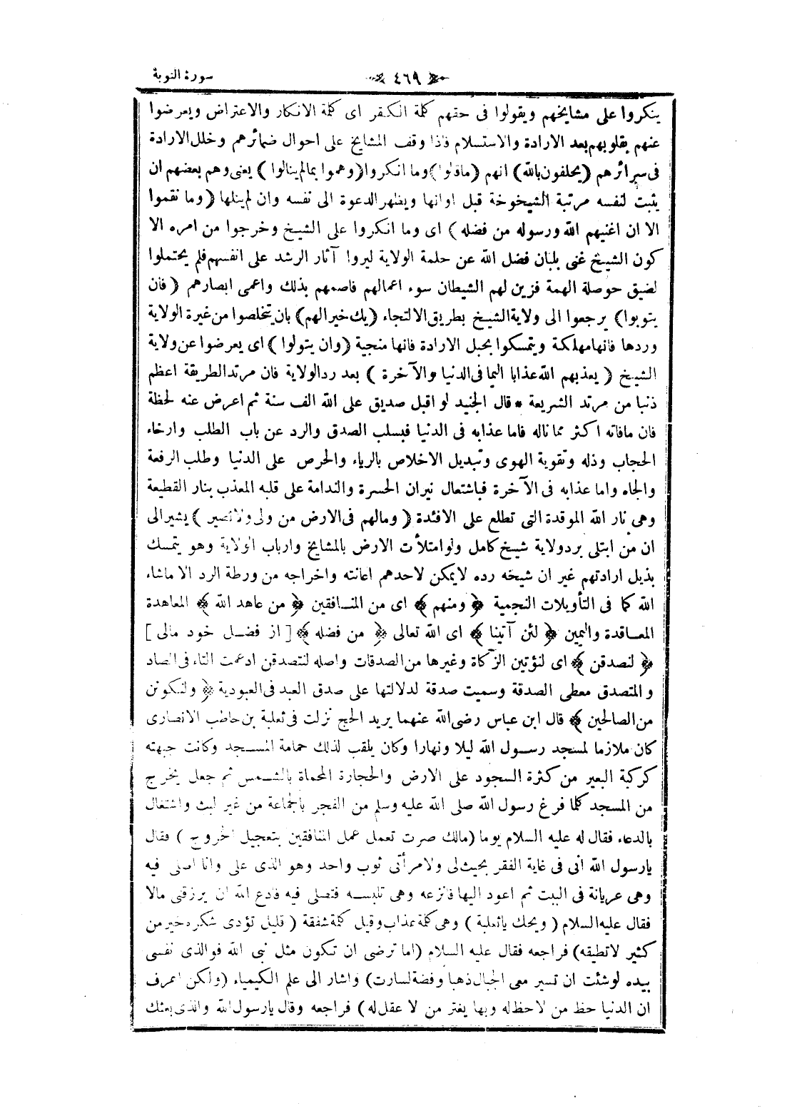 ينكروا على مشايخهم ويقولوا فى حقهم كلمة الكفر اى كلمة الإنكار والاعتراض ويعرضوا عنهم بقلوبهم بعد الارادة والاستسلام فاذا وقف المشايخ على احوال ضمائرهم وخلل الارادة فى سرائرهم يَحْلِفُونَ بِاللَّهِ انهم ما قالُوا وما أنكروا وَهَمُّوا بِما لَمْ يَنالُوا يعنى وهم بعضهم ان يثبت لنفسه مرتبة الشيخوخة قبل أوانها ويظهر الدعوة الى نفسه وان لم ينلها وَما نَقَمُوا إِلَّا أَنْ أَغْناهُمُ اللَّهُ وَرَسُولُهُ مِنْ فَضْلِهِ اى وما أنكروا على الشيخ وخرجوا من امره الا كون الشيخ غنى بلبان فضل الله عن حلمة الولاية ليروا آثار الرشد على أنفسهم فلم يحتملوا لضيق حوصلة الهمة فزين لهم الشيطان سوء أعمالهم فاصمهم بذلك وأعمى أبصارهم فَإِنْ يَتُوبُوا يرجعوا الى ولاية الشيخ بطريق الالتجاء يَكُ خَيْراً لَهُمْ بان يتخلصوا من غيرة الولاية وردها فانها مهلكة ويتمسكوا بحبل الارادة فانها منجية وَإِنْ يَتَوَلَّوْا اى يعرضوا عن ولاية الشيخ يُعَذِّبْهُمُ اللَّهُ عَذاباً أَلِيماً فِي الدُّنْيا وَالْآخِرَةِ بعد رد الولاية فان مرتد الطريقة أعظم ذنبا من مرتد الشريعة قال الجنيد لو اقبل صديق على الله الف سنة ثم اعرض عنه لحظة فان ما فاته اكثر مما ناله فاما عذابه فى الدنيا فبسلب الصدق والرد عن باب الطلب وإرخاء الحجاب وذله وتقوية الهوى وتبديل الإخلاص بالرياء والحرص على الدنيا وطلب الرفعة والجاه واما عذابه فى الآخرة فباشتعال نيران الحسرة والندامة على قلبه المعذب بنار القطيعة وهى نار الله الموقدة التي تطلع على الافئدة وَما لَهُمْ فِي الْأَرْضِ مِنْ وَلِيٍّ وَلا نَصِيرٍ يشير الى ان من ابتلى برد ولاية شيخ كامل ولو امتلأت الأرض بالمشايخ وارباب الولاية وهو يتمسك بذيل إرادتهم غير ان شيخه رده لا يمكن لاحدهم اعانته وإخراجه من ورطة الرد الا ما شاء الله كما فى التأويلات النجمية وَمِنْهُمْ اى من المنافقين مَنْ عاهَدَ اللَّهَ المعاهدة المعاقدة واليمين لَئِنْ آتانا اى الله تعالى مِنْ فَضْلِهِ [از فضل خود مالى] لَنَصَّدَّقَنَّ اى لنؤتين الزكاة وغيرها من الصدقات وأصله لنتصدقن أدغمت التاء فى الصاد والمتصدق معطى الصدقة وسميت صدقة لدلالتها على صدق العبد فى العبودية وَلَنَكُونَنَّ مِنَ الصَّالِحِينَ قال ابن عباس رضى الله عنهما يريد الحج نزلت فى ثعلبة بن حاطب الأنصاري كان ملازما لمسجد رسول الله ليلا ونهارا وكان يلقب لذلك حمامة المسجد وكانت جبهته كركبة البعير من كثرة السجود على الأرض والحجارة المحماة بالشمس ثم جعل يخرج من المسجد كلما فرغ رسول الله صلى الله عليه وسلم من الفجر بالجماعة من غير لبث واشتغال بالدعاء فقال له عليه السلام يوما (مالك صرت تعمل عمل المنافقين بتعجيل الخروج) فقال يا رسول الله انى فى غاية الفقر بحيث لى ولامرأتى ثوب واحد وهو الذي على وانا أصلي فيه وهى عريانة فى البيت ثم أعود إليها فانزعه وهى تلبسه فتصلى فيه فادع الله ان يرزقنى مالا فقال عليه السلام (ويحك يا ثعلبة) وهى كلمة عذاب وقيل كلمة شفقة (قليل تؤدى شكره خير من كثير لا تطيقه) فراجعه فقال عليه السلام (اما ترضى ان تكون مثل نبى الله فو الذي نفسى بيده لو شئت ان تسير معى الجبال ذهبا وفضة لسارت) وأشار الى علم الكيمياء (ولكن اعرف ان الدنيا حظ من لا حظ له وبها يغتر من لا عقل له) فراجعه وقال يا رسول الله والذي بعثك