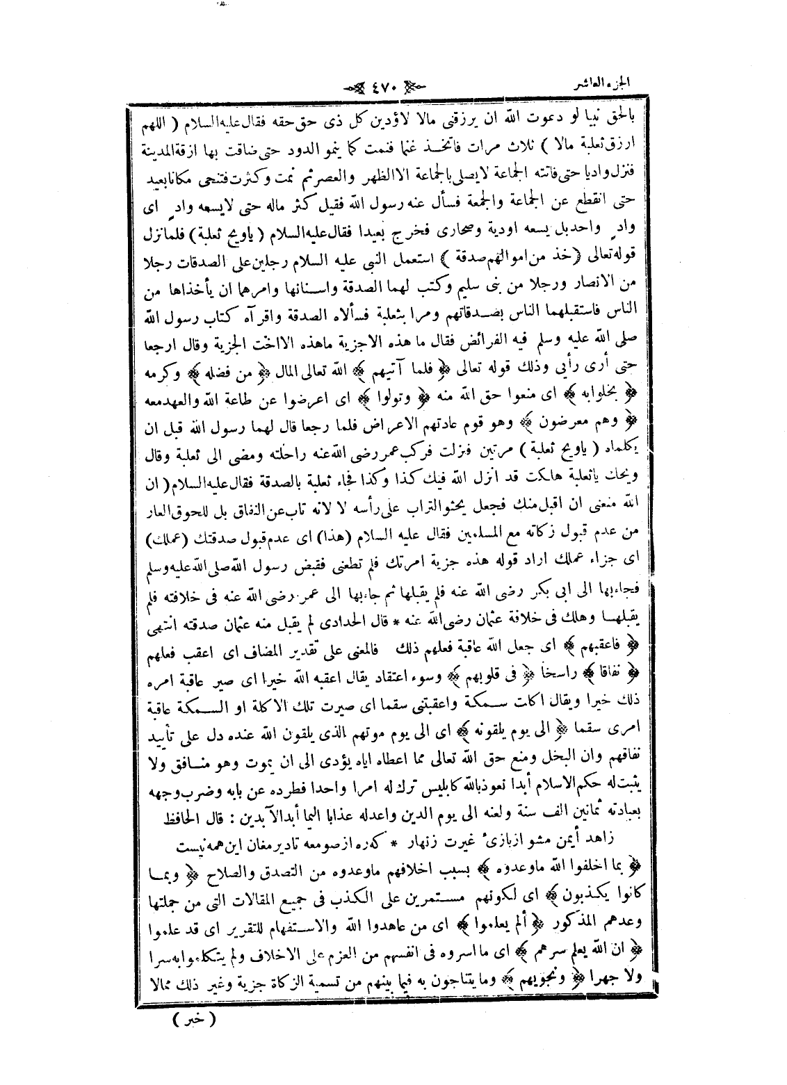 بالحق نبيا لو دعوت الله ان يرزقنى مالا لاؤدين كل ذى حق حقه فقال عليه السلام (اللهم ارزق ثعلبة مالا) ثلاث مرات فاتخذ غنما فنمت كما ينمو الدود حتى ضاقت بها ازقة المدينة فنزل واديا حتى فاتته الجماعة لا يصلى بالجماعة الا الظهر والعصر ثم نمت وكثرت فتنحى مكانا بعيد حتى انقطع عن الجماعة والجمعة فسأل عنه رسول الله فقيل كثر ماله حتى لا يسعه واد اى واد واحد بل يسعه اودية وصحارى فخرج بعيدا فقال عليه السلام يا ويح ثعلبة فلما نزل قوله تعالى خُذْ مِنْ أَمْوالِهِمْ صَدَقَةً استعمل النبي عليه السلام رجلين على الصدقات رجلا من الأنصار ورجلا من نبى سليم وكتب لهما الصدقة واسنانها وأمرهما ان يأخذاها من الناس فاستقبلهما الناس بصدقاتهم ومرا بثعلبة فسألاه الصدقة وأقرءاه كتاب رسول الله صلى الله عليه وسلم فيه الفرائض فقال ما هذه الاجزية ما هذه الا اخت الجزية وقال ارجعا حتى أرى رأيى وذلك قوله تعالى فَلَمَّا آتاهُمْ الله تعالى المال مِنْ فَضْلِهِ وكرمه بَخِلُوا بِهِ اى منعوا حق الله منه وَتَوَلَّوْا اى اعرضوا عن طاعة الله والعهد معه وَهُمْ مُعْرِضُونَ وهو قوم عادتهم الاعراض فلما رجعا قال لهما رسول الله قبل ان يكلماه (يا ويح ثعلبة) مرتين فنزلت فركب عمر رضى الله عنه راحلته ومضى الى ثعلبة وقال ويحك يا ثعلبة هلكت قد انزل الله فيك كذا وكذا فجاء ثعلبة بالصدقة فقال عليه السلام (ان الله منعنى ان اقبل منك فجعل يحثو التراب على رأسه لا لانه تاب عن النفاق بل للحوق العار من عدم قبول زكاته مع المسلمين فقال عليه السلام (هذا) اى عدم قبول صدقتك (عملك) اى جزاء عملك أراد قوله هذه جزية امرتك فلم تطعنى فقبض رسول الله صلى الله عليه وسلم فجاء بها الى أبي بكر رضى الله عنه فلم يقبلها ثم جاء بها الى عمر رضى الله عنه فى خلاقته فلم يقبلها وهلك فى خلافة عثمان رضى الله عنه قال الحدادي لم يقبل منه عثمان صدقته انتهى فَأَعْقَبَهُمْ اى جعل الله عاقبة فعلهم ذلك فالمعنى على تقدير المضاف اى أعقب فعلهم نِفاقاً راسخا فِي قُلُوبِهِمْ وسوء اعتقاد يقال أعقبه الله خيرا اى صير عاقبة امره ذلك خيرا ويقال أكلت سمكة واعقبتنى سقما اى صيرت تلك الاكلة او السمكة عاقبة امرى سقما إِلى يَوْمِ يَلْقَوْنَهُ اى الى يوم موتهم الذي يلقون الله عنده دل على تأييد نفاقهم وان البخل ومنع حق الله تعالى مما أعطاه إياه يؤدى الى ان يموت وهو منافق ولا يثبت له حكم الإسلام أبدا نعوذ بالله كابليس ترك له امرا واحدا فطرده عن بابه وضرب وجهه بعبادته ثمانين الف سنة ولعنه الى يوم الدين وأعد له عذابا أليما أبد الآبدين: قال الحافظ