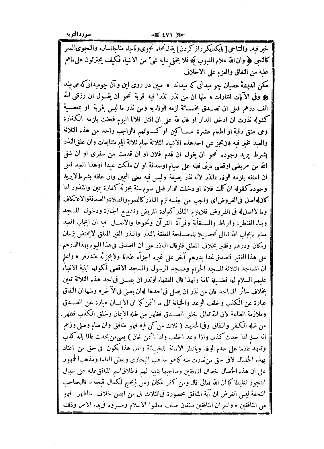 او ان شفى الله من مريضى او قضى دينى فلله على صيام او صدقة او ان ملكت عبدا او هذا العبد فعلى ان اعتقه يلزمه الوفاء بما نذر لانه نذر بصيغة وليس فيه معنى اليمين وان علقه بشرط لا يريد وجوده كقوله ان كلمت فلانا او دخلت الدار فعلى صوم سنة يجزئه كفارة يمين والمنذور إذا كان له اصل فى الفروض اى واجب من جنسه لزم الناذر كالصوم والصلاة والصدقة والاعتكاف وما لا اصل له فى الفروض فلا يلزم الناذر كعيادة المريض وتشييع الجنازة ودخول المسجد وبناء القنطرة والرباط والسقاية وقرآة القرآن ونحوها والأصل فيه ان إيجاب العبد معتبر بايجاب الله تعالى تحصيلا للمصلحة المعلقة بالنذر والنذر الغير المعلق لا يختض بزمان ومكان ودرهم وفقير بخلاف المعلق فلو قال الناذر على ان أتصدق فى هذا اليوم بهذا الدرهم على هذا الفقير فتصدق غدا بدرهم آخر على غيره اجزأه عندنا ولا يجزئه عند زفر واعلم ان المساجد الثلاثة المسجد الحرام ومسجد الرسول والمسجد الأقصى لكونها ابنية الأنبياء عليهم السلام لها فضيلة تامة ولهذا قال الفقهاء لو نذر ان يصلى فى أحد هذه الثلاثة تعين بخلاف سائر المساجد فان من نذر ان يصلى فى أحدها له ان يصلى فى الآخر ومنها ان النفاق عبارة عن الكذب وخلف الوعد والخيانة الى ما ائتمن كما ان الايمان عبارة عن الصدق وملازمة الطاعة لان الله تعالى خلق الصدق فظهر من ظله الايمان وخلق الكذب فظهر من ظله الكفر والنفاق وفى الحديث (ثلاث من كن فيه فهو منافق وان صام وصلى وزعم انه مسلم إذا حدث كذب وإذا وعد اخلف وإذا ائتمن خان) يعنى من يحدث عالما بانه كذب وتعهد عازما على عدم الوفاء وينتظر الامانة للخيانة ولعل هذا يكون فى حق من اعتاد بهذه الخصال لا فى حق من ندرت منه كما هو مذهب البخاري وبعض العلماء ومذهب الجمهور على ان هذه الخصال خصال المنافقين وصاحبها شبيه لهم فاطلاق اسم المنافق عليه على سبيل التجوز تغليظا كما ان الله تعالى قال ومن كفر مكان ومن لم يحج لكمال قبحه قال صاحب التحفة ليس الغرض ان آية المنافق محصورة فى الثلاث بل من ابطن خلاف ما اظهر فهو من المنافقين واعلم ان المنافقين صنفان صنف معلنوا الإسلام ومسروه فى بدء الأمر وذلك