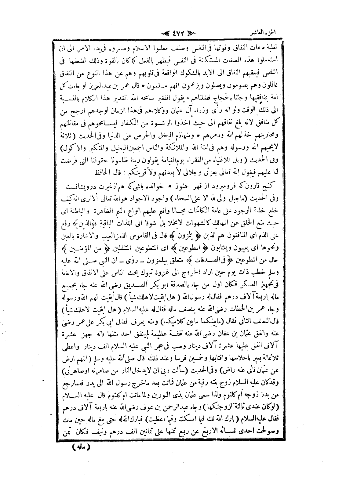 لغلبة صفات النفاق وقوتها فى النفس وصنف معلنوا الإسلام ومسروه فى بدء الأمر الى ان استعملوا هذه الصفات المستكنة فى النفس فيظهر بالفعل كما كان بالقوة وذلك لضعفها فى النفس فيعقبهم النفاق الى الابد بالشكوك الواقعة فى قلوبهم وهم عن هذا النوع من النفاق غافلون وهم يصومون ويصلون ويزعمون انهم مسلمون قال عمر بن عبد العزيز لو جاءت كل امة بمنافقيها وجئنا بالحجاج فضلناهم يقول الفقير سامحه الله القدير هذا الكلام بالنسبة الى ذلك الوقت ولو انه رأى وزراء آل عثمان ووكلاءهم فى هذا الزمان لوجدهم أرجح من كل منافق لانه بلغ نفاقهم الى حيث أخذوا الرشوة من الكفار ليسامحوهم فى مقاتلتهم ومحاربتهم خذ لهم الله ودمرهم ومنها ذم البخل والحرص على الدنيا وفى الحديث (ثلاثة لا يحبهم الله ورسوله وهم فى لعنة الله والملائكة والناس أجمعين البخيل والمتكبر والأكول) وفى الحديث (ويل للاغنياء من الفقراء يوم القيامة يقولون ربنا ظلمونا حقوقنا التي فرضت لنا عليهم فيقول الله تعالى بعزتي وجلالى لأبعدنهم ولأقربنكم: قال الحافظ