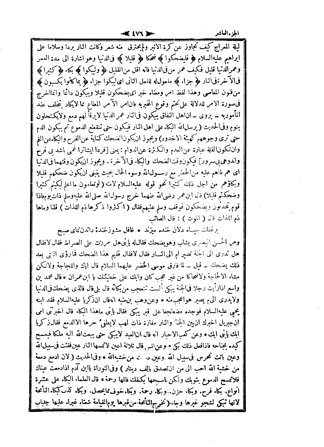 ومر الحسن البصري بشاب وهو يضحك فقال له يا بنى هل مررت على الصراط فقال لا فقال هل تدرى الى الجنة تصير أم الى النار فقال لا فقال ففيم هذا الضحك فما رؤى الفتى بعد ذلك يضحك- قيل- لما فارق موسى الخضر عليهما السلام قال إياك واللجاجة ولا تكن مشاء الا لحاجة ولا ضحاكا من غير عجب كان وابك على خطيئتك يا ابن عمران قال محمد بن واسع إذا رأيت رجلا فى الجنة يبكى ألست تتعجب من بكائه قال بلى قال فالذى يضحك فى الدنيا ولا يدرى الى م يصير هو اعجب منه وعن وهب بن منبه انه قال ان زكريا عليه السلام فقد ابنه يحيى عليه السلام فوجده مضطجعا على قبر يبكى فقال يا بنى ما هذا البكاء قال أخبرتني أمي ان جبريل أخبرك ان بين الجنة والنار مفازة ذات لهب لا يطفىء حرها الا الدمع فقال زكريا ابك يا بنى ابك وعن كعب الأحبار انه قال ان العبد لا يبكى حتى يبعث الله اليه ملكا فيمسح كبده بجناحه فاذا فعل ذلك بكى وعن انس قال ثلاثة أعين لا تمسها النار عين فقئت فى سبيل الله وعين باتت تحرس فى سبيل الله وعين دمعت من خشية الله وفى الحديث (لان ادمع دمعة من خشية الله أحب الى من ان تصدق بألف دينار) وفى التوراة يا ابن آدم إذا دمعت عيناك فلا تمسح الدموع بثوبك ولكن امسحها بكفك فانها رحمة قال العلماء البكاء على عشرة انواع. بكاء فرح. وبكاء حزن وبكاء رحمة. وبكاء خوف مما يحصل. وبكاء كذب كبكاء النائحة لانها تبكى لشجو غيرها وجاء (تخرج النائحة من قبرها يوم القيامة شعثاء غبراء عليها جلباب