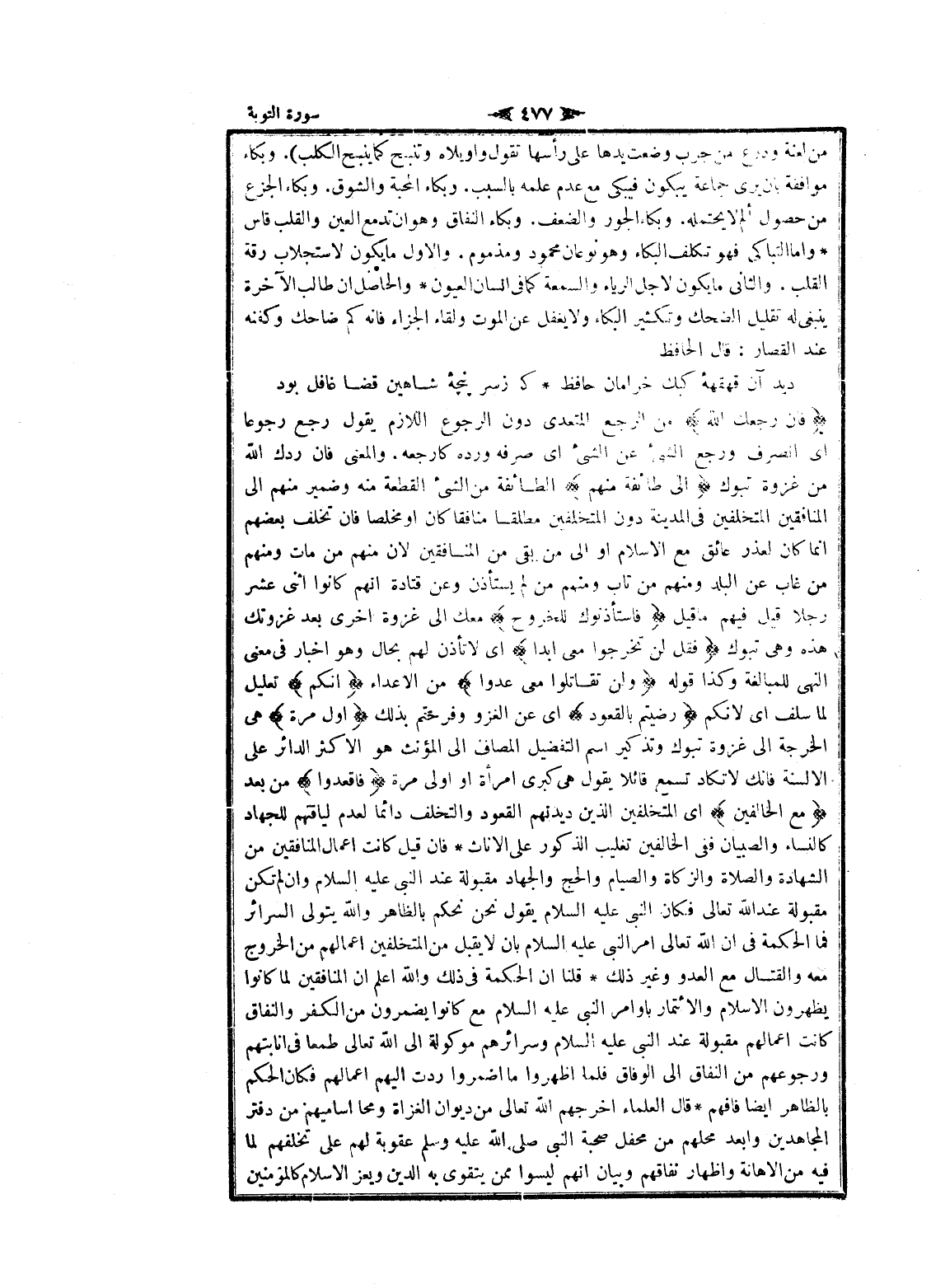 فَإِنْ رَجَعَكَ اللَّهُ من الرجع المتعدى دون الرجوع اللازم يقول رجع رجوعا اى انصرف ورجع الشيء عن الشيء اى صرفه ورده كارجعه. والمعنى فان ردك الله من غزوة تبوك إِلى طائِفَةٍ مِنْهُمْ الطائفة من الشيء القطعة منه وضمير منهم الى المنافقين المتخلفين فى المدينة دون المتخلفين مطلقا منافقا كان او مخلصا فان تخلف بعضهم انما كان لعذر عائق مع الإسلام او الى من بقي من المنافقين لان منهم من مات ومنهم من غاب عن البلد ومنهم من تاب ومنهم من لم يستأذن وعن قتادة انهم كانوا اثنى عشر رجلا قيل فيهم ما قيل فَاسْتَأْذَنُوكَ لِلْخُرُوجِ معك الى غزوة اخرى بعد غزوتك هذه وهى تبوك فَقُلْ لَنْ تَخْرُجُوا مَعِيَ أَبَداً اى لا تأذن لهم بحال وهو اخبار فى معنى النهى للمبالغة وكذا قوله وَلَنْ تُقاتِلُوا مَعِيَ عَدُوًّا من الأعداء إِنَّكُمْ تعليل لما سلف اى لانكم رَضِيتُمْ بِالْقُعُودِ اى عن الغزو وفرحتم بذلك أَوَّلَ مَرَّةٍ هى الخرجة الى غزوة تبوك وتذكير اسم التفضيل المصاف الى المؤنث هو الأكثر الدائر على الالسنة فانك لا تكاد تسمع قائلا يقول هى كبرى امرأة او اولى مرة فَاقْعُدُوا من بعد مَعَ الْخالِفِينَ اى المتخلفين الذين ديدنهم القعود والتخلف دائما لعدم لياقتهم للجهاد كالنساء والصبيان ففى الخالفين تغليب الذكور على الإناث فان قيل كانت اعمال المنافقين من الشهادة والصلاة والزكاة والصيام والحج والجهاد مقبولة عند النبي عليه السلام وان لم تكن مقبولة عند الله تعالى فكان النبي عليه السلام يقول نحن نحكم بالظاهر والله يتولى السرائر فما الحكمة فى ان الله تعالى امر النبي عليه السلام بان لا يقبل من المتخلفين أعمالهم من الخروج معه والقتال مع العدو وغير ذلك قلنا ان الحكمة فى ذلك والله اعلم ان المنافقين لما كانوا يظهرون الإسلام والائتمار باوامر النبي عليه السلام مع كانوا يضمرون من الكفر والنفاق كانت أعمالهم مقبولة عند النبي عليه السلام وسرائرهم موكولة الى الله تعالى طمعا فى انابتهم ورجوعهم من النفاق الى الوفاق فلما أظهروا ما اضمروا ردت إليهم أعمالهم فكان الحكم بالظاهر ايضا فافهم قال العلماء أخرجهم الله تعالى من ديوان الغزاة ومحا أساميهم من دفتر المجاهدين وابعد محلهم من محفل صحبة النبي صلى الله عليه وسلم عقوبة لهم على تخلفهم لما فيه من الاهانة واظهار نفاقهم وبيان انهم ليسوا ممن يتقوى به الدين ويعز الإسلام كالمؤمنين