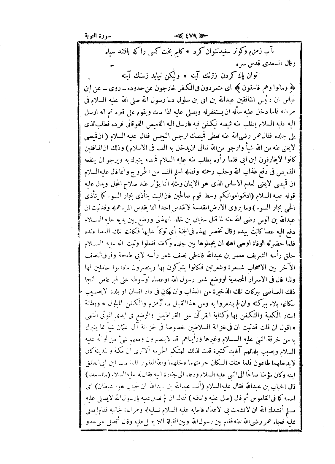 وَماتُوا وَهُمْ فاسِقُونَ اى متمردون فى الكفر خارجون عن حدوده- روى- عن ابن عباس ان رئيس المنافقين عبد الله بن ابى بن سلول دعا رسول الله صلى الله عليه السلام فى مرضه فلما دخل عليه سأله ان يستغفر له ويصلى عليه إذا مات ويقوم على قبره ثم انه أرسل اليه عليه السلام يطلب منه قميصه ليكفن فيه فارسل اليه القميص الفوقاني فرده فطلب الذي يلى جلده فقال عمر رضى الله عنه تعطى فميصك لرجس النجس فقال عليه السلام (ان قميصى لا يغنى عنه من الله شيأ وارجوا من الله تعالى ان يدخل به الف فى الإسلام) وذلك ان المنافقين كانوا لا يفارقون ابن ابى فلما رأوه يطلب منه عليه السلام قميصه يتبرك به ويرجو ان ينفعه القميص فى دفع عذاب الله وجلب رحمته وفضله اسلم الف من الخروج وانما قال عليه السلام ان قميصى لا يغنى لعدم الأساس الذي هو الايمان ومثله انما يؤثر عند صلاح المحل ويدل عليه قوله عليه السلام (ادفنوا امواتكم وسط قوم صالحين فان الميت يتأذى بجار السوء كما يتأذى الحي بجار السوء) وما يروى الأرض المقدسة لا تقدس أحدا انما يقدس المرء عمله وقد ثبت ان عبد الله بن أنيس رضى الله عنه لما قتل سفيان بن خالد الهذلي ووضع بين يديه عليه السلام دفع اليه عصا كانت بيده وقال تخصر بهذه فى الجنة أي توكأ عليها فكانت تلك العصا عنده فلما حضرته الوفاة اوصى اهله ان يجعلوها بين جلده وكفنه ففعلوا وثبت انه عليه السلام حلق رأسه الشريف معمر بن عبد الله فاعطى نصف شعر رأسه لابى طلحة وفرق النصف الآخر بين الاصحاب شعرة وشعرتين فكانوا يتبركون بها وينصرون ما داموا حاملين لها ولذا قال فى الاسرار المحمدية لو وضع شعر رسول الله او عصاه او سوطه على قبر عاص لنجا ذلك العاصي ببركات تلك الذخيرة من العذاب وان كان فى دار انسان او بلدة لا يصيب سكانها بلاء ببركته وان لم يشعروا به ومن هذا القبيل ماء زمزم والكفن المبلول به وبطانة أستار الكعبة والتكفن بها وكتابة القرآن على القراطيس والوضع فى أيدي الموتى انتهى أقول ان قلت قد ثبت ان فى خزانة السلاطين خصوصا فى خزانة آل عثمان شيأ مما يتبرك به من خرقة النبي عليه السلام وغيرها ورأيناهم قد لا ينصرون ومعهم شىء من لوائه عليه السلام ويصبب بلدتهم آفات كثيرة قلت لذلك لهتكم الحرمة ألا ترى ان مكة والمدينة كان لا يدخلهما