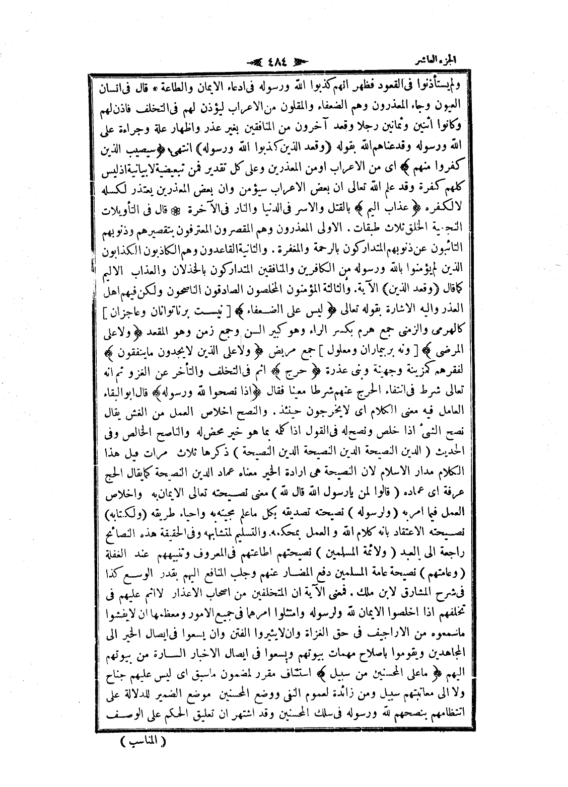 ولم يستأذنوا فى القعود فظهر انهم كذبوا الله ورسوله فى ادعاء الايمان والطاعة قال فى انسان العيون وجاء المعذرون وهم الضعفاء والمقلون من الاعراب ليؤذن لهم فى التخلف فاذن لهم وكانوا اثنين وثمانين رجلا وقعد آخرون من المنافقين بغير عذر واظهار علة وجراءة على الله ورسوله وقد عناهم الله بقوله وَقَعَدَ الَّذِينَ كَذَبُوا اللَّهَ وَرَسُولَهُ انتهى سَيُصِيبُ الَّذِينَ كَفَرُوا مِنْهُمْ اى من الاعراب او من المعذرين وعلى كل تقدير فمن تبعيضية لا بيانية إذ ليس كلهم كفرة وقد علم الله تعالى ان بعض الاعراب سيؤمن وان بعض المعذرين يعتذر لكسله لا لكفره عَذابٌ أَلِيمٌ بالقتل والاسر فى الدنيا والنار فى الآخرة قال فى التأويلات النجمية الخلق ثلاث طبقات. الاولى المعذرون وهم المقصرون المعترفون بتقصيرهم وذنوبهم التائبون عن ذنوبهم المتداركون بالرحمة والمغفرة. والثانية القاعدون وهم الكاذبون الكذابون الذين لم يؤمنوا بالله ورسوله من الكافرين والمنافقين المتداركون بالخذلان والعذاب الأليم كما قال وَقَعَدَ الَّذِينَ الآية. والثالثة المؤمنون المخلصون الصادقون الناصحون ولكن فيهم اهل العذر واليه الاشارة بقوله تعالى لَيْسَ عَلَى الضُّعَفاءِ [نيست بر ناتوانان وعاجزان] كالهرمى والزمنى جمع هرم بكسر الراء وهو كبير السن وجمع زمن وهو المقعد وَلا عَلَى الْمَرْضى [ونه بر بيماران ومعلول] جمع مريض وَلا عَلَى الَّذِينَ لا يَجِدُونَ ما يُنْفِقُونَ لفقرهم كمزينة وجهينة وبنى عذرة حَرَجٌ اثم فى التخلف والتأخر عن الغزو ثم انه تعالى شرط فى انتفاء الحرج عنهم شرطا معينا فقال إِذا نَصَحُوا لِلَّهِ وَرَسُولِهِ قال ابو البقاء العامل فيه معنى الكلام اى لا يخرجون حينئذ. والنصح اخلاص العمل من الغش يقال نصح الشيء إذا خلص ونصح له فى القول إذا كلمه بما هو خير محض له والناصح الخالص وفى الحديث (الدين النصيحة الدين النصيحة الدين النصيحة) ذكرها ثلاث مرات قيل هذا الكلام مدار الإسلام لان النصيحة هى ارادة الخير معناه عماد الدين النصيحة كما يقال الحج عرفة اى عماده (قالوا لمن يا رسول الله قال لله) معنى نصيحته تعالى الايمان به واخلاص العمل فيما امر به (ولرسوله) نصيحته تصديقه بكل ما علم مجيئه به واحياء طريقه (ولكتابه) نصيحته الاعتقاد بانه كلام الله والعمل بمحكمه والتسليم لمتشابهه وفى الحقيقة هذه النصائح راجعة الى العبد (ولائمة المسلمين) نصيحتهم اطاعتهم فى المعروف وتنبيههم عند الغفلة (وعامتهم) نصيحة عامة المسلمين دفع المضار عنهم وجلب المنافع إليهم بقدر الوسع كذا فى شرح المشارق لابن ملك. فمعنى الآية ان المتخلفين من اصحاب الاعذار لا اثم عليهم فى تخلفهم إذا أخلصوا الايمان لله ولرسوله وامتثلوا أمرهما فى جميع الأمور ومعظمها ان لا يفشوا ما سمعوه من الأراجيف فى حق الغزاة وان لا يثيروا الفتن وان يسعوا فى إيصال الخير الى المجاهدين ويقوموا بإصلاح مهمات بيوتهم ويسعوا فى إيصال الاخبار السارة من بيوتهم إليهم ما عَلَى الْمُحْسِنِينَ مِنْ سَبِيلٍ استئناف مقرر لمضمون ما سبق اى ليس عليهم جناح ولا الى معاتبتهم سبيل ومن زائدة لعموم النفي ووضع المحسنين موضع الضمير للدلالة على انتظامهم بنصحهم لله ورسوله فى سلك المحسنين وقد اشتهر ان تعليق الحكم على الوصف