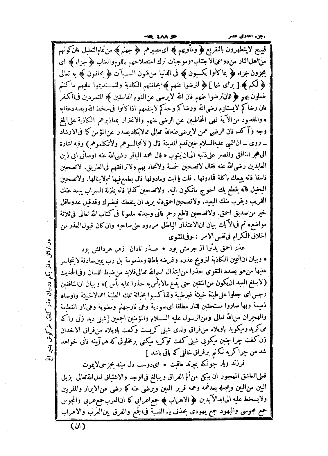 وبيان ان اليمين الكاذبة لترويج عذره وغرضه باطلة ومذمومة بل رب يمين صادقة لا يتجاسر عليها من هو بصدد التقوى حذرا من ابتذال اسم الله تعالى فلا بد من ضبط اللسان وفى الحديث (لا يبلغ العبد ان يكون من المتقين حتى يدع ما لا بأس به حذرا مما به بأس) وبيان ان المنافقين رجس اى جعلوا على طينة خبيثة غير طيبة ولذا كسبوا بخباثة تلك الطينة أعمالا خبيثة واوصافا ذميمة وبها صاروا مستحقين للنار مطلقا اى صورية وهى نار جهنم ومعنوية وهى نار القطيعة والهجران من الله تعالى ومن الرسول عليه السلام والمؤمنين أجمعين [شبلى ديد زنى را كه مى كريد وميگويد يا ويلاه من فراق ولدي شبلى گريست وگفت يا ويلاه من فراق الأخدان زن گفت چرا چنين ميگويى شبلى گفت تو گريه ميكنى بر مخلوقى كه هر آيينه فانى خواهد شد من چرا گريه نكنم بر فراق خالقى كه باقى باشد]
