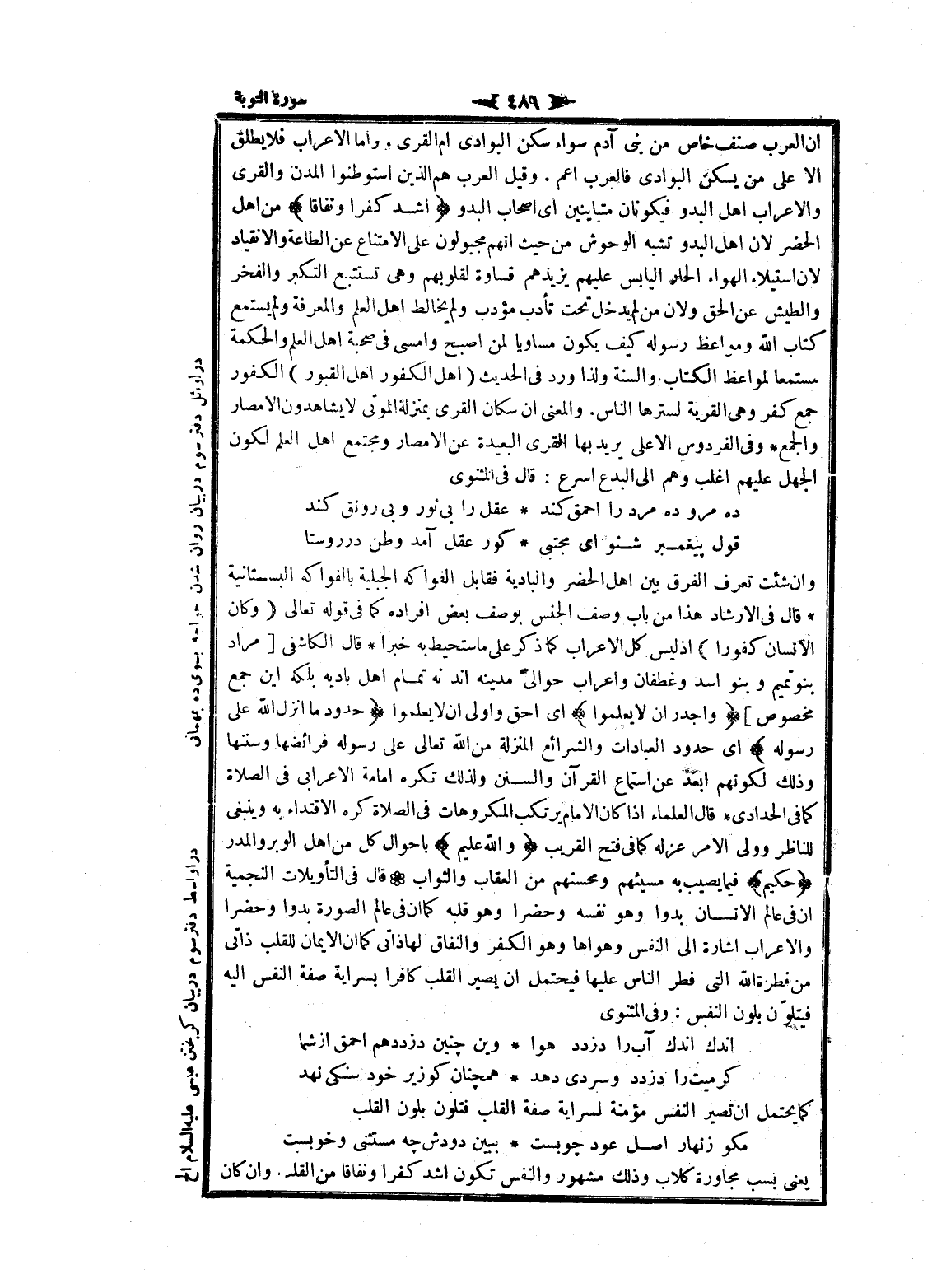 وان شئت تعرف الفرق بين اهل الحضر والبادية فقابل الفواكه الجبلية بالفواكه البستانية قال فى الإرشاد هذا من باب وصف الجنس بوصف بعض افراده كما فى قوله تعالى وَكانَ الْإِنْسانُ كَفُوراً إذ ليس كل الاعراب كما ذكر على ما ستحيط به خبرا قال الكاشفى [مراد بنو تميم وبنو اسد وغطفان واعراب حوالىء مدينه اند نه تمام اهل باديه بلكه اين جمع مخصوص] وَأَجْدَرُ أَلَّا يَعْلَمُوا اى أحق واولى ان لا يعلموا حُدُودَ ما أَنْزَلَ اللَّهُ عَلى رَسُولِهِ اى حدود العبادات والشرائع المنزلة من الله تعالى على رسوله فرائضها وسننها وذلك لكونهم ابعد عن استماع القرآن والسنن ولذلك تكره امامة الاعرابى فى الصلاة كما فى الحدادي قال العلماء إذا كان الامام يرتكب المكروهات فى الصلاة كره الاقتداء به وينبغى للناظر وولى الأمر عزله كما فى فتح القريب وَاللَّهُ عَلِيمٌ بأحوال كل من اهل الوبر والمدر حَكِيمٌ فيما يصيب به مسيئهم ومحسنهم من العقاب والثواب قال فى التأويلات النجمية ان فى عالم الإنسان بدوا وهو نفسه وحضرا وهو قلبه كما ان فى عالم الصورة بدوا وحضرا والاعراب اشارة الى النفس وهواها وهو الكفر والنفاق لها ذاتى كما ان الايمان للقلب ذاتى من فطرة الله التي فطر الناس عليها فيحتمل ان يصير القلب كافرا بسراية صفة النفس اليه فيتلوّن بلون النفس: وفى المثنوى