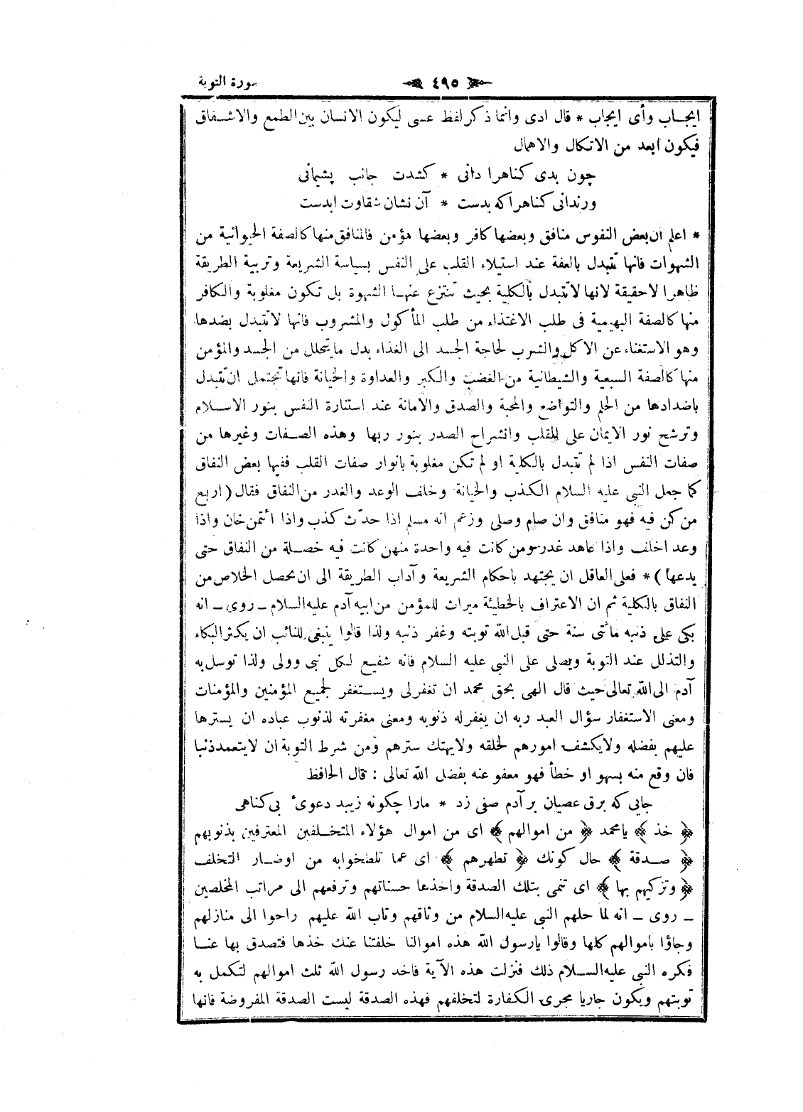اعلم ان بعض النفوس منافق وبعضها كافر وبعضها مؤمن فالمنافق منها كالصفة الحيوانية من الشهوات فانها تتبدل بالعفة عند استيلاء القلب على النفس بسياسة الشريعة وتربية الطريقة ظاهرا لا حقيقة لانها لا تتبدل بالكلية بحيث تنتزع عنها الشهوة بل تكون مغلوبة والكافر منها كالصفة البهيمية فى طلب الاغتذاء من طلب المأكول والمشروب فانها لا تتبدل بضدها وهو الاستغناء عن الاكل والشرب لحاجة الجسد الى الغذاء بدل ما يتحلل من الجسد والمؤمن منها كالصفة السبعية والشيطانية من الغضب والكبر والعداوة والخيانة فانها تحتمل ان تتبدل بأضدادها من الحلم والتواضع والمحبة والصدق والامانة عند استنارة النفس بنور الإسلام وترشح نور الايمان على القلب وانشراح الصدر بنور ربها وهذه الصفات وغيرها من صفات النفس إذا لم تتبدل بالكلية او لم تكن مغلوبة بانوار صفات القلب ففيها بعض النفاق كما جعل النبي عليه السلام الكذب والخيانة وخلف الوعد والغدر من النفاق فقال (اربع من كن فيه فهو منافق وان صام وصلى وزعم انه مسلم إذا حدّث كذب وإذا ائتمن خان وإذا وعد اخلف وإذا عاهد غدر ومن كانت فيه واحدة منهن كانت فيه خصلة من النفاق حتى يدعها) فعلى العاقل ان يجتهد باحكام الشريعة وآداب الطريقة الى ان يحصل الخلاص من النفاق بالكلية ثم ان الاعتراف بالخطيئة ميراث للمؤمن من أبيه آدم عليه السلام- روى- انه بكى على ذنبه مائتى سنة حتى قبل الله توبته وغفر ذنبه ولذا قالوا ينبغى للنائب ان يكثر البكاء والتذلل عند التوبة ويصلى على النبي عليه السلام فانه شفيع لكل نبى وولى ولذا توسل به آدم الى الله تعالى حيث قال الهى بحق محمد ان تغفر لى ويستغفر لجميع المؤمنين والمؤمنات ومعنى الاستغفار سؤال العبد ربه ان يغفر له ذنوبه ومعنى مغفرته لذنوب عباده ان يسترها عليهم بفضله ولا يكشف أمورهم لخلقه ولا يهتك سترهم ومن شرط التوبة ان لا يتعمد ذنبا فان وقع منه بسهو او خطأ فهو معفو عنه بفضل الله تعالى: قال الحافظ