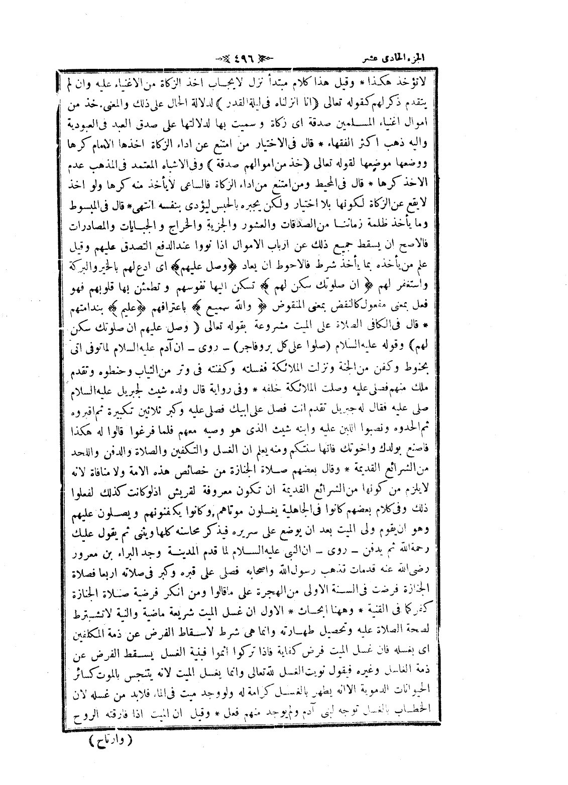 الجنة ونزلت الملائكة فغسلته وكفنته فى وتر من الثياب وحنطوه وتقدم ملك منهم فصلى عليه وصلت الملائكة خلفه وفى رواية قال ولده شيث لجبريل عليه السلام صلى عليه فقال له جبريل تقدم أنت فصل على أبيك فصلى عليه وكبر ثلاثين تكبيرة ثم اقبروه ثم الحدوه ونصبوا اللبن عليه وابنه شيث الذي هو وصيه معهم فلما فرغوا قالوا له هكذا فاصنع بولدك وإخوتك فانها سنتكم ومنه يعلم ان الغسل والتكفين والصلاة والدفن واللحد من الشرائع القديمة وقال بعضهم صلاة الجنازة من خصائص هذه الامة ولا منافاة لانه لا يلزم من كونها من الشرائع القديمة ان تكون معروفة لقريش إذ لو كانت كذلك لفعلوا ذلك وفى كلام بعضهم كانوا فى الجاهلية يغسلون موتاهم وكانوا يكفنونهم ويصلون عليهم وهو ان يقوم ولى الميت بعد ان يوضع على سريره فيذكر محاسنه كلها ويثنى ثم يقول عليك رحمة الله ثم يدفن- روى- ان النبي عليه السلام لما قدم المدينة وجد البراء بن معرور رضى الله عنه قد مات فذهب رسول الله وأصحابه فصلى على قبره وكبر فى صلاته أربعا فصلاة الجنازة فرضت فى السنة الاولى من الهجرة على ما قالوا ومن أنكر فرضية صلاة الجنازة كفر كما فى القنية وهاهنا ابحاث الاول ان غسل الميت شريعة ماضية والنية لا تشترط لصحة الصلاة عليه وتحصيل طهارته وانما هى شرط لاسقاط الفرض عن ذمة المكلفين اى بغسله فان غسل الميت فرض كفاية فاذا تركوا أثموا فبنية الغسل يسقط الفرض عن ذمة الغاسل وغيره فيقول نويت الغسل لله تعالى وانما يغسل الميت لانه يتنجس بالموت كسائر الحيوانات الدموية الا انه يطهر بالغسل كرامة له ولو وجد ميت فى الماء فلا بد من غسله لان الخطاب بالغسل توجه لبنى آدم ولم يوجد منهم فعل وقيل ان الميت إذا فارقته الروح