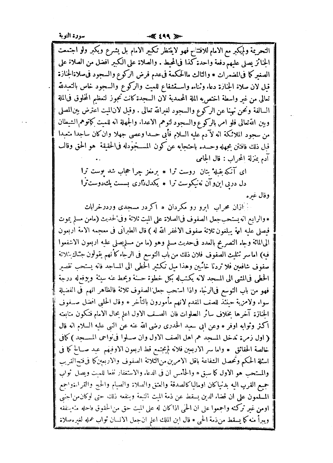 التحريمة ولم يكبر مع الامام للافتتاح فهو لا ينتظر تكبر الامام بل يشرع ويكبر ولو اجتمعت الجنائز يصلى عليهم دفعة واحدة كذا فى المحيط. والصلاة على الكبير أفضل من الصلاة على الصغير كما فى المضمرات والثالث ما الحكمة فى عدم فرض الركوع والسجود فى صلاة الجنازة قيل لان صلاة الجنازة دعاء وثناءه واستشفاع للميت والركوع والسجود خاص بالتعبد لله تعالى من غير واسطة اختص به الملة المحمدية لان السجدة كانت تجوز لتعظيم المخلوق فى الملة السالفة ونحن نهينا عن الركوع والسجود لغير الله تعالى. وقيل لان الميت اعترض بين المصلى وبين الله تعالى فلو امر بالركوع والسجود لتوهم الأعداء والجهلة انه للميت كما توهم الشيطان من سجود الملائكة انه لآدم عليه السلام فأبى حسدا وعصى جهلا وان كان ساجدا متعبدا قبل ذلك فافتتن بجهله وحسده باحتجابه عن كون المسجود له فى الحقيقة هو الحق وقالب آدم بمنزلة المحراب: قال الجامى