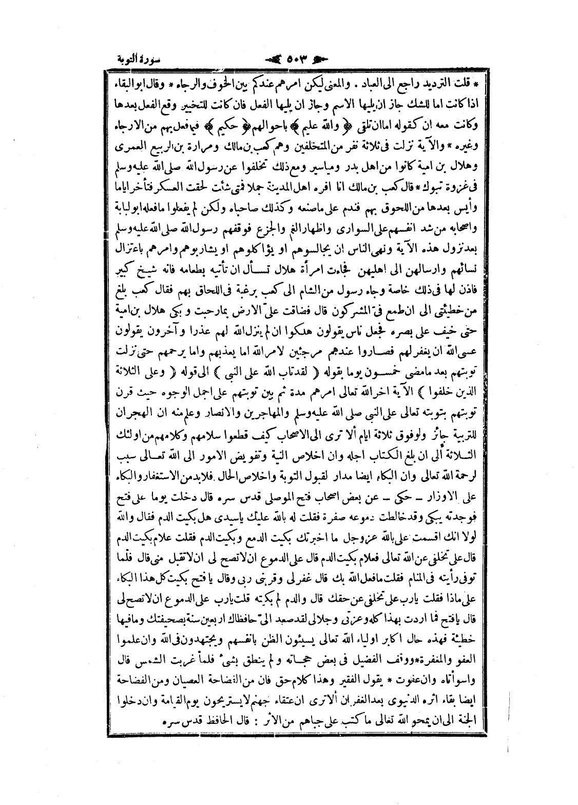 قلت الترديد راجع الى العباد. والمعنى ليكن أمرهم عندكم بين الخوف والرجاء وقال ابو البقاء إذا كانت اما للشك جاز ان يليها الاسم وجاز ان يليها الفعل فان كانت للتخيير وقع الفعل بعدها وكانت معه ان كقوله اما ان تلقى وَاللَّهُ عَلِيمٌ بأحوالهم حَكِيمٌ فيما فعل بهم من الارجاء وغيره والآية نزلت فى ثلاثة نفر من المتخلفين وهم كعب بن مالك ومرارة بن الربيع العمرى وهلال بن امية كانوا من اهل بدر ومياسير ومع ذلك تخلفوا عن رسول الله صلى الله عليه وسلم فى غزوة تبوك قال كعب بن مالك انا أفره اهل المدينة جملا فمتى شئت لحقت العسكر فتأخر أياما وأيس بعدها من اللحوق بهم فندم على ما صنعه وكذلك صاحباه ولكن لم يفعلوا ما فعله ابو لبابة وأصحابه من شد أنفسهم على السواري واظهار الغم والجزع فوقفهم رسول الله صلى الله عليه وسلم بعد نزول هذه الآية ونهى الناس ان يجالسوهم او يؤاكلوهم او يشاربوهم وأمرهم باعتزال نسائهم وارسالهن الى اهليهن فجاءت امرأة هلال تسأل ان تأتيه بطعامه فانه شيخ كبير فاذن لها فى ذلك خاصة وجاء رسول من الشام الى كعب برغبة فى اللحاق بهم فقال كعب بلغ من خطيئتى الى ان طمع فىّ المشركون قال فضاقت علىّ الأرض بما رحبت وبكى هلال بن امية حتى خيف على بصره فجعل ناس يقولون هلكوا ان لم ينزل الله لهم عذرا وآخرون يقولون عسى الله ان يغفر لهم فصاروا عندهم مرجئين لامر الله اما يعذبهم واما يرحمهم حتى نزلت توبتهم بعد ما مضى خمسون يوما بقوله لَقَدْ تابَ اللَّهُ عَلَى النَّبِيِّ الى قوله وَعَلَى الثَّلاثَةِ الَّذِينَ خُلِّفُوا الآية اخر الله تعالى أمرهم مدة ثم بين توبتهم على أجمل الوجوه حيث قرن توبتهم بتوبته تعالى على النبي صلى الله عليه وسلم والمهاجرين والأنصار وعلم منه ان الهجران للتربية جائز ولوفوق ثلاثة ايام ألا ترى الى الاصحاب كيف قطعوا سلامهم وكلامهم من أولئك الثلاثة الى ان بلغ الكتاب اجله وان اخلاص النية وتفويض الأمور الى الله تعالى سبب لرحمة الله تعالى وان البكاء ايضا مدار لقبول التوبة واخلاص الحال فلا بد من الاستغفار والبكاء على الأوزار- حكى- عن بعض اصحاب فتح الموصلي قدس سره قال دخلت يوما على فتح فوجدته يبكى وقد خالطت دموعه صفرة فقلت له بالله عليك يا سيدى هل بكيت الدم فقال والله لولا انك أقسمت على بالله عز وجل ما أخبرتك بكيت الدمع وبكيت الدم فقلت علام بكيت الدم قال على تخلفى عن الله تعالى فعلام بكيت الدم قال على الدموع ان لا تصح لى ان لا تقبل منى قال فلما توفى رأيته فى المنام فقلت ما فعل الله بك قال غفر لى وقربنى ربى وقال بافتح بكيت كل هذا البكاء على ماذا فقلت يا رب على تخلفى عن حقك قال والدم لم بكيته قلت يا رب على الدموع ان لا تصح لى قال يا فتح فما أردت بهذا كله وعزتى وجلالى لقد صعد الىّ حافظاك أربعين سنة بصحيفتك وما