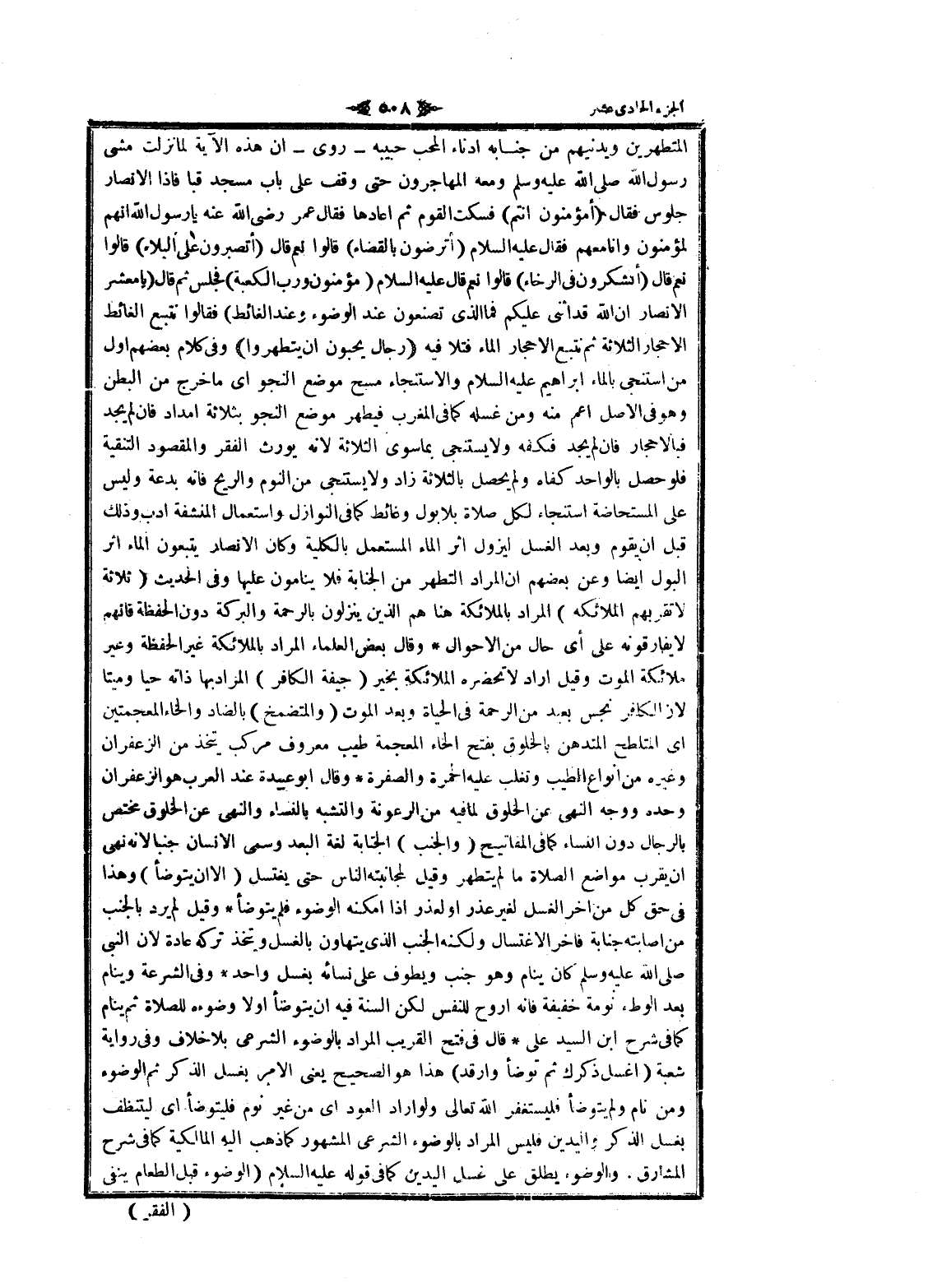 فان لم يجد فبالاحجار فان لم يجد فكفه ولا يستنجى بما سوى الثلاثة لانه يورث الفقر والمقصود التنقية فلو حصل بالواحد كفاه ولم يحصل بالثلاثة زاد ولا يستنجى من النوم والريح فانه بدعة وليس على المستحاضة استنجاء لكل صلاة بلا بول وغائط كما فى النوازل واستعمال المنشفة ادب وذلك قبل ان يقوم وبعد الغسل ليزول اثر الماء المستعمل بالكلية وكان الأنصار يتبعون الماء اثر البول ايضا وعن بعضهم ان المراد التطهر من الجنابة فلا ينامون عليها وفى الحديث (ثلاثة لا تقربهم الملائكة) المراد بالملائكة هنا هم الذين ينزلون بالرحمة والبركة دون الحفظة فانهم لا يفارقونه على أي حال من الأحوال وقال بعض العلماء المراد بالملائكة غير الحفظة وغير ملائكة الموت وقيل أراد لا تحضره الملائكة بخير (جيفة الكافر) المراد بها ذاته حيا وميتا لان الكافر نجس بعيد من الرحمة فى الحياة وبعد الموت (والمتضمخ) بالضاد والخاء المعجمتين اى المتلطخ المتدهن بالخلوق بفتح الخاء المعجمة طيب معروف مركب يتخذ من الزعفران وغيره من انواع الطيب وتغلب عليه الحمرة والصفرة وقال ابو عبيدة عند العرب هو الزعفران وحده ووجه النهى عن الخلوق لما فيه من الرعونة والتشبه بالنساء والنهى عن الخلوق مختص بالرجال دون النساء كما فى المفاتيح (والجنب) الجنابة لغة البعد وسمى الإنسان جنبا لانه نهى ان يقرب مواضع الصلاة ما لم يتطهر وقيل لمجانبته الناس حتى يغتسل (الا ان يتوضأ) وهذا فى حق كل من اخر الغسل لغير عذر او لعذر إذا امكنه الوضوء فلم يتوضأ وقيل لم يرد بالجنب من أصابته جنابة فاخر الاغتسال ولكنه الجنب الذي يتهاون بالغسل ويتخذ تركه عادة لان النبي صلى الله عليه وسلم كان ينام وهو جنب ويطوف على نسائه بغسل واحد وفى الشرعة وينام بعد الوطء نومة خفيفة فانه أروح للنفس لكن السنة فيه ان يتوضأ اولا وضوءه للصلاة ثم ينام كما فى شرح ابن السيد على قال فى فتح القريب المراد بالوضوء الشرعي بلا خلاف وفى رواية شعبة (اغسل ذكرك ثم نوضأ وارقد) هذا هو الصحيح يعنى الأمر بغسل الذكر ثم الوضوء ومن نام ولم يتوضأ فليستغفر الله تعالى ولو أراد العود اى من غير نوم فليتوضأ اى ليتنظف بغسل الذكر واليدين فليس المراد بالوضوء الشرعي المشهور كما ذهب اليه المالكية كما فى شرح المشارق. والوضوء يطلق على غسل اليدين كما فى قوله عليه السلام (الوضوء قبل الطعام ينفى