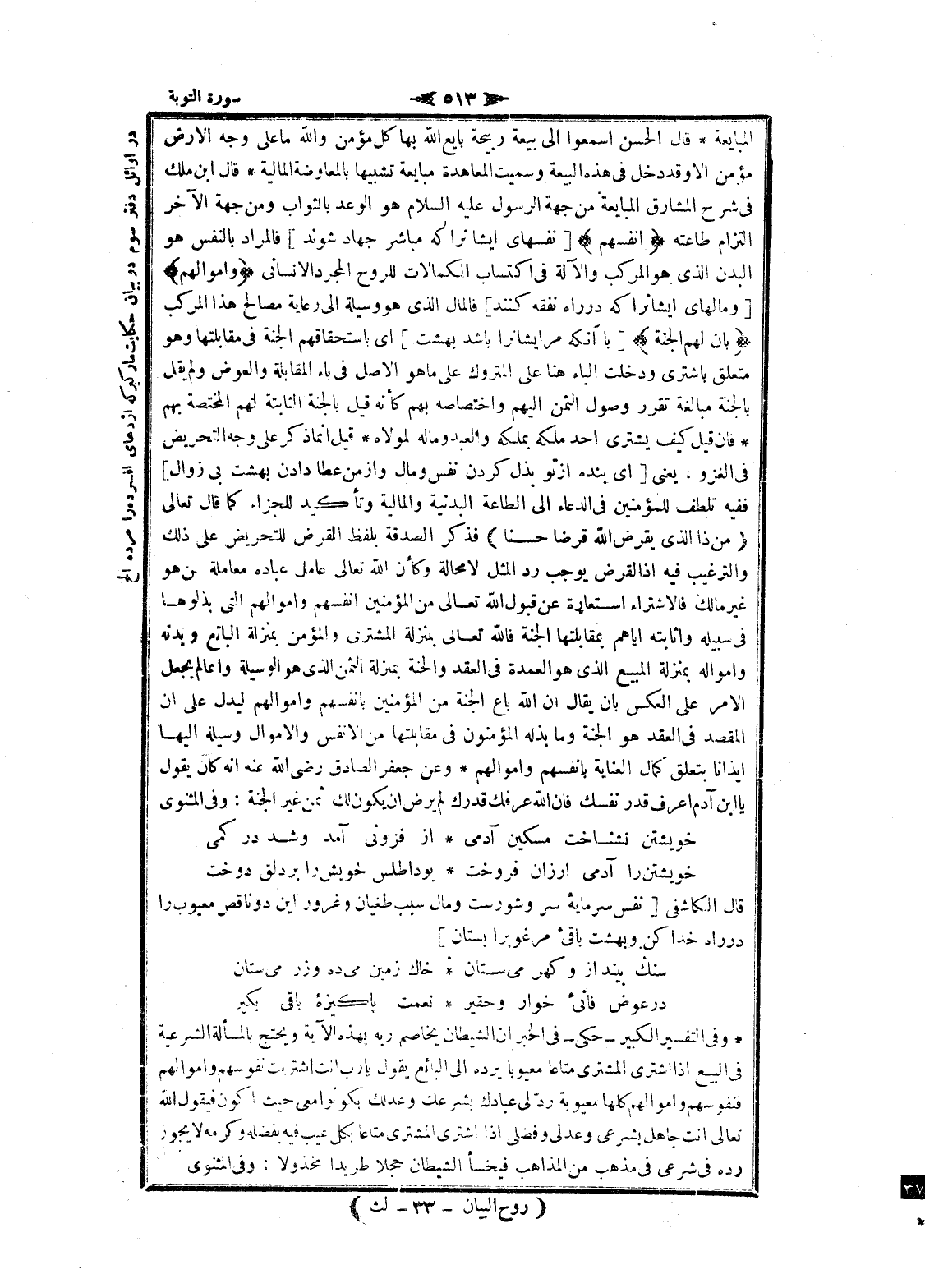 وفى التفسير الكبير- حكى- فى الخبر ان الشيطان يخاصم ربه بهذه الآية ويحتج بالمسألة الشرعية فى البيع إذا اشترى المشترى متاعا معيوبا يرده الى البائع يقول يا رب أنت اشتريت نفوسهم وأموالهم فنفوسهم وأموالهم كلها معيوبة ردّ لى عبادك بشرعك وعدلك يكونوا معى حيث أكون فيقول الله تعالى أنت جاهل بشرعى وعدلى وفضلى إذا اشترى المشترى متاعا بكل عيب فيه بفضله وكرمه لا يجوز رده فى شرعى فى مذهب من المذاهب فيخسأ الشيطان حجلا طريدا مخذولا: وفى المثنوى