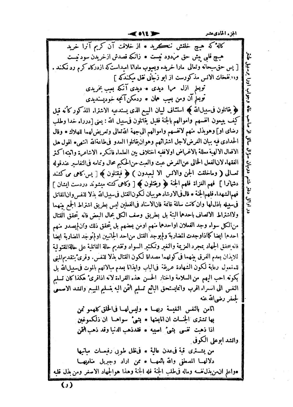 يُقاتِلُونَ فِي سَبِيلِ اللَّهِ استئناف لبيان البيع الذي يستدعيه الاشتراء المذكور كأنه قيل كيف يبيعون أنفسهم وأموالهم بالجنة فقيل يقاتلون فى سبيل الله: يعنى [در راه خدا وطلب رضاى او] وهو بذل منهم لانفسهم وأموالهم الى جهة الله تعالى وتعريض لهما للهلاك. وقال الحدادي فيه بيان الغرض لاجل اشترائهم وهو ان يقاتلوا العدو فى طاعة الله انتهى. أقول هل الافعال الالهية معللة بالأغراض او لا ففيه اختلاف بين العلماء فانكره الاشاعرة وأثبته اكثر الفقهاء لان الفعل الخالي عن الغرض عبث والعبث من الحكيم محال وتمامه فى التفاسير عند قوله تعالى وَما خَلَقْتُ الْجِنَّ وَالْإِنْسَ إِلَّا لِيَعْبُدُونِ فَيَقْتُلُونَ [پس گاهى مى كشند دشمنانرا] فهم الغزاة فلهم الجنة وَيُقْتَلُونَ [وگاهى كشته ميشوند در دست ايشان] فهم الشهداء فلهم الجنة. قال فى الإرشاد هو بيان لكون القتل فى سبيل الله بذلا للنفس وان المقاتل فى سبيله باذل لها وان كانت سالمة غانمة فان الاسناد فى الفعلين ليس بطريق اشتراط الجمع بينهما ولا اشتراط الانصاف بأحدهما البتة بل بطريق وصف الكل بحال البعض فانه يتحقق القتال من الكل سواء وجد الفعلان او أحدهما منهم او من بعضهم بل يتحقق ذلك وان لم يصدر منهم أحدهما ايضا كما إذا وجدت المضاربة ولم يوجد القتل من أحد الجانبين او لم توجد المضاربة ايضا فانه يتحقق الجهاد بمجرد العزيمة والنفير وتكثير السواد وتقديم حالة القاتلية على حالة المقتولية للايذان بعدم الفرق بينهما فى كونهما مصداقا لكون القتال بذلا للنفس. وقرئ بتقديم المبنى للمفعول رعاية لكون الشهادة عريقة فى الباب وإيذانا بعدم مبالاتهم بالموت فى سبيل الله بل بكونه أحب إليهم من السلامة واختار الحسن هذه القراءة لانه إذا قرئ هكذا كان تسليم النفس الى أسراء اقرب وانما يستحق البائع تسليم الثمن اليه بتسليم المبيع وانشد الأصمعي لجعفر رضى الله عنه