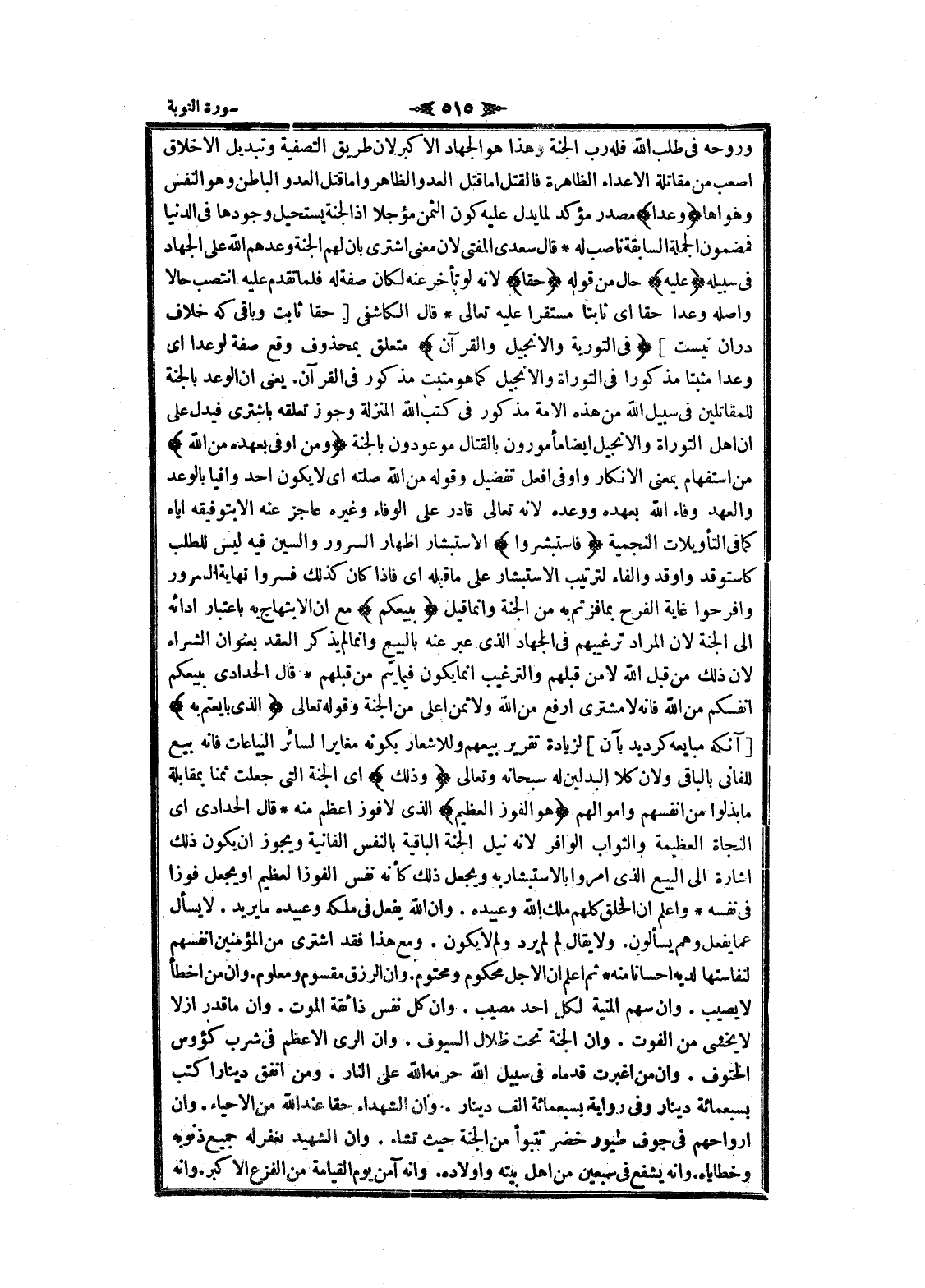 وروحه فى طلب الله فله رب الجنة وهذا هو الجهاد الأكبر لان طريق التصفية وتبديل الأخلاق أصعب من مقاتلة الأعداء الظاهرة فالقتل اما قتل العدو الظاهر واما قتل العدو الباطن وهو النفس وهواها وَعْداً مصدر مؤكد لما يدل عليه كون الثمن مؤجلا إذ الجنة يستحيل وجودها فى الدنيا فمضمون الجملة السابقة ناصب له. قال سعدى المفتى لان معنى اشترى بان لهم الجنة وعدهم الله على الجهاد فى سبيله عَلَيْهِ حال من قوله حَقًّا لانه لو تأخر عنه لكان صفة له فلما تقدم عليه انتصب حالا وأصله وعدا حقا اى ثابتا مستقرا عليه تعالى. قال الكاشفى [حقا ثابت وباقى كه خلاف در ان نيست] فِي التَّوْراةِ وَالْإِنْجِيلِ وَالْقُرْآنِ متعلق بمحذوف وقع صفة لوعدا اى وعدا مثبتا مذكورا فى التوراة والإنجيل كما هو مثبت مذكور فى القرآن. يعنى ان الوعد بالجنة للمقاتلين فى سبيل الله من هذه الامة مذكور فى كتب الله المنزلة وجوز تعلقه باشترى فيدل على ان اهل التوراة والإنجيل ايضا مأمورون بالقتال موعودون بالجنة وَمَنْ أَوْفى بِعَهْدِهِ مِنَ اللَّهِ من استفهام بمعنى الإنكار واوفى افعل تفضيل وقوله من الله صلته اى لا يكون أحد وافيا بالوعد والعهد وفاء الله بعهده ووعده لانه تعالى قادر على الوفاء وغيره عاجز عنه الا بتوفيقه إياه كما فى التأويلات النجمية فَاسْتَبْشِرُوا الاستبشار اظهار السرور والسين فيه ليس للطلب كاستوقد وأوقد والفاء لترتيب الاستبشار على ما قبله اى فاذا كان كذلك فسروا نهاية السرور وافرحوا غاية الفرح بما فزتم به من الجنة وانما قيل بِبَيْعِكُمُ مع ان الابتهاج به باعتبار ادائه الى الجنة لان المراد ترغيبهم فى الجهاد الذي عبر عنه بالبيع وانما لم يذكر العقد بعنوان الشراء لان ذلك من قبل الله لامن قبلهم والترغيب انما يكون فيما يتم من قبلهم. قال الحدادي ببيعكم أنفسكم من الله فانه لا مشترى ارفع من الله ولا ثمن أعلى من الجنة وقوله تعالى الَّذِي بايَعْتُمْ بِهِ [آنكه مبايعه كرديد بآن] لزيادة تقرير بيعهم وللاشعار بكونه مغايرا لسائر البياعات فانه بيع للفانى بالباقي ولان كلا البدلين له سبحانه وتعالى وَذلِكَ اى الجنة التي جعلت ثمنا بمقابلة ما بذلوا من أنفسهم وأموالهم هُوَ الْفَوْزُ الْعَظِيمُ الذي لا فوز أعظم منه. قال الحدادي اى النجاة العظيمة والثواب الوافر لانه نيل الجنة الباقية بالنفس الفانية ويجوز ان يكون ذلك اشارة الى البيع الذي أمروا بالاستبشار به ويجعل ذلك كأنه نفس الفوز العظيم او يجعل فوزا فى نفسه. واعلم ان الخلق كلهم ملك الله وعبيده. وان الله يفعل فى ملكه وعبيده ما يريد. لا يسأل عما يفعل وهم يسألون. ولا يقال لم لم يرد ولم لا يكون. ومع هذا فقد اشترى من المؤمنين أنفسهم لنفاستها لديه إحسانا منه. ثم اعلم ان الاجل محكوم ومحتوم. وان الرزق مقسوم ومعلوم. وان من اخطأ لا يصيب. وان سهم المنية لكل أحد مصيب. وان كل نفس ذائقة الموت. وان ما قدر ازلا لا يخشى من الفوت. وان الجنة تحت ظلال السيوف. وان الري الأعظم فى شرب كؤوس الحتوف. وان من اغبرت قد ماه فى سبيل الله حرمه الله على النار. ومن أنفق دينارا كتب بسبعمائة دينار وفى رواية بسبعمائة الف دينار. وان الشهداء حقا عند الله من الاحياء. وان أرواحهم فى جوف طيور خضر تتبوأ من الجنة حيث تشاء. وان الشهيد يغفر له جميع ذنوبه وخطاياه. وانه يشفع فى سبعين من اهل بيته وأولاده. وانه آمن يوم القيامة من الفزع الأكبر. وانه