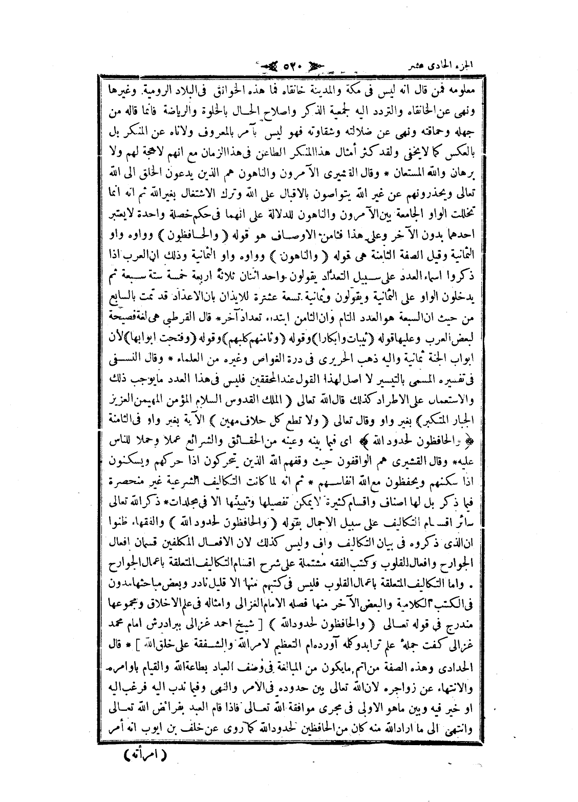واو فى الثامنة وَالْحافِظُونَ لِحُدُودِ اللَّهِ اى فيما بينه وعينه من الحقائق والشرائع عملا وحملا للناس عليه وقال القشيري هم الواقفون حيث وقفهم الله الذين يتحركون إذا حركهم ويسكنون إذا سكنهم ويحفظون مع الله أنفاسهم ثم انه لما كانت التكاليف الشرعية غير منحصرة فيما ذكر بل لها اصناف واقسام كثيرة لا يمكن تفصيلها وتبيينها الا فى مجلدات ذكر الله تعالى سائر اقسام التكاليف على سبيل الإجمال بقوله وَالْحافِظُونَ لِحُدُودِ اللَّهِ والفقهاء ظنوا ان الذي ذكروه فى بيان التكاليف واف وليس كذلك لان الافعال المكلفين قسمان افعال الجوارح وافعال القلوب وكتب الفقه مشتملة على شرح اقسام التكاليف المتعلقة باعمال الجوارح. واما التكاليف المتعلقة باعمال القلوب فليس فى كتبهم منها الا قليل نادر وبعض مباحثها مدون فى الكتب الكلامية والبعض الآخر منها فصله الامام الغزالي وأمثاله فى علم الأخلاق ومجموعها مندرج فى قوله تعالى وَالْحافِظُونَ لِحُدُودِ اللَّهِ [شيخ احمد غزالى ببرادرش امام محمد غزالى گفت جمله علم ترا بدو كلمه آورده ام التعظيم لامر الله والشفقة على خلق الله] قال الحدادي وهذه الصفة من أتم ما يكون من المبالغة فى وصف العباد بطاعة الله والقيام باوامره والانتهاء عن زواجره لان الله تعالى بين حدوده فى الأمر والنهى وفيما ندب اليه فرغب اليه او خير فيه وبين ما هو الاولى فى مجرى موافقة الله تعالى فاذا قام العبد بفرائض الله تعالى وانتهى الى ما أراد الله منه كان من الحافظين لحدود الله كما روى عن خلف بن أيوب انه أمر