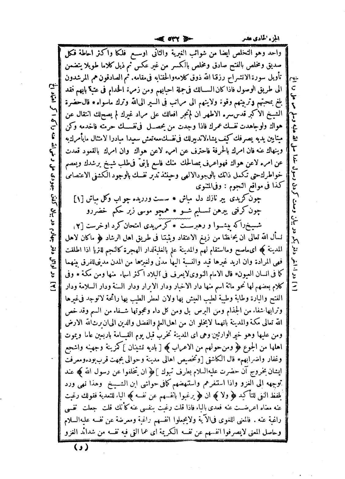 واحد وهو التخلص ايضا من شوائب الغيرية والثاني أوسع فلكا واكثر احاطة فكل صديق ومخلص بالفتح صادق ومخلص بالكسر من غير عكس ثم ذيل كلاما طويلا يتضمن تأويل سورة الانشراح رزقنا الله ذوق كلامه وألحقنا به فى مقامه. ثم الصادقون هم المرشدون الى طريق الوصول فاذا كان السالك فى جملة احبابهم ومن زمرة الخدام فى عتبة بابهم فقد بلغ بمحبتهم وتربيتهم وقوة ولايتهم الى مراتب فى السير الى الله وترك ما سواه قال حضرة الشيخ الأكبر قدس سره الأطهر ان لم تجر افعالك على مراد غيرك لم يصح لك انتقال عن هواك ولو جاهدت نفسك عمرك فاذا وجدت من يحصل فى نفسك حرمته فاخدمه وكن ميتابين يديه يصرفك كيف يشاء لا تدبير لك فى نفسك معه تعش سعيدا مبادرا لامتثال ما يأمرك به وينهاك عنه فان أمرك بالحرفة فاحترف عن امره لاعن هواك وان أمرك بالقعود قعدت عن امره لا عن هواك فهو اعرف بمصالحك منك فاسع يا بنىّ فى طلب شيخ يرشدك ويعصم خواطرك حتى تكمل ذاتك بالوجود الإلهي وحينئذ تدبر نفسك بالوجود الكشفى الاعتصامى كذا فى مواقع النجوم: وفى المثنوى