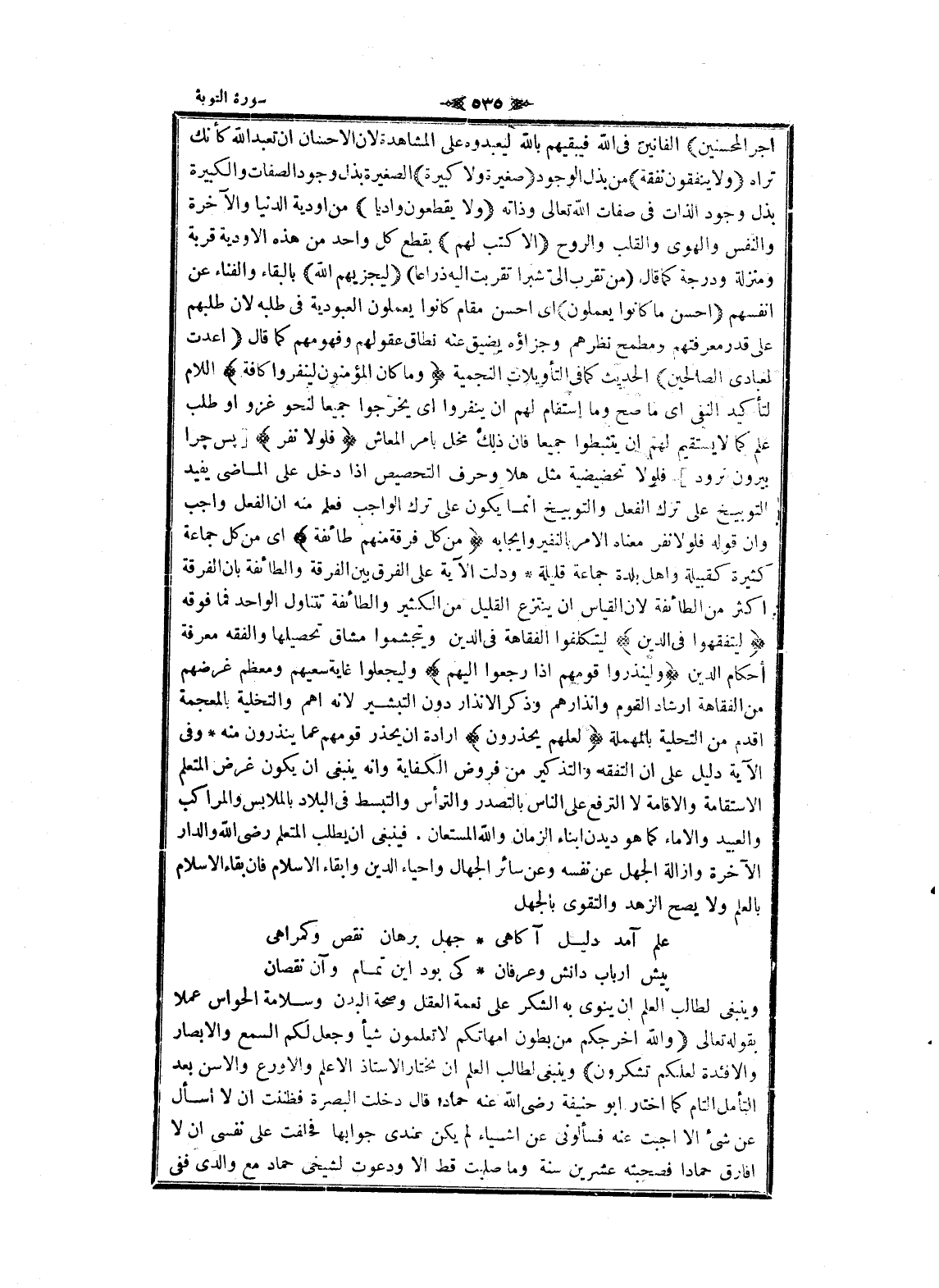 الفانين فى الله فيبقيهم بالله ليعبدوه على المشاهدة لان الإحسان ان تعبد الله كأنك تراه وَلا يُنْفِقُونَ نَفَقَةً من بذل الوجود صَغِيرَةً وَلا كَبِيرَةً الصغيرة بذل وجود الصفات والكبيرة بذل وجود الذات فى صفات الله تعالى وذاته وَلا يَقْطَعُونَ وادِياً من اودية الدنيا والآخرة والنفس والهوى والقلب والروح إِلَّا كُتِبَ لَهُمْ بقطع كل واحد من هذه الاودية قربة ومنزلة ودرجة كما قال (من تقرب الىّ شبرا تقربت اليه ذراعا) لِيَجْزِيَهُمُ اللَّهُ بالبقاء والفناء عن أنفسهم أَحْسَنَ ما كانُوا يَعْمَلُونَ اى احسن مقام كانوا يعملون العبودية فى طلبه لان طلبهم على قدر معرفتهم ومطمح نظرهم وجزاؤه يضيق عنه نطاق عقولهم وفهو مهم كما قال اعدت لعبادى الصالحين الحديث كما فى التأويلات النجمية وَما كانَ الْمُؤْمِنُونَ لِيَنْفِرُوا كَافَّةً اللام لتأكيد النفي اى ما صح وما استقام لهم ان ينفروا اى يخرجوا جميعا لنحو غزو او طلب علم كما لا يستقيم لهم ان يتثبطوا جميعا فان ذلك مخل بامر المعاش فَلَوْلا نَفَرَ [پس چرا بيرون نرود] فلولا تحضيضية مثل هلا وحرف التحضيض إذا دخل على الماضي يفيد التوبيخ على ترك الفعل والتوبيخ انما يكون على ترك الواجب فعلم منه ان الفعل واجب وان قوله فلولا نفر معناه الأمر بالنفير وإيجابه مِنْ كُلِّ فِرْقَةٍ مِنْهُمْ طائِفَةٌ اى من كل جماعة كثيرة كقبيلة واهل بلدة جماعة قليلة ودلت الآية على الفرق بين الفرقة والطائفة بان الفرقة اكثر من الطائفة لان القياس ان ينتزع القليل من الكثير والطائفة تتناول الواحد فما فوقه لِيَتَفَقَّهُوا فِي الدِّينِ ليتكلفوا الفقاهة فى الدين ويتجشموا مشاق تحصيلها والفقه معرفة أحكام الدين وَلِيُنْذِرُوا قَوْمَهُمْ إِذا رَجَعُوا إِلَيْهِمْ وليجعلوا غاية سعيهم ومعظم غرضهم من الفقاهة ارشاد القوم وإنذارهم وذكر الانذار دون التبشير لانه أهم والتخلية بالمعجمة اقدم من التحلية بالمهملة لَعَلَّهُمْ يَحْذَرُونَ ارادة ان يحذر قومهم عما ينذرون منه وفى الآية دليل على ان التفقه والتذكير من فروض الكفاية وانه ينبغى ان يكون غرض المتعلم الاستقامة والاقامة لا الترفع على الناس بالتصدر والترؤس والتبسط فى البلاد بالملابس والمراكب والعبيد والإماء كما هو ديدن أبناء الزمان والله المستعان. فينبغى ان يطلب المتعلم رضى الله والدار الآخرة وازالة الجهل عن نفسه وعن سائر الجهال واحياء الدين وابقاء الإسلام فان بقاء الإسلام بالعلم ولا يصح الزهد والتقوى بالجهل