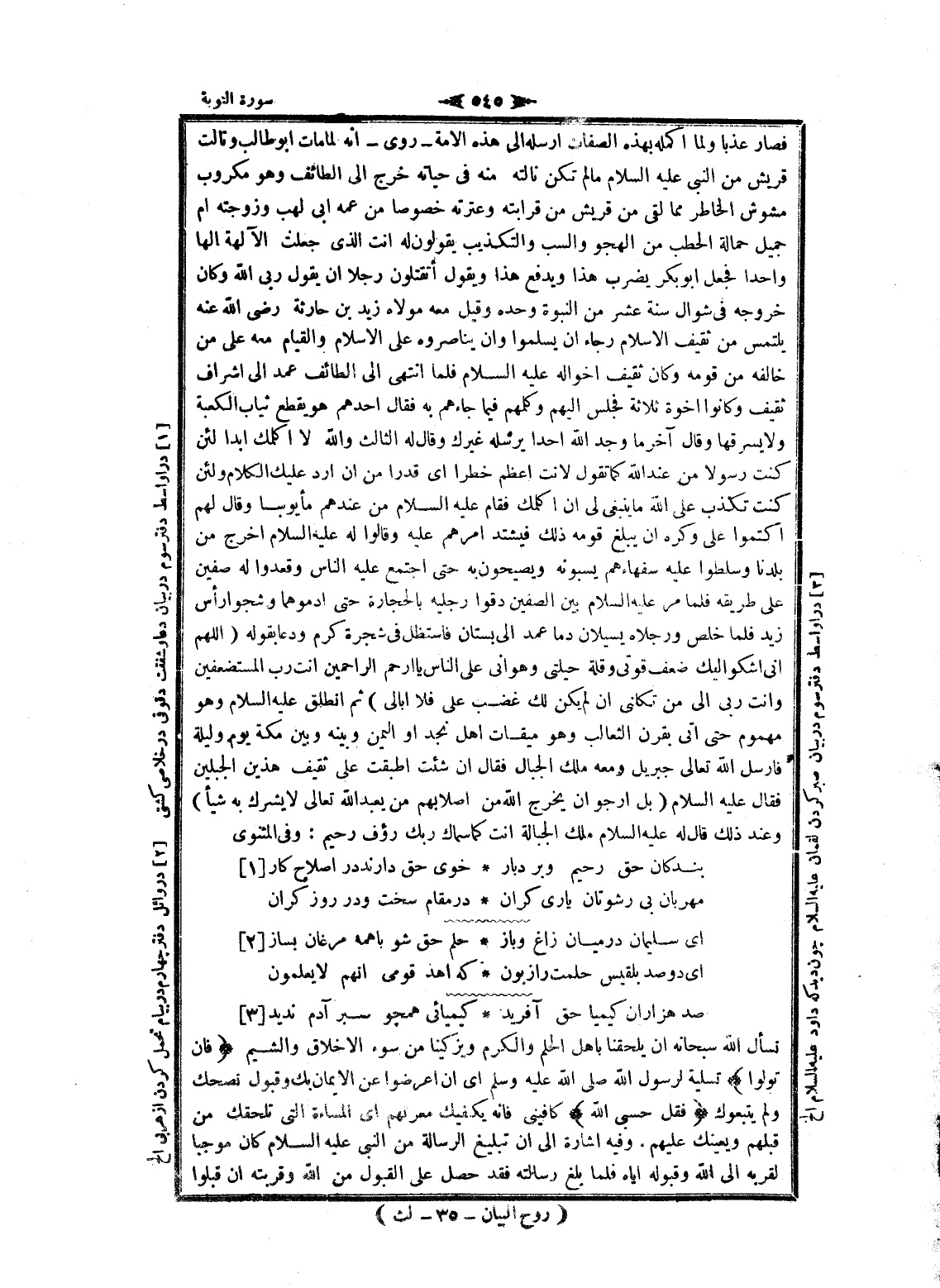 فصار عذبا ولما أكمله بهذه الصفات أرسله الى هذه الامة- روى- انه لما مات ابو طالب ونالت قريش من النبي عليه السلام ما لم تكن نالته منه فى حياته خرج الى الطائف وهو مكروب مشوش الخاطر مما لقى من قريش من قرابته وعترته خصوصا من عمه ابى لهب وزوجته أم جميل حمالة الحطب من الهجو والسب والتكذيب يقولون له أنت الذي جعلت الآلهة الها واحدا فجعل أبو بكر يضرب هذا ويدفع هذا ويقول أتقتلون رجلا ان يقول ربى الله وكان خروجه فى شوال سنة عشر من النبوة وحده وقيل معه مولاه زيد بن حارثة رضى الله عنه يلتمس من ثقيف الإسلام رجاء ان يسلموا وان يناصروه على الإسلام والقيام معه على من خالفه من قومه وكان ثقيف أخواله عليه السلام فلما انتهى الى الطائف عمد الى اشراف ثقيف وكانوا اخوة ثلاثة فجلس إليهم وكلمهم فيما جاءهم به فقال أحدهم هو يقطع ثياب الكعبة ولا يسرقها وقال آخر ما وجد الله أحدا يرسله غيرك وقال له الثالث والله لا أكلمك ابدا لئن كنت رسولا من عند الله كما تقول لانت أعظم خطرا اى قدرا من ان أرد عليك الكلام ولئن كنت تكذب على الله ما ينبغى لى ان أكلمك فقام عليه السلام من عندهم مأيوسا وقال لهم اكتموا على وكره ان يبلغ قومه ذلك فيشتد أمرهم عليه وقالوا له عليه السلام اخرج من بلدنا وسلطوا عليه سفهاءهم يسبونه ويصيحون به حتى اجتمع عليه الناس وقعدوا له صفين على طريقه فلما مر عليه السلام بين الصفين دقوا رجليه بالحجارة حتى ادموهما وشجوا رأس زيد فلما خلص ورجلاه يسيلان دما عمد الى بستان فاستظل فى شجرة كرم ودعا بقوله (اللهم انى أشكو إليك ضعف قوتى وقلة حيلتى وهوانى على الناس يا ارحم الراحمين أنت رب المستضعفين وأنت ربى الى من تكلنى ان لم يكن لك غضب على فلا أبالي) ثم انطلق عليه السلام وهو مهموم حتى اتى بقرن الثعالب وهو ميقات اهل نجد او اليمن وبينه وبين مكة يوم وليلة فارسل الله تعالى جبريل ومعه ملك الجبال فقال ان شئت أطبقت على ثقيف هذين الجبلين فقال عليه السلام (بل ارجوا ان يخرج الله من أصلابهم من يعبد الله تعالى لا يشرك به شيأ) وعند ذلك قال له عليه السلام ملك الجبالة أنت كما سماك ربك رؤف رحيم: وفى المثنوى