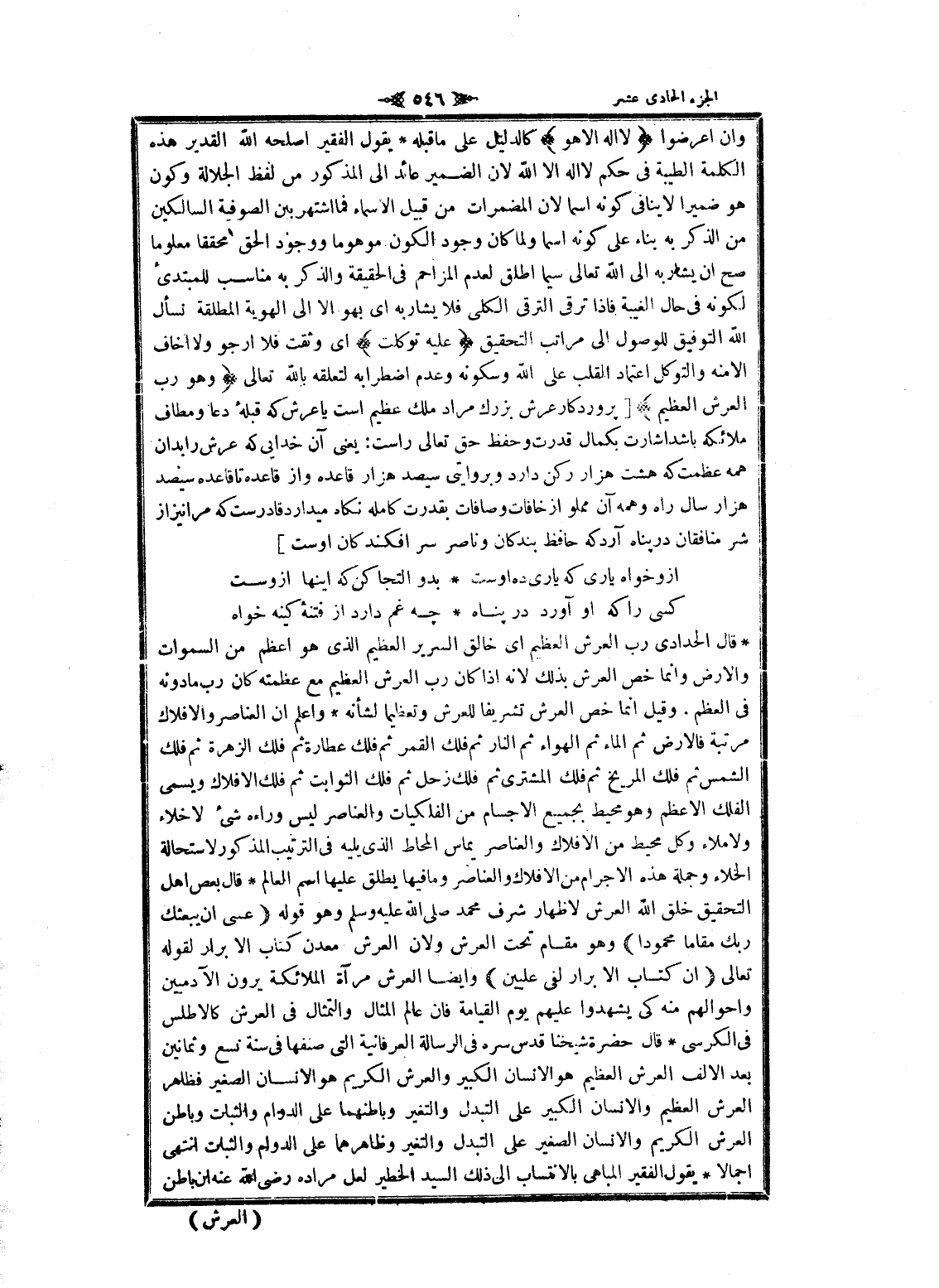 قال الحدادي رب العرش العظيم اى خالق السرير العظيم الذي هو أعظم من السموات والأرض وانما خص العرش بذلك لانه إذا كان رب العرش العظيم مع عظمته كان رب ما دونه فى العظم. وقيل انما خص العرش تشريفا للعرش وتعظيما لشأنه واعلم ان العناصر والافلاك مرتبة فالارض ثم الماء ثم الهواء ثم النار ثم فلك القمر ثم فلك عطارة ثم فلك الزهرة ثم فلك الشمس ثم فلك المريخ ثم فلك المشترى ثم فلك زحل ثم فلك الثوابت ثم فلك الافلاك ويسمى الفلك الأعظم وهو محيط بجميع الأجسام من الفلكيات والعناصر ليس وراءه شىء لاخلاء ولا ملاء وكل محيط من الافلاك والعناصر يماس المحاط الذي يليه فى الترتيب المذكور لاستحالة الخلاء وجملة هذه الاجرام من الافلاك والعناصر وما فيها يطلق عليها اسم العالم قال بعض اهل التحقيق خلق الله العرش لاظهار شرف محمد صلى الله عليه وسلم وهو قوله عَسى أَنْ يَبْعَثَكَ رَبُّكَ مَقاماً مَحْمُوداً وهو مقام تحت العرش ولان العرش معدن كتاب الأبرار لقوله تعالى إِنَّ كِتابَ الْأَبْرارِ لَفِي عِلِّيِّينَ وايضا العرش مرآة الملائكة يرون الآدميين وأحوالهم منه كى يشهدوا عليهم يوم القيامة فان عالم المثال والتمثال فى العرش كالاطلس فى الكرسي قال حضرة شيخنا قدس سره فى الرسالة العرفانية التي صنفها فى سنة تسع وثمانين بعد الالف العرش العظيم هو الإنسان الكبير والعرش الكريم هو الإنسان الصغير فظاهر العرش العظيم والإنسان الكبير على التبدل والتغير وباطنهما على الدوام والثبات وباطن العرش الكريم والإنسان الصغير على التبدل والتغير وظاهرهما على الدوام والثبات انتهى اجمالا يقول الفقير المباهي بالانتساب الى ذلك السيد الخطير لعل مراده رضى الله عنه ان باطن