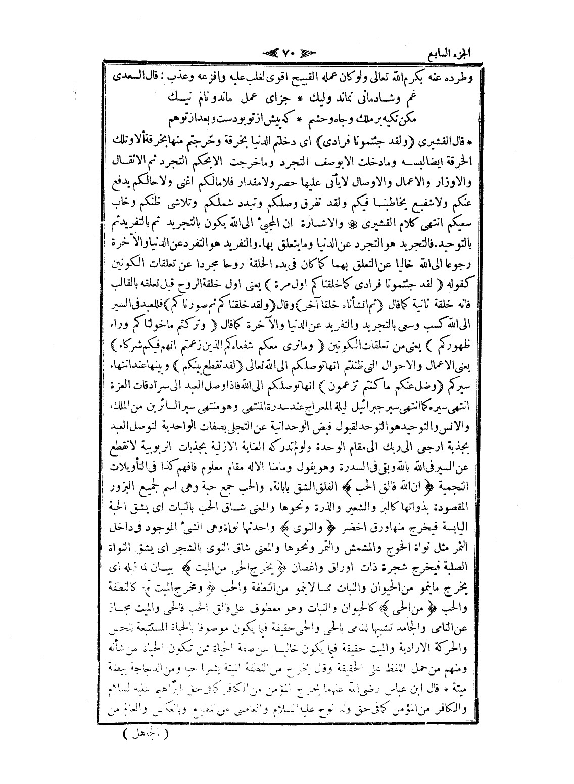 قال القشيري وَلَقَدْ جِئْتُمُونا فُرادى اى دخلتم الدنيا بخرقة وخرجتم منها بخرقة ألا وتلك الخرقة ايضا لبسه وما دخلت الا بوصف التجرد وما خرجت الا بحكم التجرد ثم الأثقال والأوزار والأعمال والأوصال لا يأتى عليها حصر ولا مقدار فلا مالكم اغنى ولا حالكم يدفع عنكم ولا شفيع يخاطبنا فيكم ولقد تفرق وصلكم وتبدد شملكم وتلاشى ظنكم وخاب سعيكم انتهى كلام القشيري والاشارة ان المجيء الى الله يكون بالتجرد ثم بالتفريد ثم بالتوحيد فالتجريد هو التجرد عن الدنيا وما يتعلق يها. والتفريد هو التفرد عن الدنيا والآخرة رجوعا الى الله خاليا عن التعلق بهما كما كان فى بدء الخلقة روحا مجردا عن تعلقات الكونين كقوله لَقَدْ جِئْتُمُونا فُرادى كَما خَلَقْناكُمْ أَوَّلَ مَرَّةٍ يعنى أول خلقة الروح قبل تعلقه بالقالب فانه خلقة ثانية كما قال ثُمَّ أَنْشَأْناهُ خَلْقاً آخَرَ وقال وَلَقَدْ خَلَقْناكُمْ ثُمَّ صَوَّرْناكُمْ فللعبد فى السير الى الله كسب وسعى بالتجريد والتفريد عن الدنيا والآخرة كما قال وَتَرَكْتُمْ ما خَوَّلْناكُمْ وَراءَ ظُهُورِكُمْ يعنى من تعلقات الكونين وَما نَرى مَعَكُمْ شُفَعاءَكُمُ الَّذِينَ زَعَمْتُمْ أَنَّهُمْ فِيكُمْ شُرَكاءُ يعنى الأعمال والأحوال التي ظننتم انها توصلكم الى الله تعالى لَقَدْ تَقَطَّعَ بَيْنَكُمْ وبينها عند انتهاء سيركم وَضَلَّ عَنْكُمْ ما كُنْتُمْ تَزْعُمُونَ انها توصلكم الى الله فاذا وصل العبد الى سرادقات العزة انتهى سيره كما انتهى سير جبرائيل ليلة المعراج عند سدرة المنتهى وهو منتهى سير السائرين من الملك والانس والتوحيد هو التوحد لقبول فيض الوحدانية عن التجلي بصفات الواحدية لتوصل العبد بجذبة ارجعي الى ربك الى مقام الوحدة ولو لم تدركه العناية الازلية بجذبات الربوبية لا نقطع عن السير فى الله بالله وبقي فى السدرة وهو يقول وما منا الا له مقام معلوم فافهم كذا فى التأويلات النجمية إِنَّ اللَّهَ فالِقُ الْحَبِّ الفلق الشق بابانة. والحب جمع حبة وهى اسم لجميع البزور المقصودة بذواتها كالبر والشعير والذرة ونحوها والمعنى شاق الحب بالنبات اى يشق الحبة اليابسة فيخرج منها ورق اخضر وَالنَّوى واحدتها نواة وهى الشيء الموجود فى داخل الثمر مثل نواة الخوج والمشمش والتمر ونحوها والمعنى شاق النوى بالشجر اى يشق النواة الصلبة فيخرج شجرة ذات أوراق وأغصان يُخْرِجُ الْحَيَّ مِنَ الْمَيِّتِ بيان لما قبله اى يخرج ما ينمو من الحيوان والنبات مما لا ينمو من النطفة والحب وَمُخْرِجُ الْمَيِّتِ كالنطفة والحب مِنَ الْحَيِّ كالحيوان والنبات وهو معطوف على فالق الحب فالحى والميت مجاز عن النامي والجامد تشبيها للنامى بالحي والحي حقيقة فيما يكون موصوفا بالحياة المستتبعة للحس والحركة الارادية والميت حقيقة فيما يكون خاليا عن صفة الحياة ممن تكون الحياة من شأنه ومنهم من حمل اللفظ على الحقيقة وقال يخرج من النطفة الميتة بشرا حيا ومن الدجاجة بيضة ميتة قال ابن عباس رضى الله عنهما يخرج المؤمن من الكافر كما فى حق ابراهيم عليه السلام والكافر من المؤمن كما فى حق ولد نوح عليه السلام والعاصي من المطيع وبالعكس والعالم من