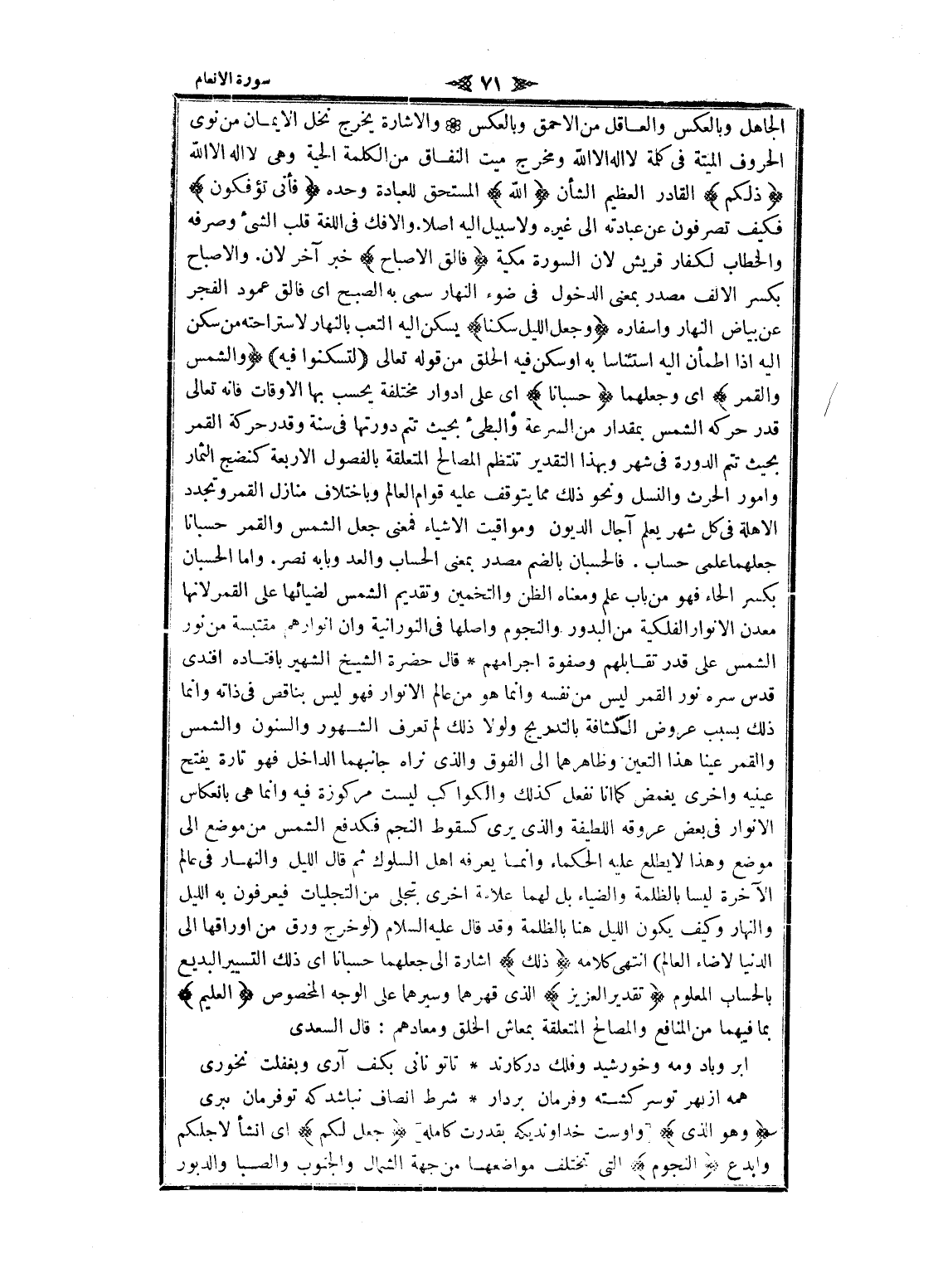 الجاهل وبالعكس والعاقل من الأحمق وبالعكس والاشارة يخرج نخل الايمان من نوى الحروف الميتة فى كلمة الا اله الا الله ومخرج ميت النفاق من الكلمة الحية وهى لا اله الا الله ذلِكُمُ القادر العظيم الشأن اللَّهَ المستحق للعبادة وحده فَأَنَّى تُؤْفَكُونَ فكيف تصرفون عن عبادته الى غيره ولا سبيل اليه أصلا. والافك فى اللغة قلب الشيء وصرفه والخطاب لكفار قريش لان السورة مكية فالِقُ الْإِصْباحِ خبر آخر لان. والإصباح بكسر الالف مصدر بمعنى الدخول فى ضوء النهار سمى به الصبح اى فالق عمود الفجر عن بياض النهار وأسفاره وَجَعَلَ اللَّيْلَ سَكَناً يسكن اليه التعب بالنهار لاستراحته من سكن اليه إذا اطمأن اليه استئناسا به او سكن فيه الخلق من قوله تعالى لِتَسْكُنُوا فِيهِ وَالشَّمْسَ وَالْقَمَرَ اى وجعلهما حُسْباناً اى على أدوار مختلفة يحسب بها الأوقات فانه تعالى قدر حركه الشمس بمقدار من السرعة والبطيء بحيث تتم دورتها فى سنة وقدر حركة القمر بحيث تتم الدورة فى شهر وبهذا التقدير تنتظم المصالح المتعلقة بالفصول الاربعة كنضج الثمار وامور الحرث والنسل ونحو ذلك مما يتوقف عليه قوام العالم وباختلاف منازل القمر وتجدد الاهلة فى كل شهر يعلم آجال الديون ومواقيت الأشياء فمعنى جعل الشمس والقمر حسبانا جعلهما علمى حساب. فالحسبان بالضم مصدر بمعنى الحساب والعد وبابه نصر. واما الحسبان بكسر الحاء فهو من باب علم ومعناه الظن والتخمين وتقدم الشمس لضيائها على القمر لانها معدن الأنوار الفلكية من البدور والنجوم وأصلها فى النورانية وان أنوارهم مقتبسة من نور الشمس على قدر تقابلهم وصفوة اجرامهم قال حضرة الشيخ الشهير بافتاده افندى قدس سره نور القمر ليس من نفسه وانما هو من عالم الأنوار فهو ليس بناقص فى ذاته وانما ذلك بسبب عروض الكشافة بالتدريج ولولا ذلك لم تعرف الشهور والسنون والشمس والقمر عينا هذا التعين وظاهرهما الى الفوق والذي نراه جانبهما الداخل فهو تارة يفتح عينيه واخرى يغمض كما انا نفعل كذلك والكواكب ليست مركوزة فيه وانما هى بانعكاس الأنوار فى بعض عروقه اللطيفة والذي يرى كسقوط النجم فكدفع الشمس من موضع الى موضع وهذا لا يطلع عليه الحكماء وانما يعرفه اهل السلوك ثم قال الليل والنهار فى عالم الآخرة ليسا بالظلمة والضياء بل لهما علامة اخرى بتجلى من التجليات فيعرفون به الليل والنهار وكيف يكون الليل هنا بالظلمة وقد قال عليه السلام (لو خرج ورق من أوراقها الى الدنيا لاضاء العالم) انتهى كلامه ذلِكَ اشارة الى جعلهما حسبانا اى ذلك التسيير البديع بالحساب المعلوم تَقْدِيرُ الْعَزِيزِ الذي قهرهما وسيرهما على الوجه المخصوص الْعَلِيمِ بما فيهما من المنافع والمصالح المتعلقة بمعاش الخلق ومعادهم: قال السعدي
