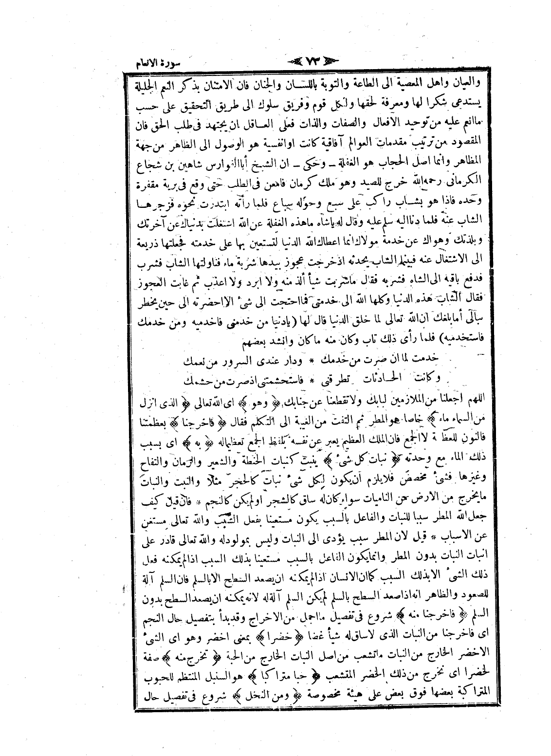 والعيان واهل المعصية الى الطاعة والتوبة باللسان والجنان فان الامتنان بذكر النعم الجليلة يستدعى شكرا لها ومعرفة لحقها ولكل قوم وفريق سلوك الى طريق التحقيق على حسب ما أنعم عليه من توحيد الافعال والصفات والذات فعلى العاقل ان يجتهد فى طلب الحق فان المقصود من ترتيب مقدمات العوالم آفاقية كانت او انفسية هو الوصول الى الظاهر من جهة المظاهر وانما اصل الحجاب هو الغفلة- وحكى- ان الشيخ أبا الفوارس شاهين بن شجاع الكرماني رحمه الله خرج للصيد وهو ملك كرمان فامعن فى الطلب حتى وقع فى برية مقفرة وحده فاذا هو بشاب راكب على سبع وحوله سباع فلما رأته ابتدرت نحوه فزجرها الشاب عنه فلما دنا اليه سلم عليه وقال له يا شاه ما هذه الغفلة عن الله اشتغلت بدنياك عن آخرتك وبلذتك وهواك عن خدمة مولاك انما اعطاك الله الدنيا لتستعين بها على خدمته فجعلتها ذريعة الى الاشتغال عنه فبينما الشاب يحدثه إذ خرجت عجوز بيدها شربة ماء فناولتها الشاب فشرب فدفع باقيه الى الشاه فشربه فقال ما شربت شيأ ألذ منه ولا أبرد ولا أعذب ثم غابت العجوز فقال الشاب هذه الدنيا وكلها الله الى خدمتى فما احتجت الى شىء الا أحضرته الى حين يخطر مبالى أما بلغك ان الله تعالى لما خلق الدنيا قال لها (يا دنيا من خدمنى فاخدميه ومن خدمك فاستخدميه) فلما رأى ذلك تاب وكان منه ما كان وانشد بعضهم