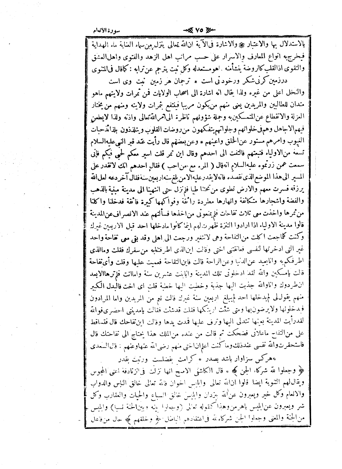 والنخل أعلى من غيره ولذا يقال انه اشارة الى اصحاب الولايات فمن ثمرات ولايتهم ما هو متدان للطالبين والمريدين يعنى منهم من يكون مريبا فينتفع بثمرات ولايته ومنهم من يختار العزلة والانقطاع عن المتمسكين به وجملة شؤونهم ناظرة الى امر الله تعالى واذنه ولذا لا يطعن فيهم الا جاهل وهم فى خلواتهم وجلواتهم يتفكهون من روضات القلوب ويتلذذون بلذائذ حبات الغيوب وأمرهم مستور عن الخلق وأعينهم وعن بعضهم قال رأيت عند قبر النبي عليه السلام تسعة من الأولياء فتبعتهم فالتفت الى أحدهم وقال اين تمر قلت أسير معكم لحبى فيكم فانى سمعت عمن زرتموه عليه السلام انه قال (المرء مع من أحب) فقال أحدهم انك لا تقدر على المسير الى هذا الموضع الذي نقصده فانه لا يقدر عليه الا من بلغ سنه أربعين سنة فقال آخر دعه لعل الله يرزقه فسرت معهم والأرض تطوى من تحتنا طيا فلم نزل حتى انتهينا الى مدينة مبنية بالذهب والفضة وأشجارها متكاثفة وأنهارها مطردة رائقة وفواكهها كبيرة فائقة فدخلنا وأكلنا من ثمرها وأخذت معى ثلاث تفاحات فلم يمنعونى من أخذها فسألتهم عند الانصراف عن المدينة قالوا مدينة الأولياء إذا أرادوا التنزه ظهرت لهم أينما كانوا ما دخلها أحد قبل الأربعين غيرك وكنت كلما جعت أكلت من التفاحة وهى لا تتغير ورجعت الى أهلي وقد بقي معى تفاحة واحد غير التي ادخرتها لنفسى فعانقتنى أختي وقالت اين الذي اطرفتنا به من سفرك فقلت وما الذي اطرفكم به وانا بعيد عن الدنيا وعن الراحة قالت فاين التفاحة فعميت عليها وقلت وأي تفاحة قالت يا مسكين والله لقد أدخلوني تلك المدينة وانا بنت عشرين سنة واما أنت فلم ترها الا بعد ان طردوك وانا والله جذبت إليها جذبة وخطبت إليها خطبة قلت اى اخت فالبدل الكبير منهم يقول لى لم يدخلها أحد لم يبلغ أربعين سنة غيرك قالت نعم من المريدين واما المرادون فيدخلونها ولا يرضون بها ومتى شئت أريتكها فقلت قد شئت فقالت يا مدينتى احضرى فو الله لقد رأيت المدينة بعينها تتدلى إليها وترف عليها فمدت يدها وقالت اين تفاحك قال فتساقط على من التفاح ما علانى فضحكت ثم قالت من عنده من الملك هذا يحتاج الى تفاحتك قال فاستحقرت والله نفسى عند ذلك وما كنت اعلم ان أختي منهم رضى الله عنها وعنهم: قال السعدي