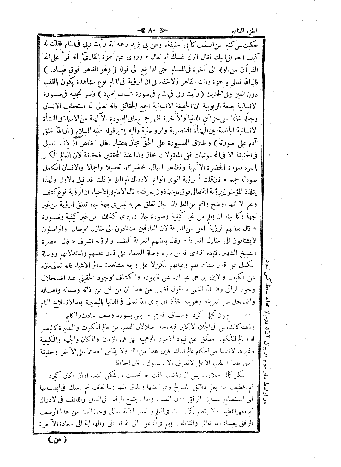 وذلك كالشمس فى الجلاء لا يكابر فيه أحد أصلا لان القلب من عالم الملكوت والبصيرة كالبصر له وعالم الملكوت مطلق عن قيود الأمور الوهمية التي هى الزمان والمكان والجهة والكيفية وغيرها لانها من احكام عالم الملك فاين هذا من ذاك ولا يقاس أحدهما على الآخر وحقيقة ذوق هذا المطلب الا على لا تعرف الا بالسلوك: قال الحافظ