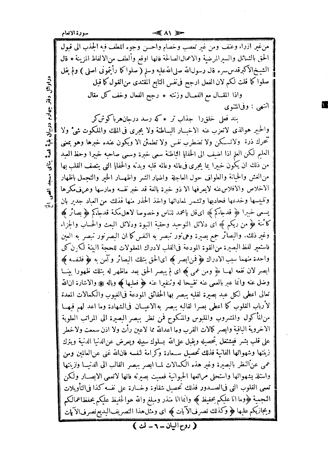 من غير إزراء وعنف ومن غير تعصب وخصام واحسن وجوه اللطف فيه الجذب الى قبول الحق بالشمائل والسير المرضية والأعمال الصالحة فانها أوقع وألطف من الألفاظ المزينة قال الشيخ الأكبر قدس سره قال رسول الله صلى الله عليه وسلم (صلوا كما رأيتمونى أصلي) ولم يقل صلوا كما قلت لكم لان الفعل أرجح فى نفس التابع المقتدى من القول كما قيل