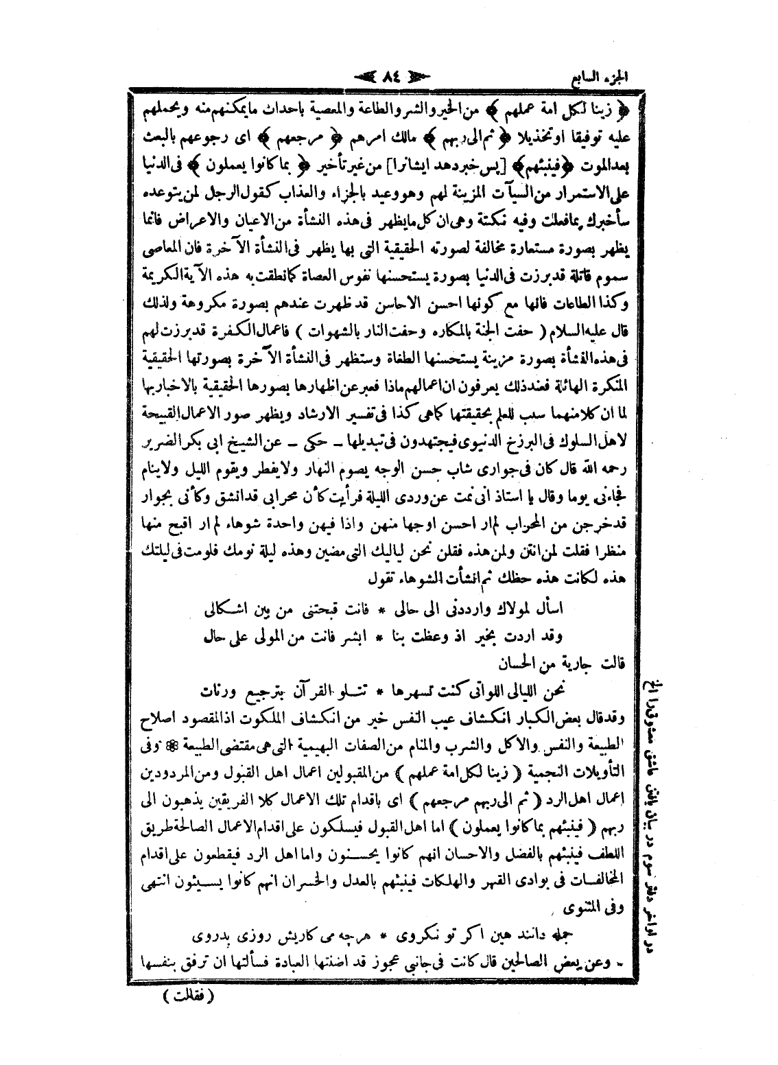 وقد قال بعض الكبار انكشاف عيب النفس خير من انكشاف الملكوت إذا المقصود إصلاح الطبيعة والنفس والاكل والشرب والمنام من الصفات البهيمية التي هى مقتضى الطبيعة وفى التأويلات النجمية زَيَّنَّا لِكُلِّ أُمَّةٍ عَمَلَهُمْ من المقبولين اعمال اهل القبول ومن المردودين اعمال اهل الرد ثُمَّ إِلى رَبِّهِمْ مَرْجِعُهُمْ اى باقدام تلك الأعمال كلا الفريقين يذهبون الى ربهم فَيُنَبِّئُهُمْ بِما كانُوا يَعْمَلُونَ اما اهل القبول فيسلكون على أقدام الأعمال الصالحة طريق اللطف فينبئهم بالفضل والإحسان انهم كانوا يحسنون واما اهل الرد فيقطعون على أقدام المخالفات فى بوادي القهر والهلكات فينبئهم بالعدل والخسران انهم كانوا يسيئون انتهى وفى المثنوى